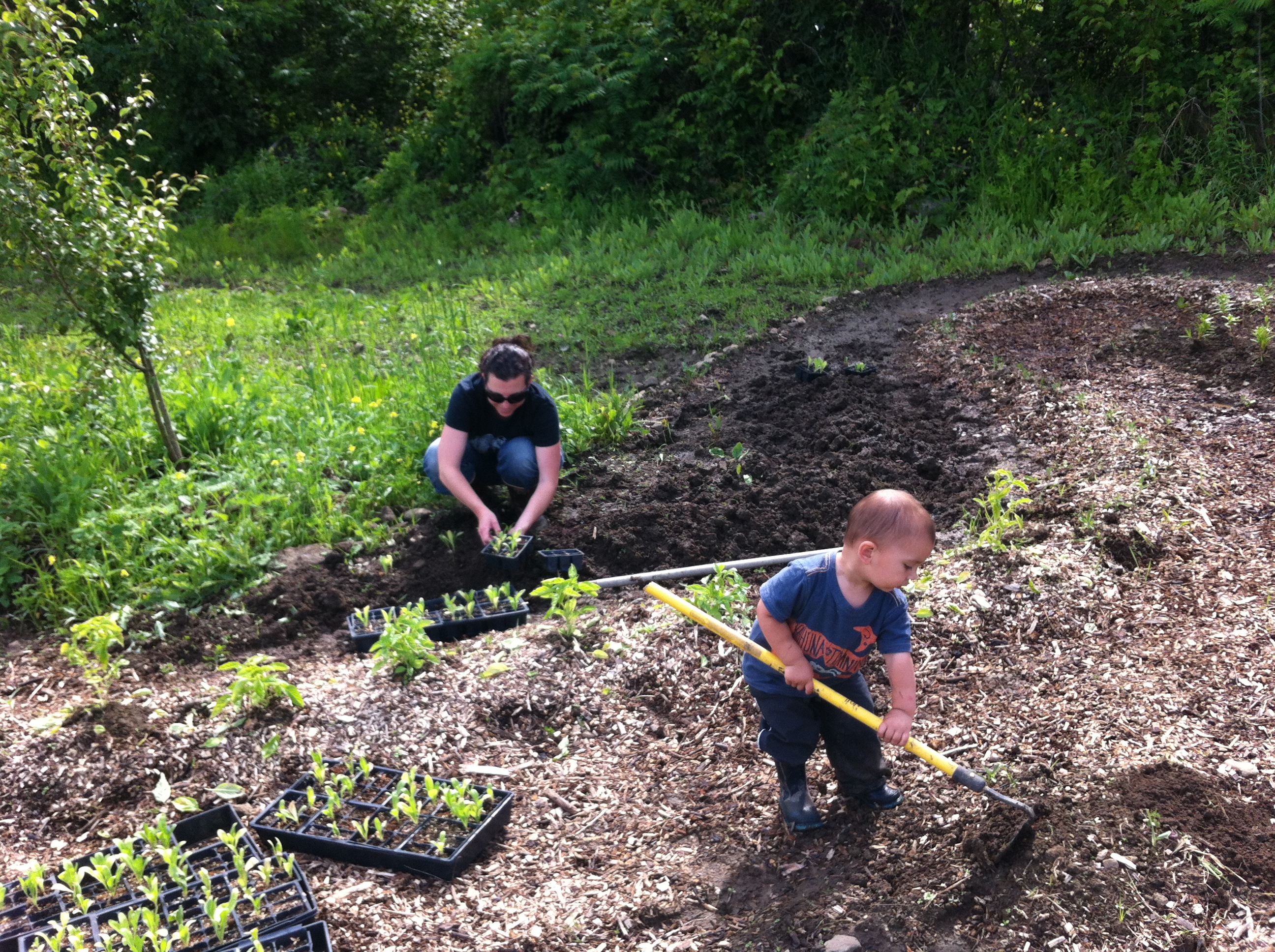 Sakoianihsaks helps Awenhniseronkion plant lettuce for the coming season, May 2014. Photo By Elizabeth Hoover