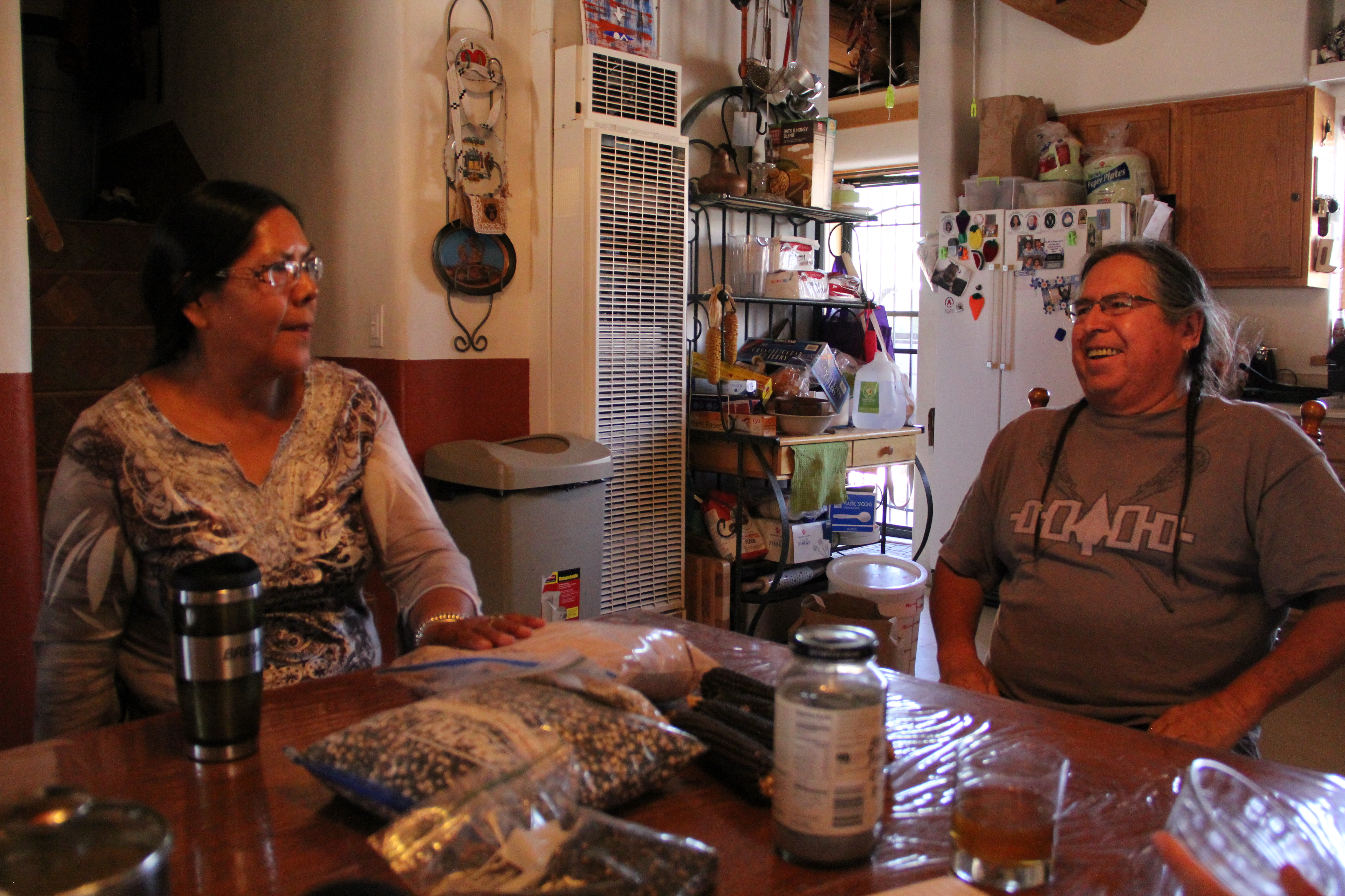 Faming in Pueblo villages is an activity mainly for men. The men plant, irrigate the fields, and do the hoeing and the weeding. The women and children come in during the harvest time–men will pick the harvest and the women and children will husk the corn. This is different from Haudenosaunee custom, in which the women were responsible for a great deal of the farming. Even with the traditional gender divide in labor, Clayton and Margaret worked together in their cornfields, and raised their four daughters to be farmers from a young age. Margaret expressed to us how concerned she was that people in the pueblo would talk, and would tell them not to break tradition by having women in the field, but they didn’t. Clayton and Margaret’s daughter Winona just recently moved back to Tesuque with her husband and infant son, so that he could have the experience of growing up in the fields like she did. She became emotional describing the contribution her parents have made to her life by farming and involving her, even though it took her until adulthood to appreciate it. As her mother Margaret expressed, “This is really important because what if we don’t have anymore grocery stores. If you know how to plant these seeds, you don’t have to depend on anyone… If you take care of the land, the land will take care of you.”