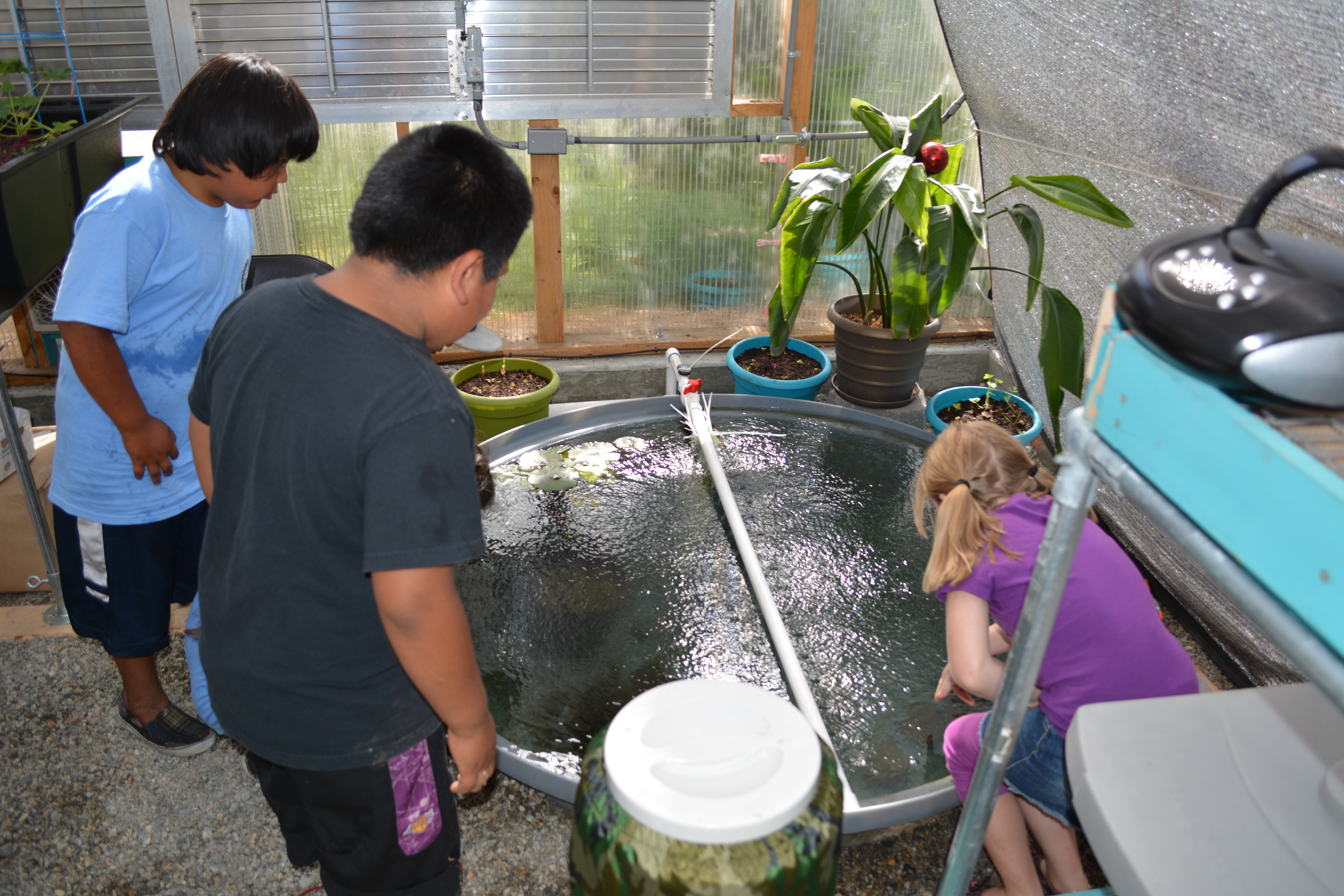 One of the main challenges in starting this new project has been getting the necessary work done while creating an environment which is safe and organized for families and elders to help with the gardening and the fish. Keith acknowledges that people like the idea of community gardens and locally grown food, but sometimes recruiting labor can be difficult for jobs like digging trenches, hauling rocks, installing irrigation systems, and pulling weeds. In planting 50 fruit trees on the site, he rented an auger to dig the holes (which would have been difficult for elders), and then had them assist with placing the trees into the holes. But the aquaponics project, only in its first year, has proven to be popular with the community as an efficient and interesting means of producing food.