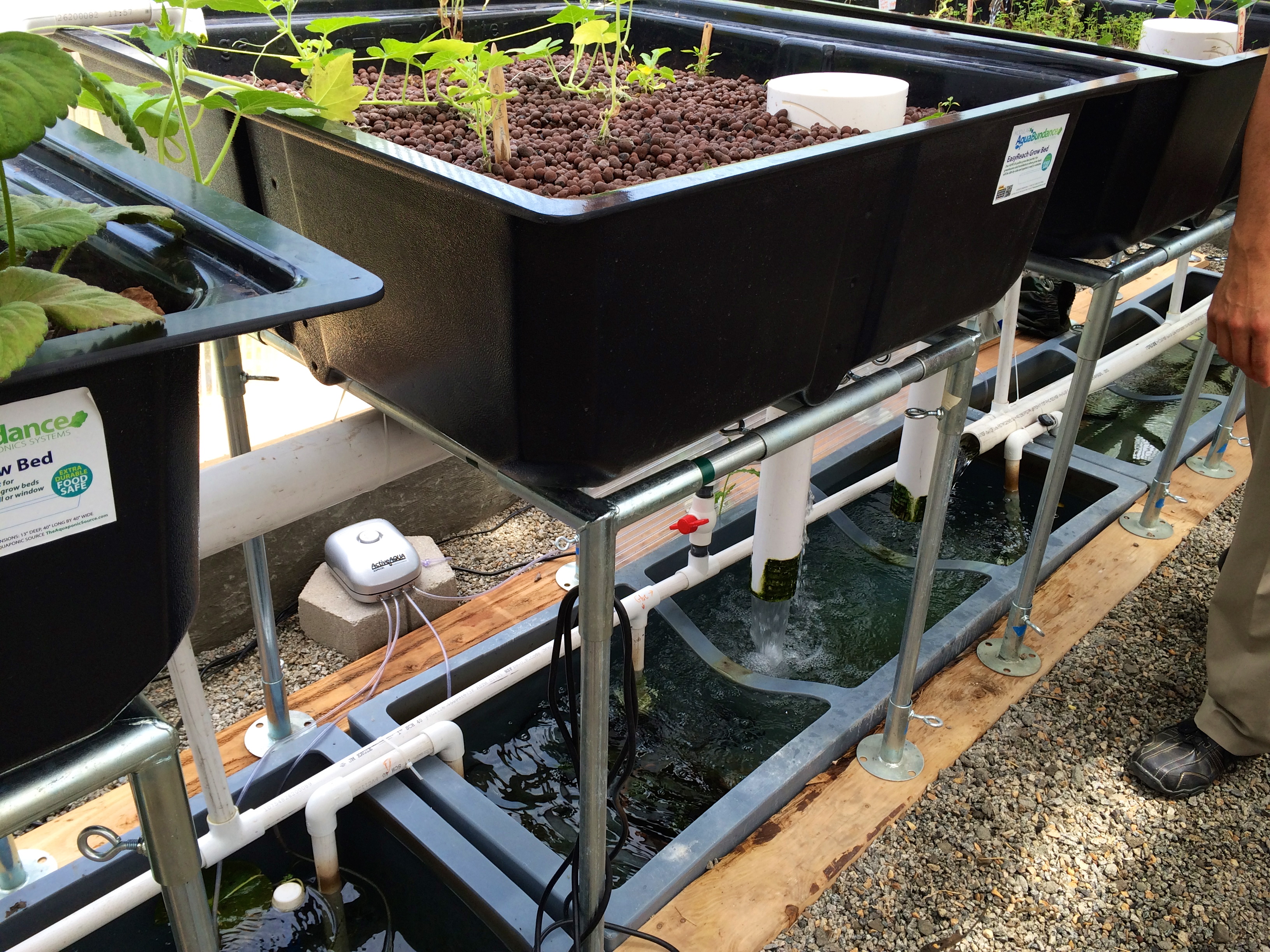 Squash, tomatoes, zucchini, lettuce, carrots and peppers were planted in the boxes. Water is run from the fish tank, through the grow boxes where it is filters, and then sent back to the fish tanks. Photo by Elizabeth Hoover