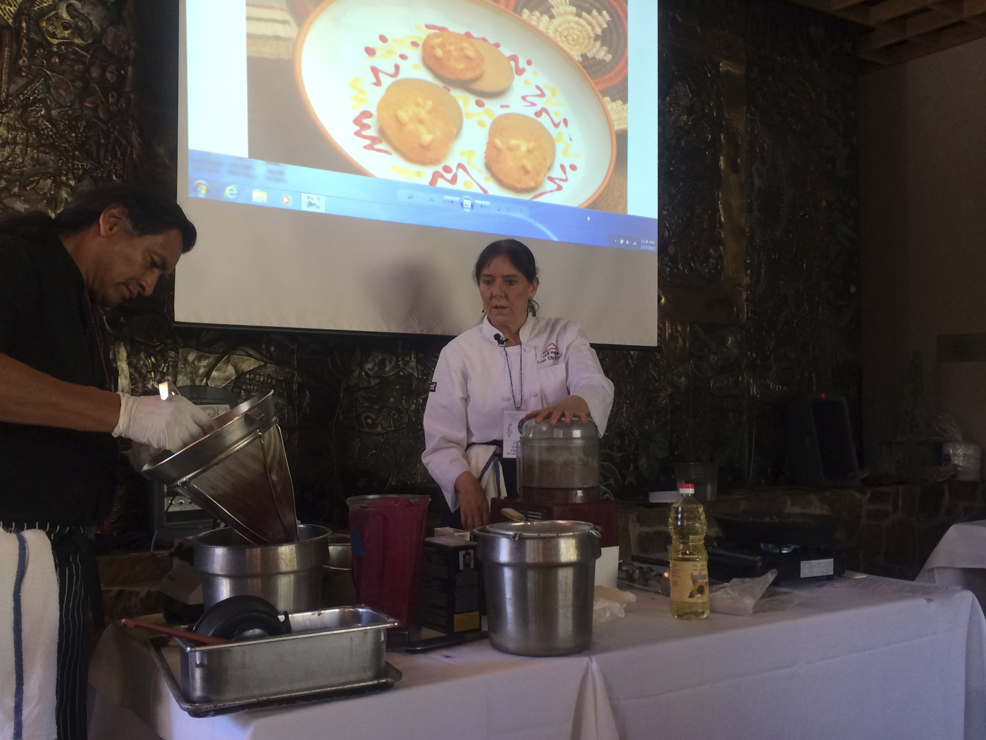 Lois Ellen Frank (Kiowa) and Walter Whitewater (Navajo) giving a demonstration on Native food (in this case making cakes from sunflower seed meal topped with blended fruit) at the Celebration of Basketry and Native Foods festival, Tucson AZ December 2013. Photo by Elizabeth Hoover
