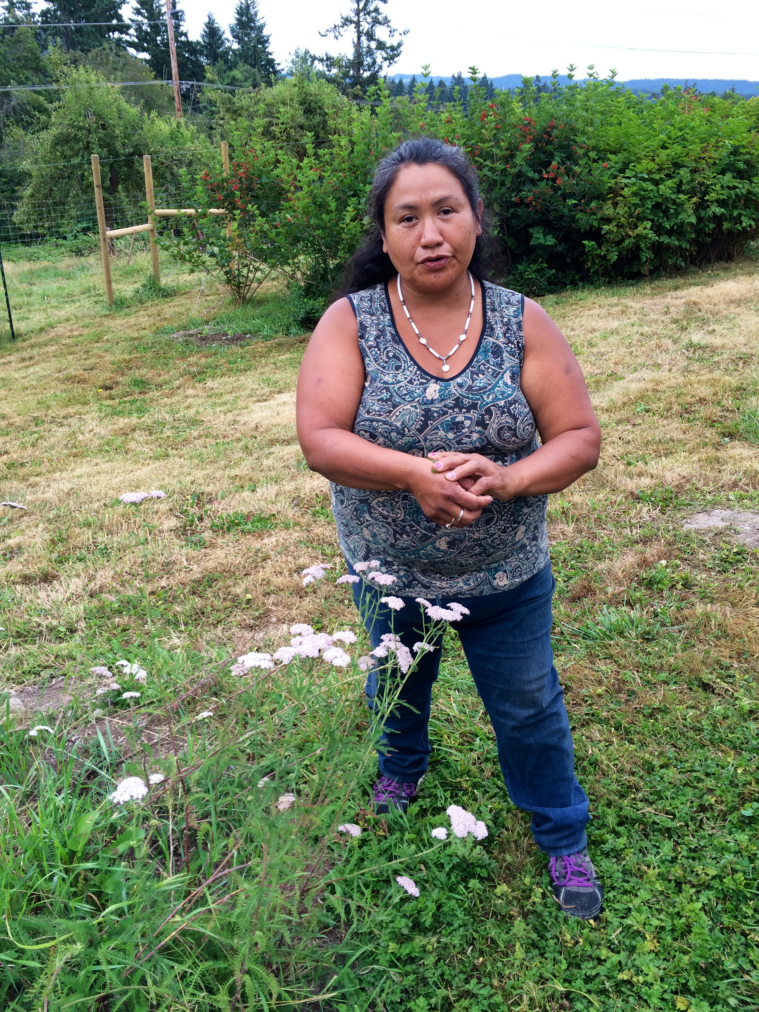 Grace Ann giving us a tour through the medicines garden, where yarrow as well as lemon balm, nasturtiums, swamp tea, nettles, bee balm, Echinacea, marshmallow, and worm wood grow. Photo by Elizabeth Hoover