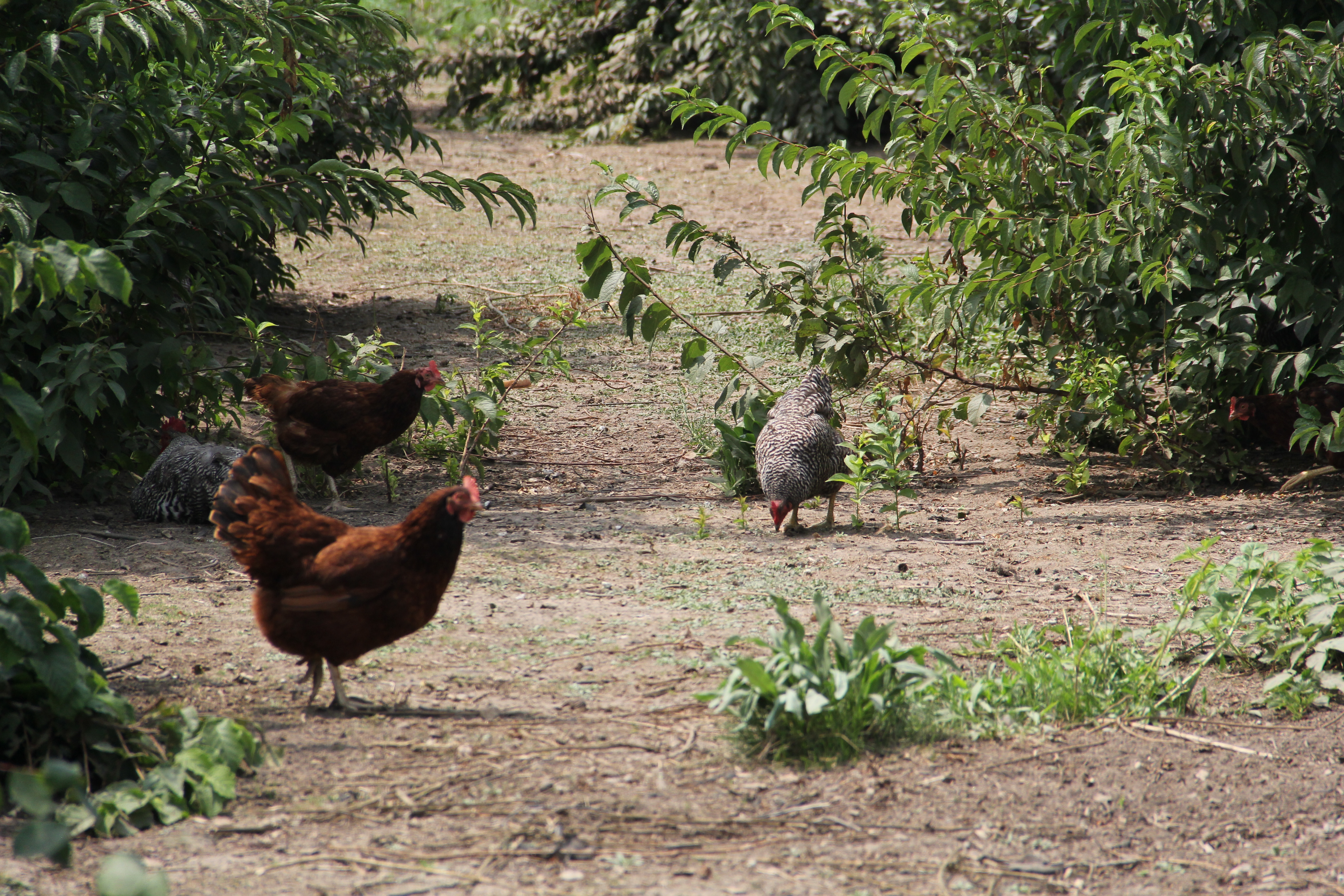 Next to the youth garden is the 3.5 acre organic orchard, 2/3 of which is apples, pears and apricots bred for zone 4 hardiness, and the other 1/3 is indigenous fruits—wild plums, hazelnuts, juneberries, chokecherries, elderberries. One of the biggest challenges in maintaining an organic orchard is pests, and so Rebecca decided to fence the free range chickens in the orchard, in the hopes that they would eat up any bugs that might bother the fruit. The eggs from the chickens are sold as shares for the TSA, and in stores.
