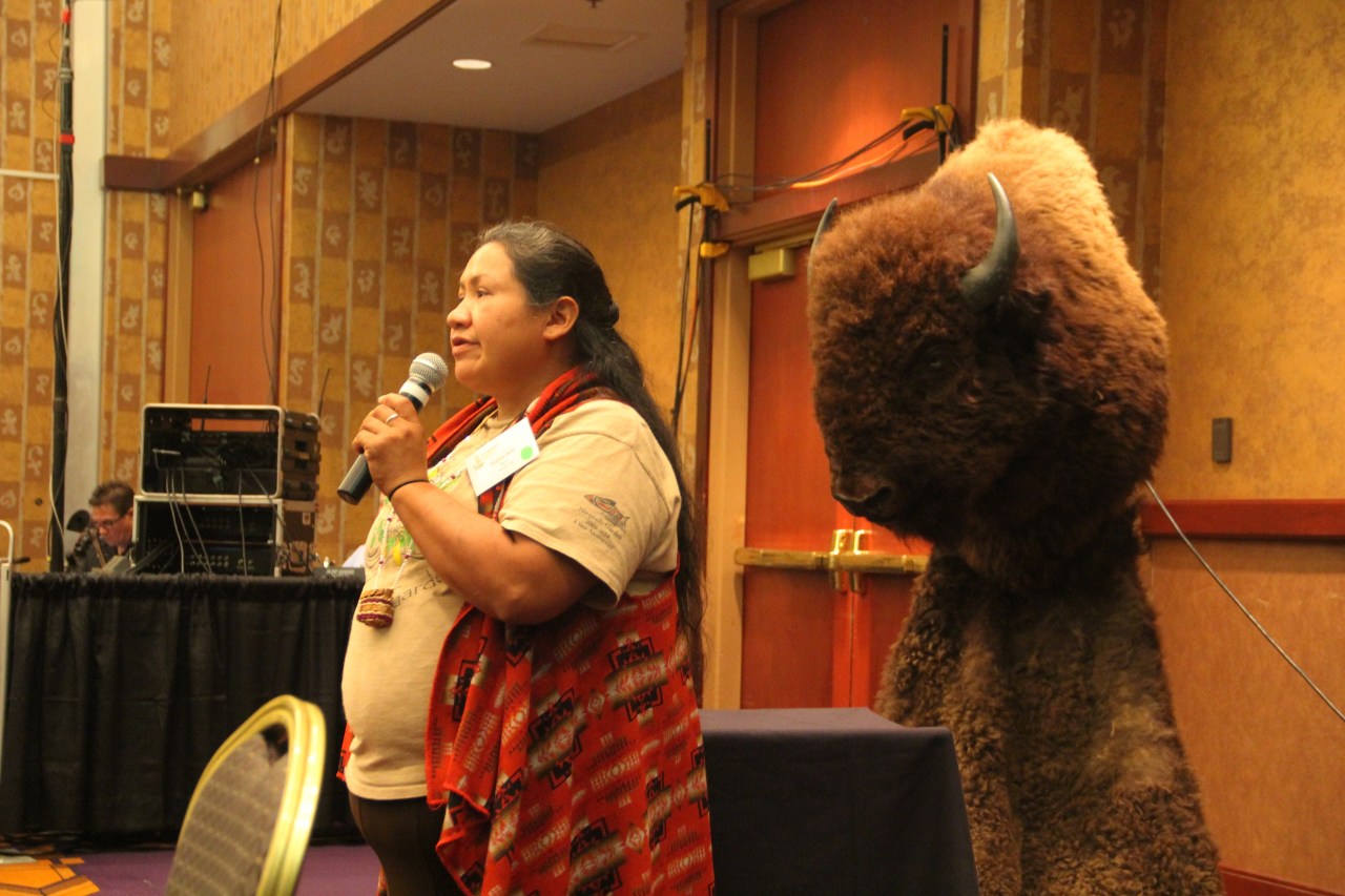 Grace Ann Byrd from the Nisqually Tribe in WA describing her community’s efforts to raise and distribute food (while a buffalo looks on…). Later in the day, Dianne Amiotte-Seidel from the Intertribal Buffalo Council presented about programs to get buffalo meat into schools. She described how Lakota and other Plains people were confined to reservations in the mid-19th century, at which time Indigenous people began to eat much more beef Buffalo meat has fewer calories, more omega 3 and less omega 6 fatty acids. Dianne is working with tribes to try to incorporate more buffalo meat into school lunches. Challenges to these efforts include not having access to enough USDA certified slaughter plants, the higher cost of buffalo meat for schools, and having enough buffalo in tribal herds to feed schools. Photo by Elizabeth Hoover