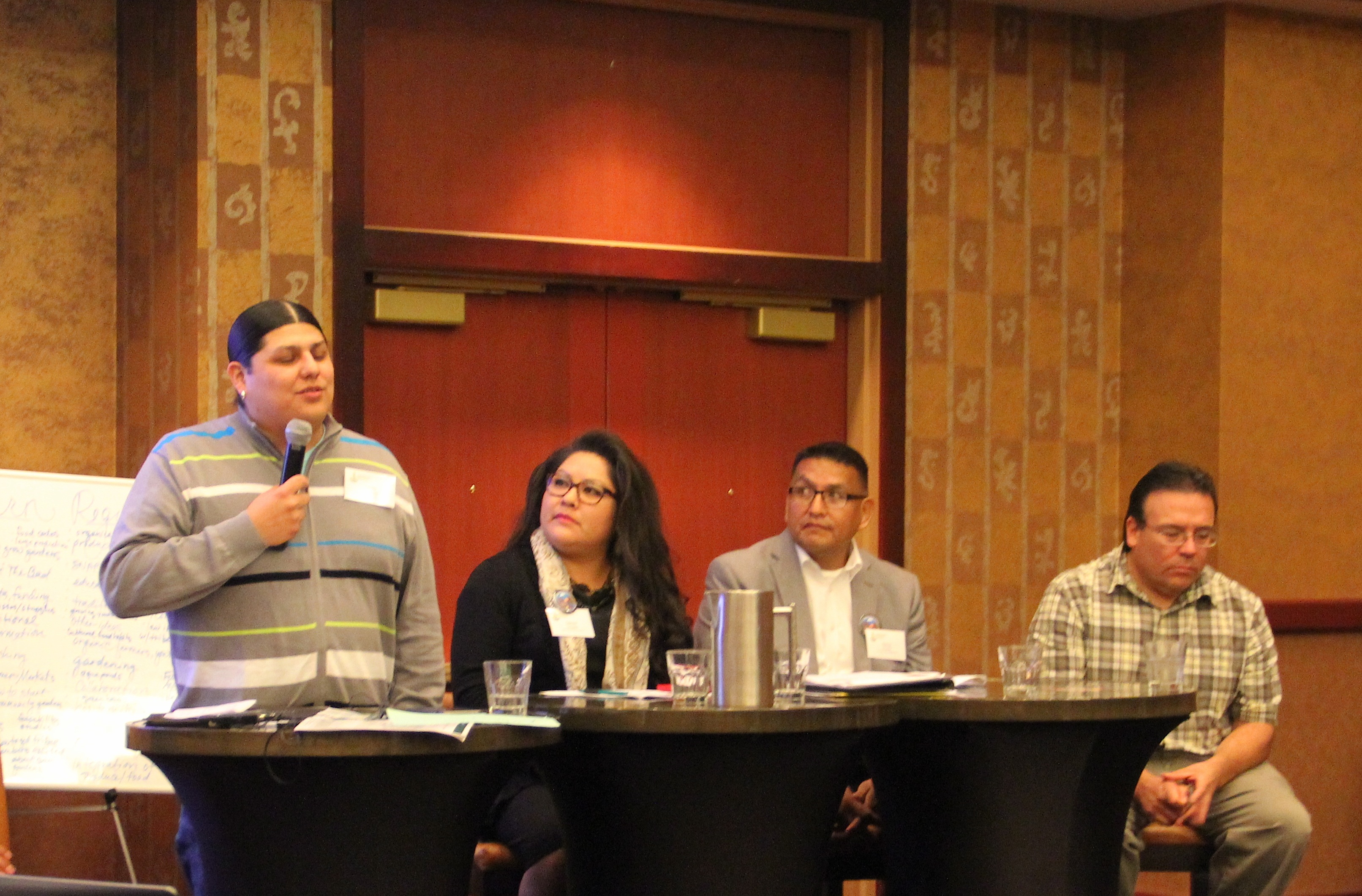 Leotis McCormack, from the Columbia River Inter-Tribal Fish Commission Commissioner and Nez Perce Tribal Executive Committee Member spoke about the struggle to translate cultural issues into policy, and quantifying tribal interests as ecosystem based functions. The Inter-Tribal Fish Commission fought dams along the Columbia River that blocked access to fish. To his left, Denisa Livingston from Dine Community Advocacy Alliance and Danny Simpson, former Navajo Nation Council Delegate, presented about the process behind passing the Navajo Junk Food Tax. Denisa described how there are currently 25,000 Navajos with diabetes, and 75,000 who are pre-diabetic. For Navajo Nation, $325 million is spent per year for the basic treatment of diabetes and $2.5 billion is spent on the treatment of diabetes related complications. In an effort to curb some of these costs and suffering, the Dine Community Advocacy Alliance decided to target the types of foods that their fellow community members were consuming, and crafted the Healthy Dine Nation Act of 2014. The Navajo Nation charges 5% sales tax on all food. This tribal legislation eliminates that tax on healthy foods like fresh fruits and vegetables, nuts and nut butters, hominy, beans, and bottled water water. In addition, an extra 2% tax was added to junk foods like soda and chips (for a total of 7% tax on these foods, and 0% tax on healthy foods.) The tax collected will go into Community Wellness Development Projects, like gardens, farmers markets, healthy recreation programs, and educational materials about which foods are taxable and non-taxable. According to Danny, the Navajo Nation president, under pressure from lobbyists from beverage companies initially vetoed the Act, but it signed when he was presented with it a second time, and the Healthy Dine Nation Act (known informally a the Navajo Nation Junk Food Tax) was officially passed in the summer of 2014.
