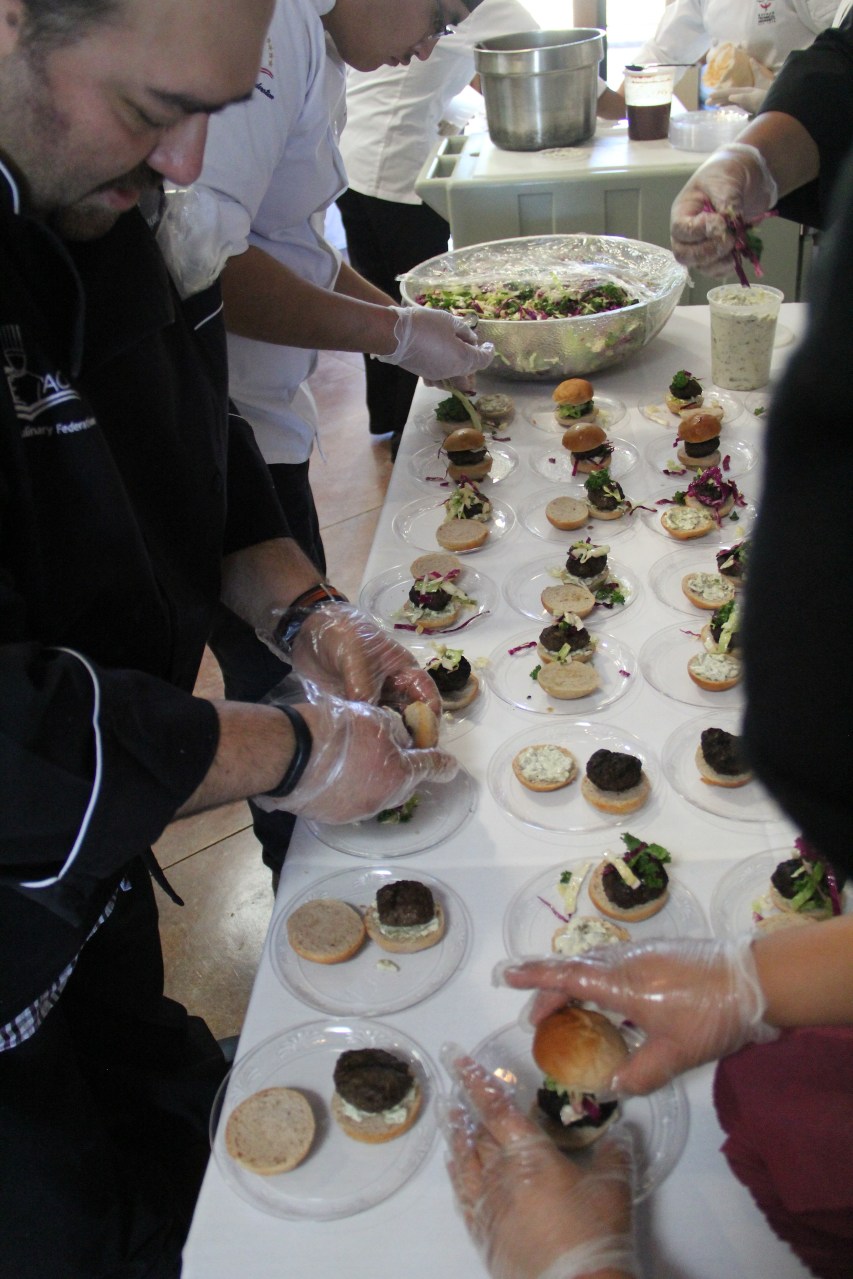 Instructor Brian Tatsukawa with students from Navajo Technical College assembling buffalo sliders with green chili and jalapeño mayo, kale slaw with a citrus vinaigrette, and a blue corn Rosemary bun (photo by Elizabeth Hoover).