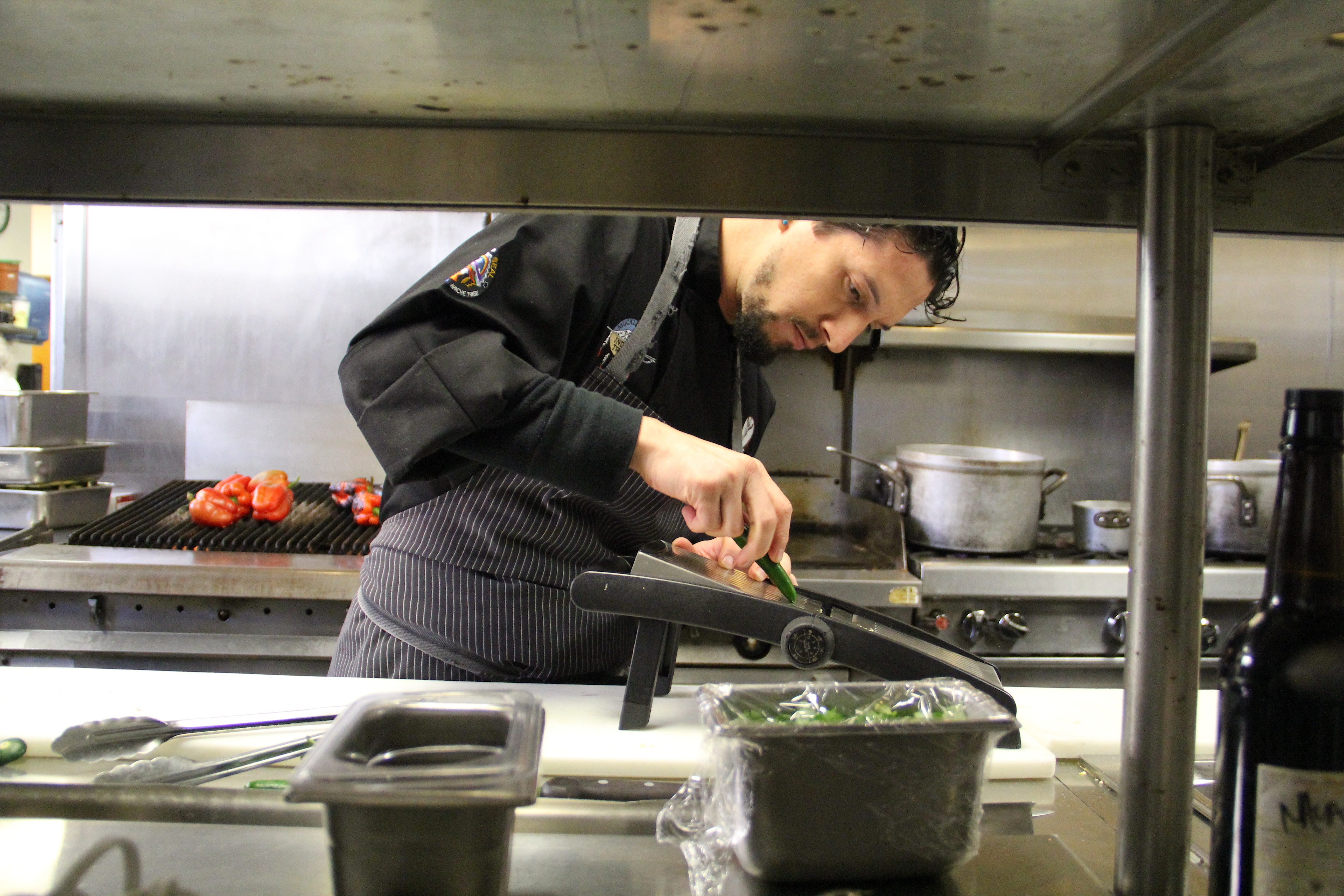 Chris Rodriguez slicing jalapenos. Chris Rodriguez is a Xicano professional chef and co-creator of the grassroots community health project Decolonial Food For Thought. He is an independent scholar and political commentator on native and Indigenous food autonomy and sovereignty movements in Mesoamerica. Photo by Elizabeth Hoover.