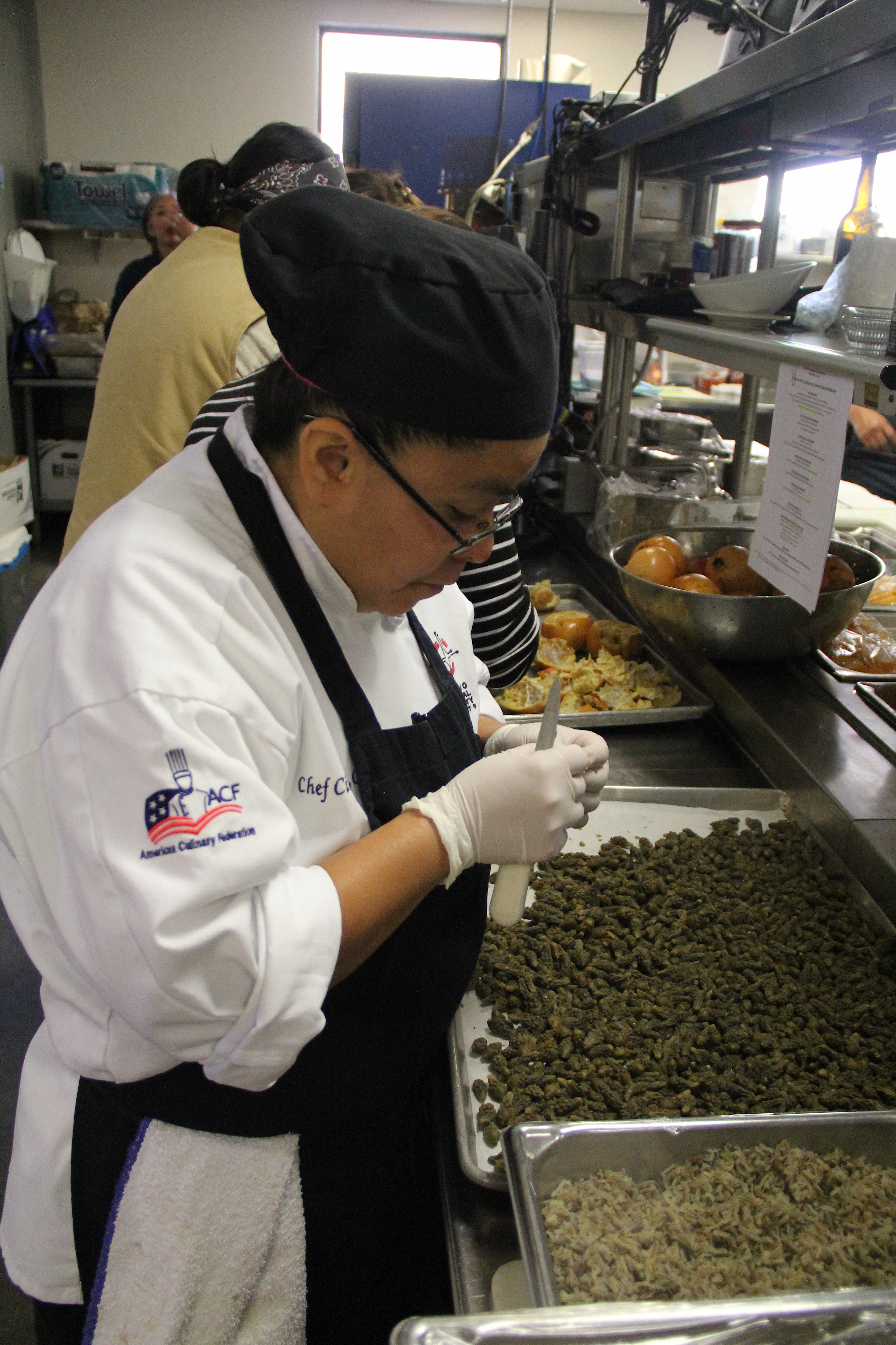 Sous chef Lorencinta Billiman (Navajo) working hard to make sure all of the thorns are removed from the cholla buds (photo by Elizabeth Hoover).