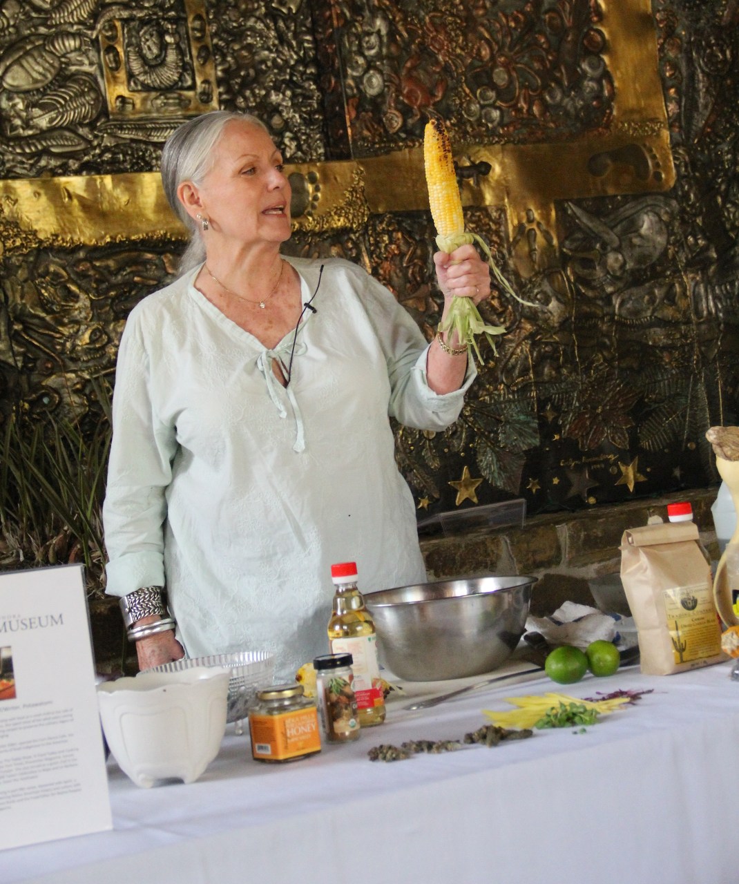 Loretta described how in her Corn Dance restaurant in Santa Fe, they didn’t use plastic corn jabbers, they braided the husk. She went on to describe a variety of dishes that can incorporate sweet corn, and then, once you boil the cobs into a sweet broth, the various soups and deserts that can be created from the broth. Photo by Elizabeth Hoover
