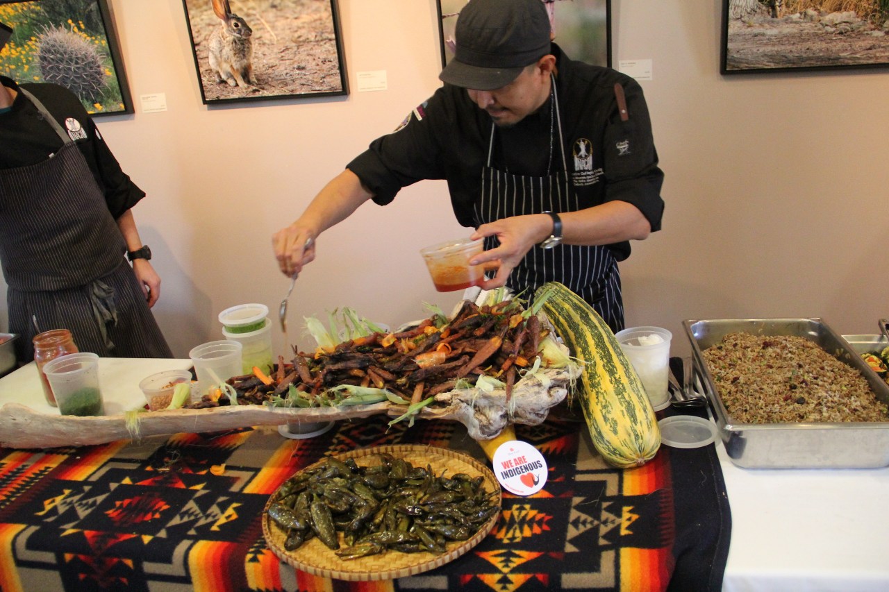Tempura carrots- coated in blue corn meal w honey. Really delicious! A note from Chef Nephi Craig: “Pictured here are my Dineh Blue Corn “Tempura” Chefs Garden Carrots drizzled with an Agave Chili Glaze, served over fresh corn husks in large driftwood from the Salt River Canyon. I simply washed the carrots and roasted them skin on until tender, split the larger carrots, and prepared a batter with Blue Corn meal seasoned with Honey and Chili Flakes, then dipped the carrots and fried them crisp…finished the the agave chili glaze, it was amazing. In the basket are roasted jalapenos and serrano chilis. This was one part of our tasting booth.”