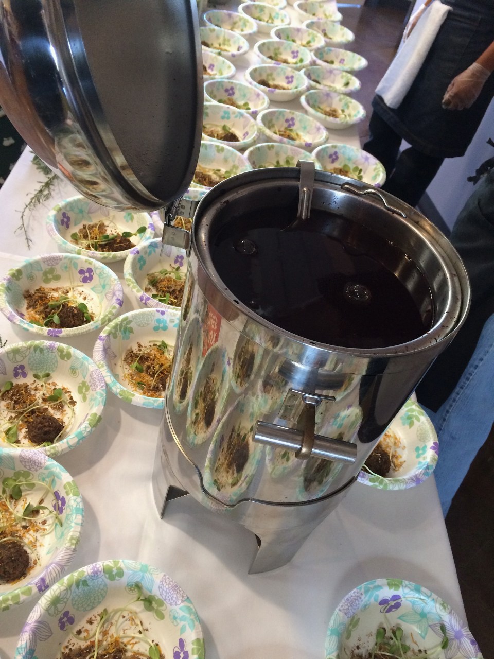blueberry broth to be ladeled over dried buffalo meet, sunflowers sprouts, seed mix and flower petals. Photo by Elizabeth Hoover