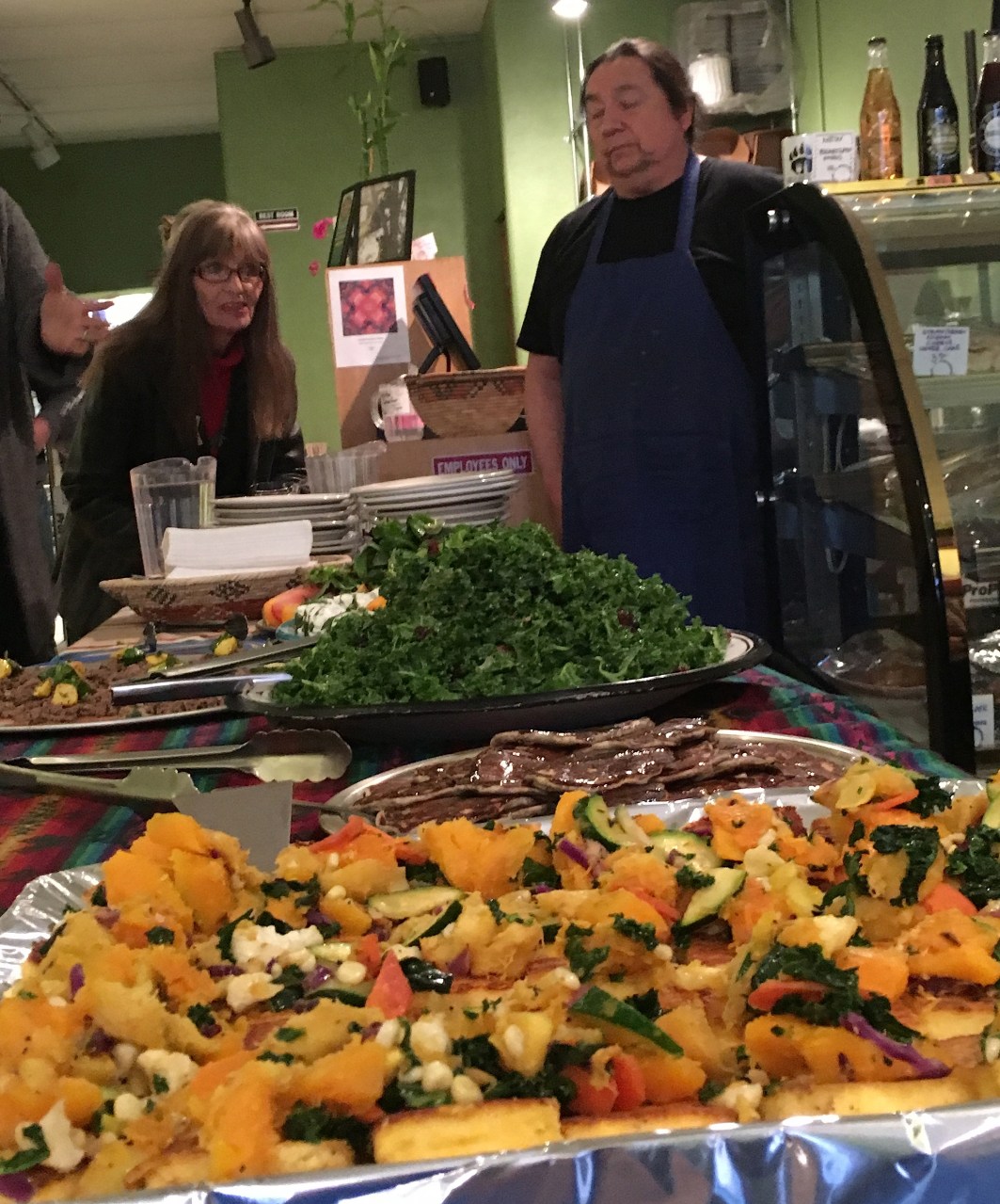 Anthony Archuleta, the Taos Pueblo cook who prepared a wonderful dinner for us. In the foreground are polenta cakes covered with local vegetables– winter squash, zuchinis, tomatoes, corn, onions and spinach. Behind them are blue corn cakes drizzled with local honey, a kale salad, and more blue corn cakes with buffalo meat and squash. Photo by Elizabeth Hoover