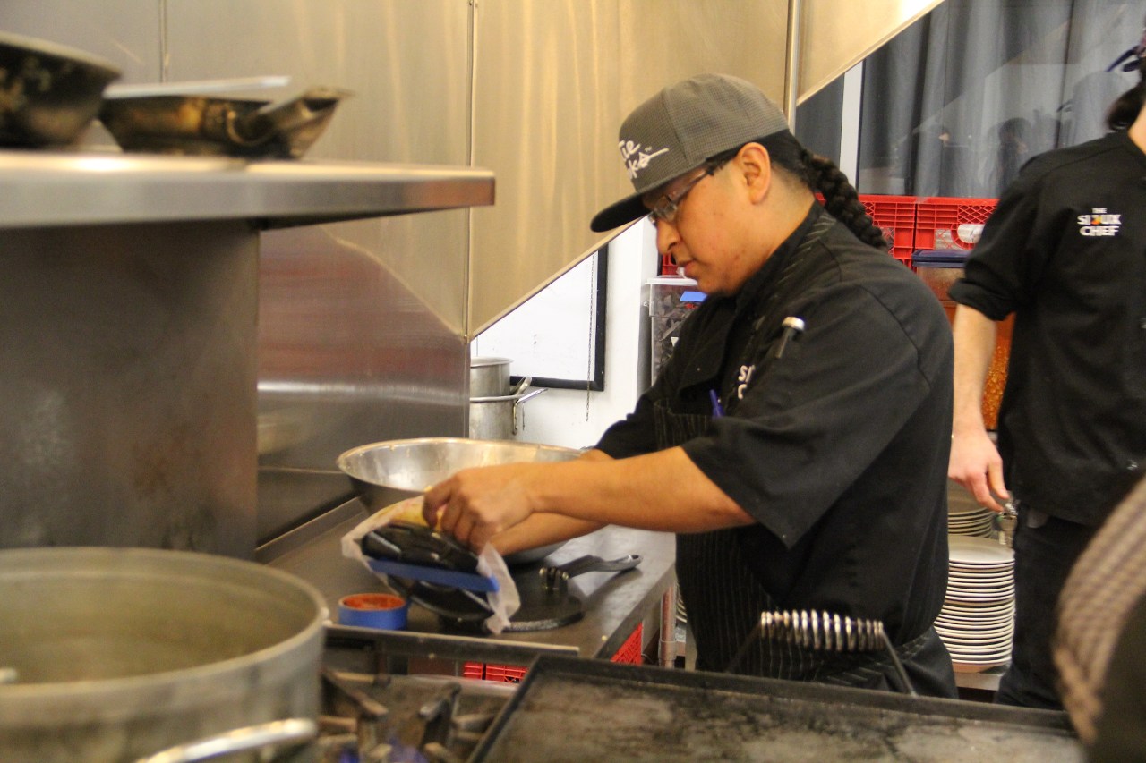 When I asked him what it meant to be a Native chef, he replied “As an aspiring Chef I am definitely motivated by the well-established Native Chefs who are on the frontlines revitalizing a rich cuisine that is from our very own backyards (rivers, prairies, forests). Networking, working with, and receiving advices from these Chefs has in a way woken me up to not only pursue a career in culinary but to strongly focus on Indigenous foods and help revitalize a food culture that has been forgotten. I have a ways to go to earn the title of a Chef but it definitely means a lot to be in the mix learning and gaining knowledge daily and to know that one day I will earn the title.” Photo by Elizabeth Hoover