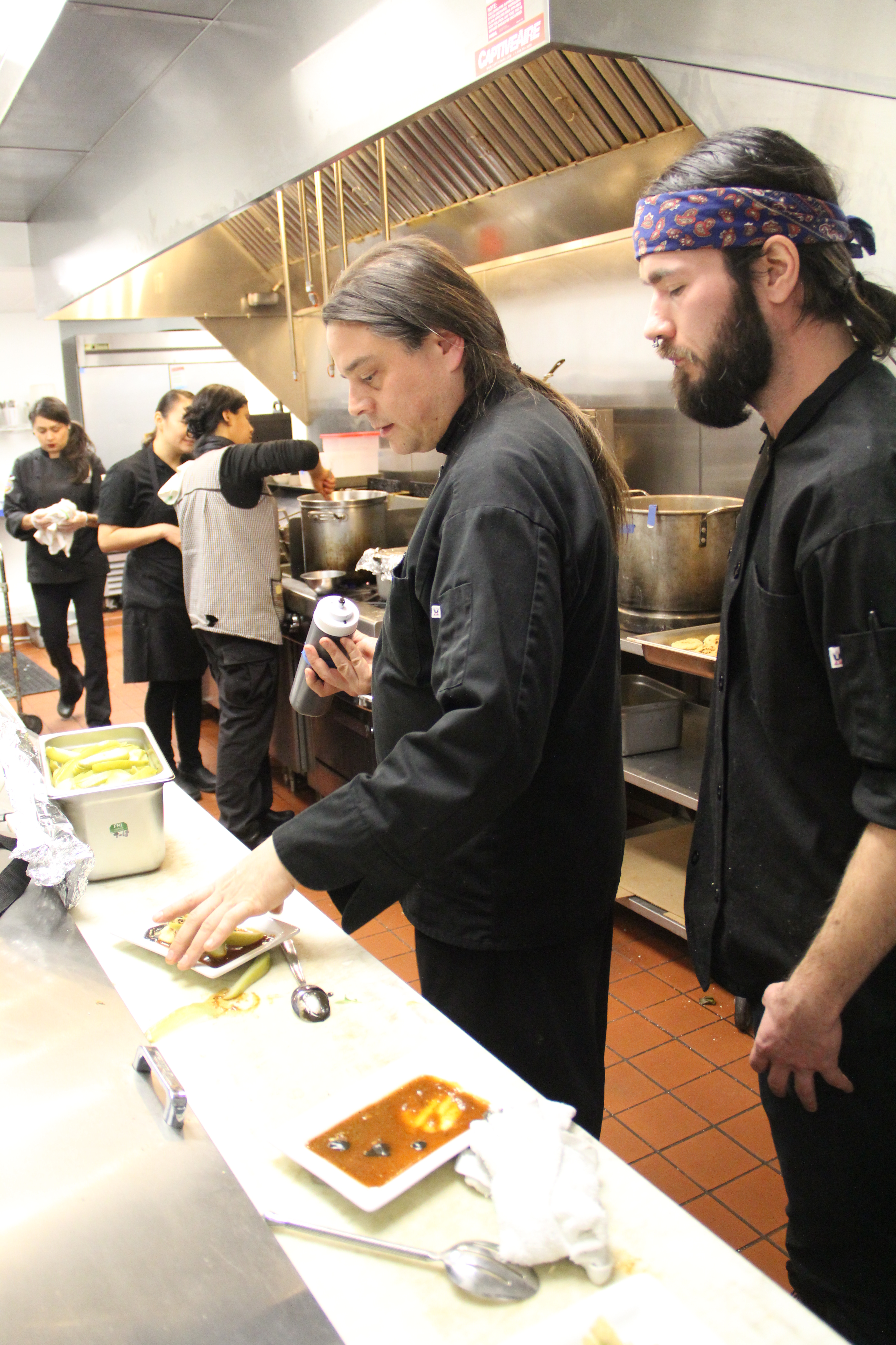 Vern DeFoe (Red Lake Ojiway) watches as Sean designs the first plate. Vern has been working in an assortment of restaurants over the past 15 years. He first met Sean when he worked at the Common Roots Cafe, where Sean was the head chef for a number of years. Vern noted “I’ve always wanted to do what Sean is already doing, finding out indigenous ingredients. My great grandma always talked about things that at you never hear about people eating now. Things like lily pad roots and stuff like that.” When the Tantaka truck was started, Sean asked Vern to come on board. On the truck, Vern helps manage, creates recipes, trains newer workers, cooks, does dishes, and any other job that needs completing. When I asked him about working with other Native chefs at events like this, he replied “Its exciting to me to meet other people that are into the same exact stuff we are, it’s exciting to know that it’s not just us here, and it just feels good to work with Indigenous people.” Photo by Elizabeth Hoover
