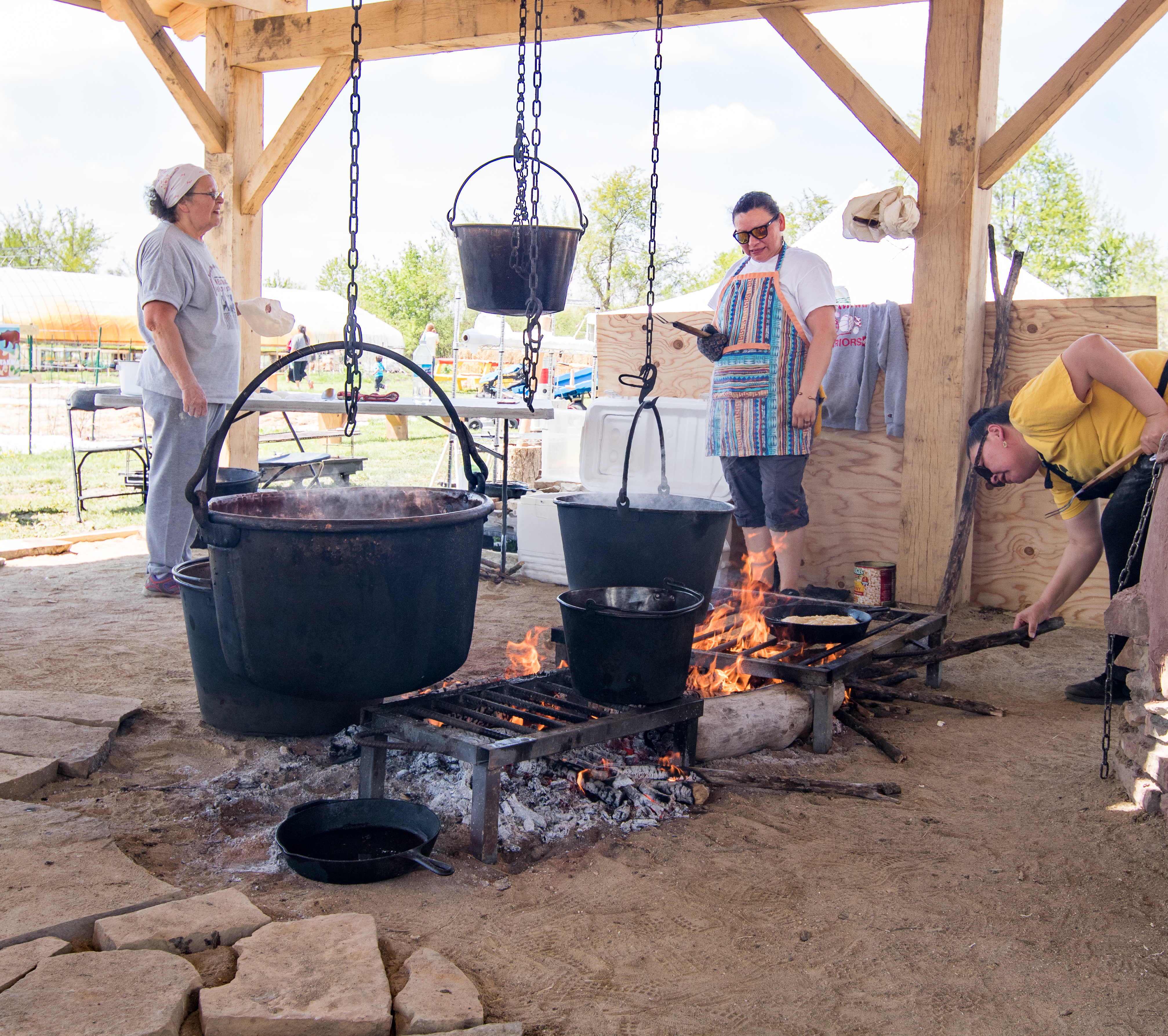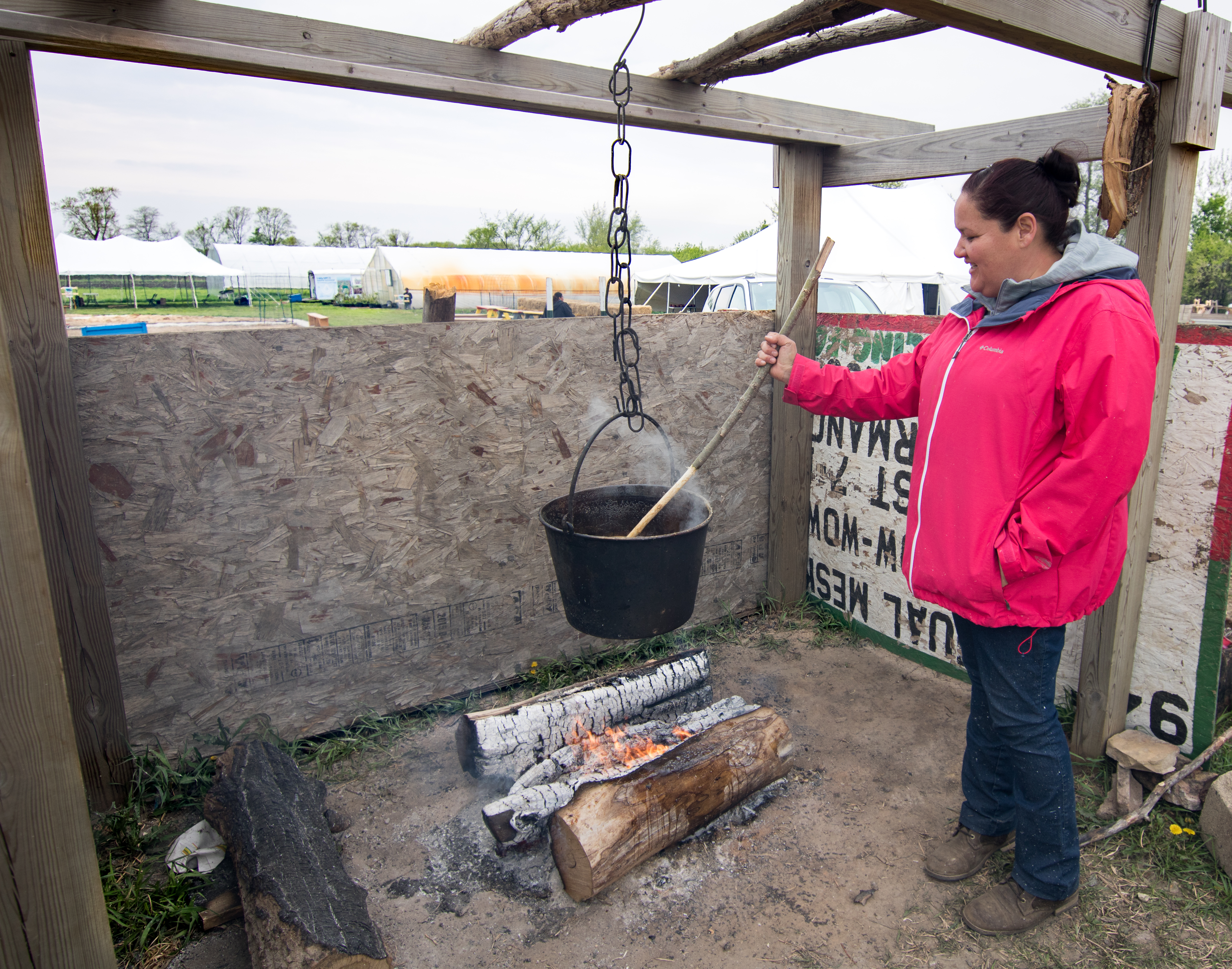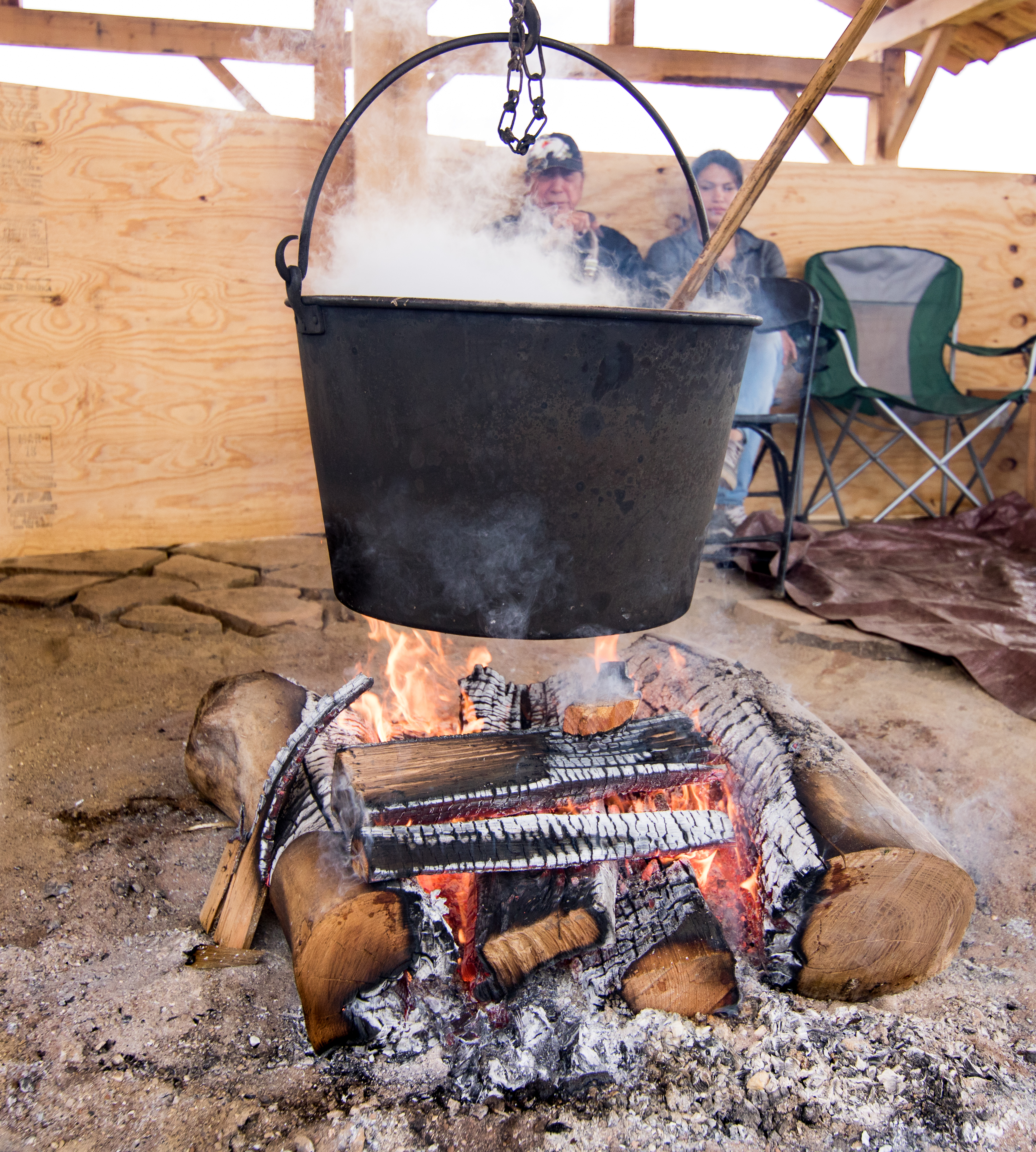 Dave Shananaquet stirs the pot. Potawatomi elder George Martin (in the black jacket) adds dried corn and wood ash in a 1:1 ratio, and boils until the “eyes” of the corn kernel come off. Photo by Elizabeth HooverPhoto by Elizabeth Hoover