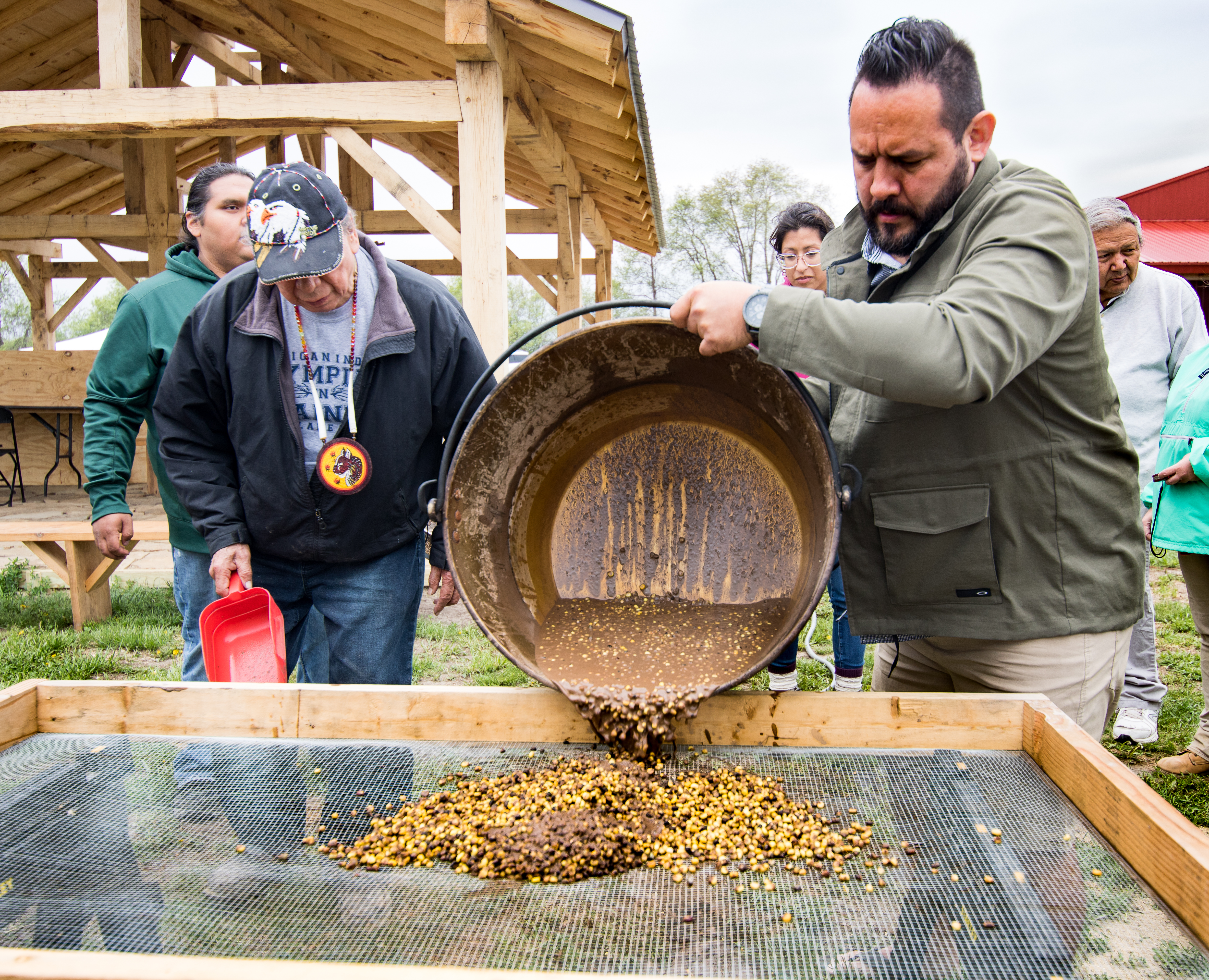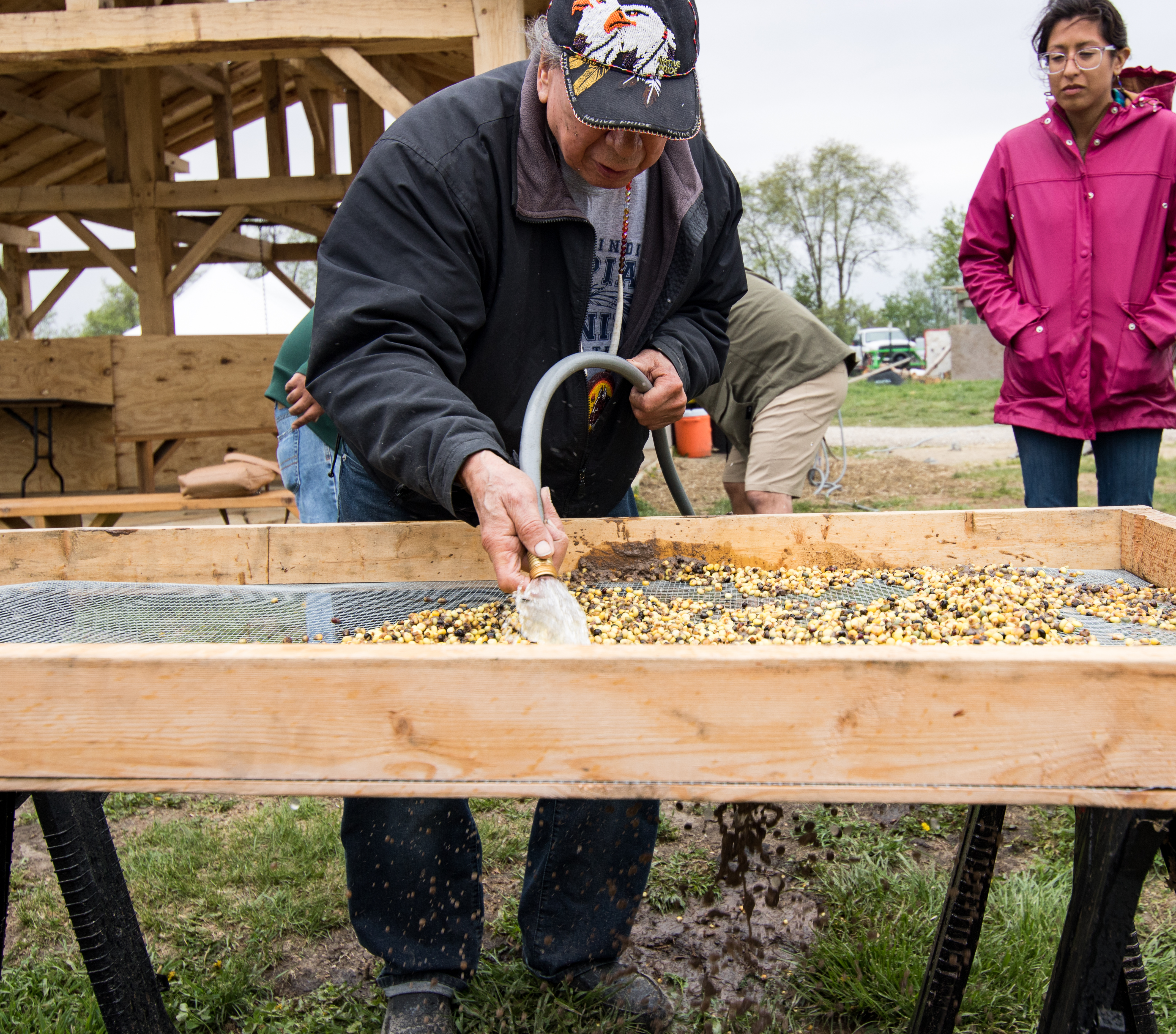 Joe VanAlstyne pours the hominy and ash mixture onto a screen. Photo by Elizabeth Hoover