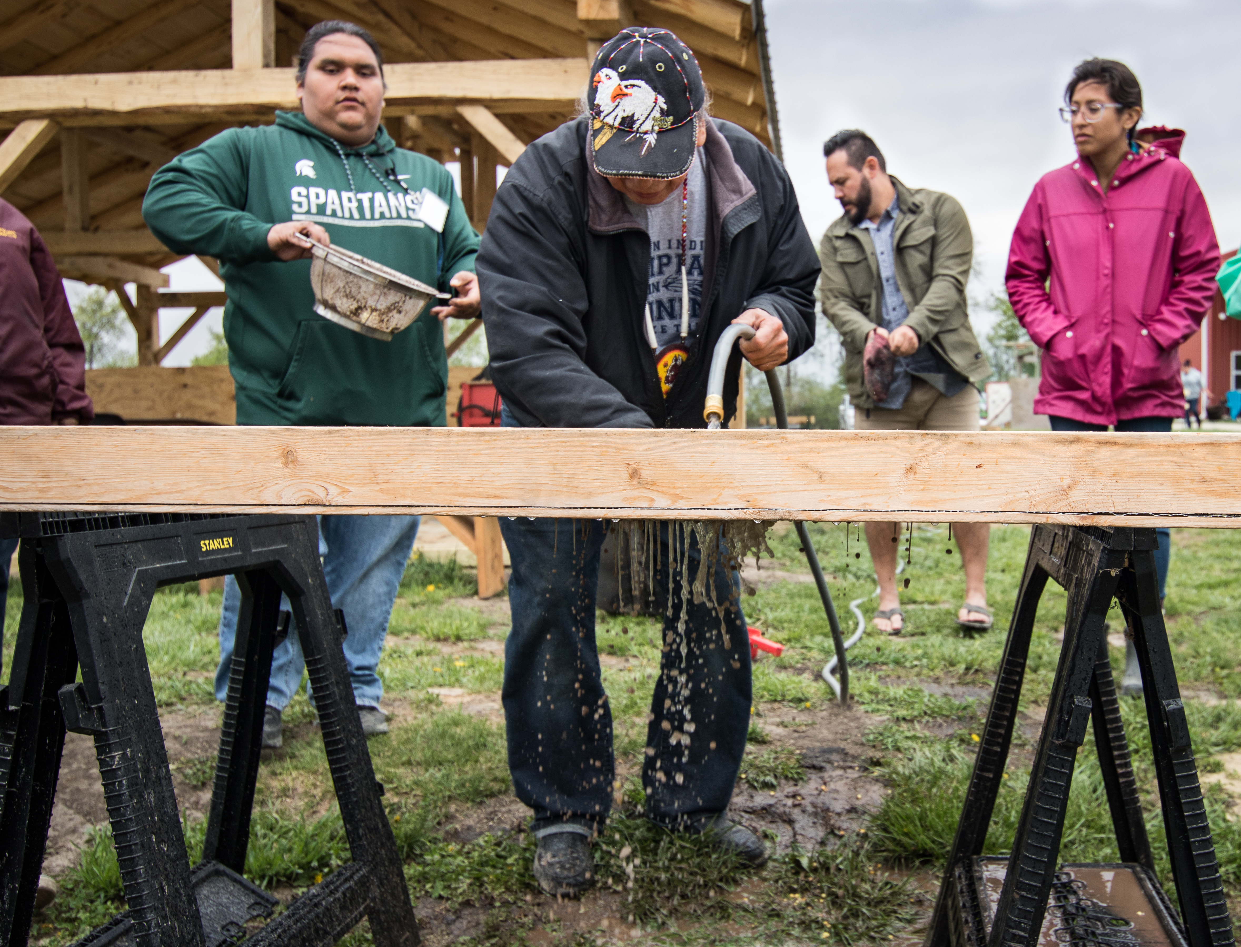 Even uncovered, the longhouse made a good meeting spot. Photo by Elizabeth Hoover