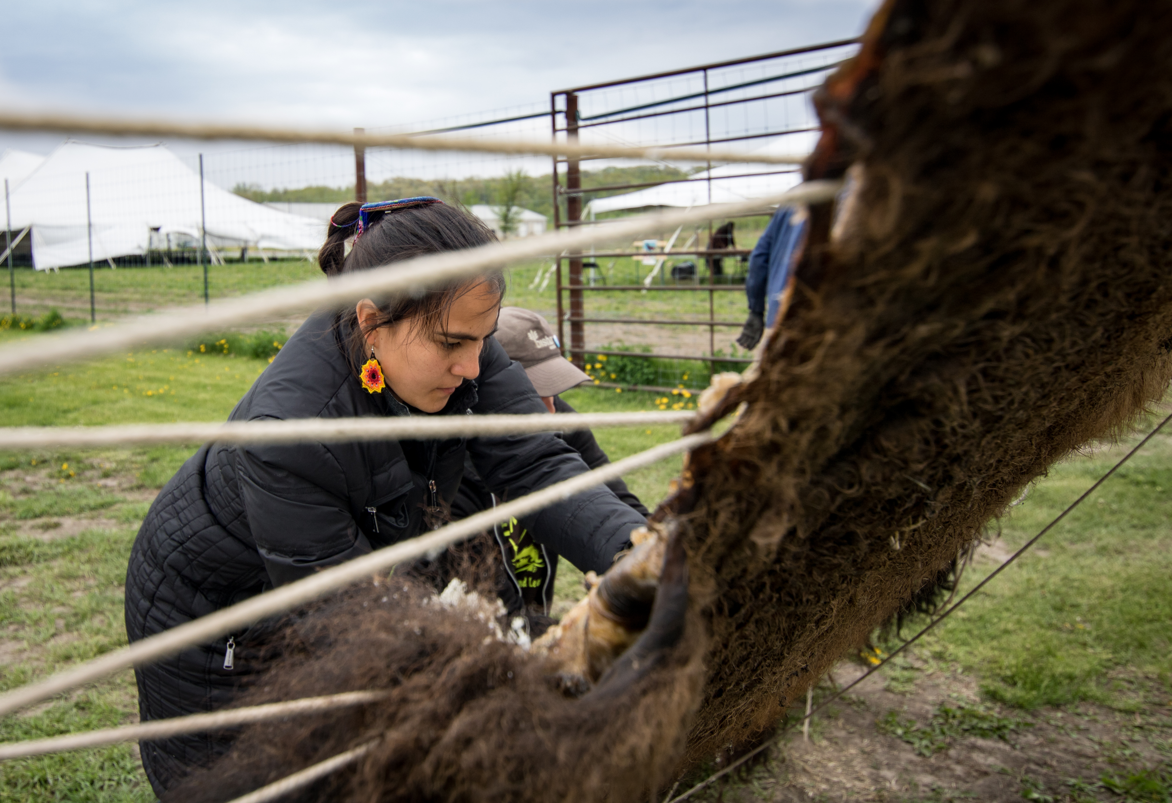 Nicole Yanes scraping the buffalo hide. Photo by Elizabeth Hoover