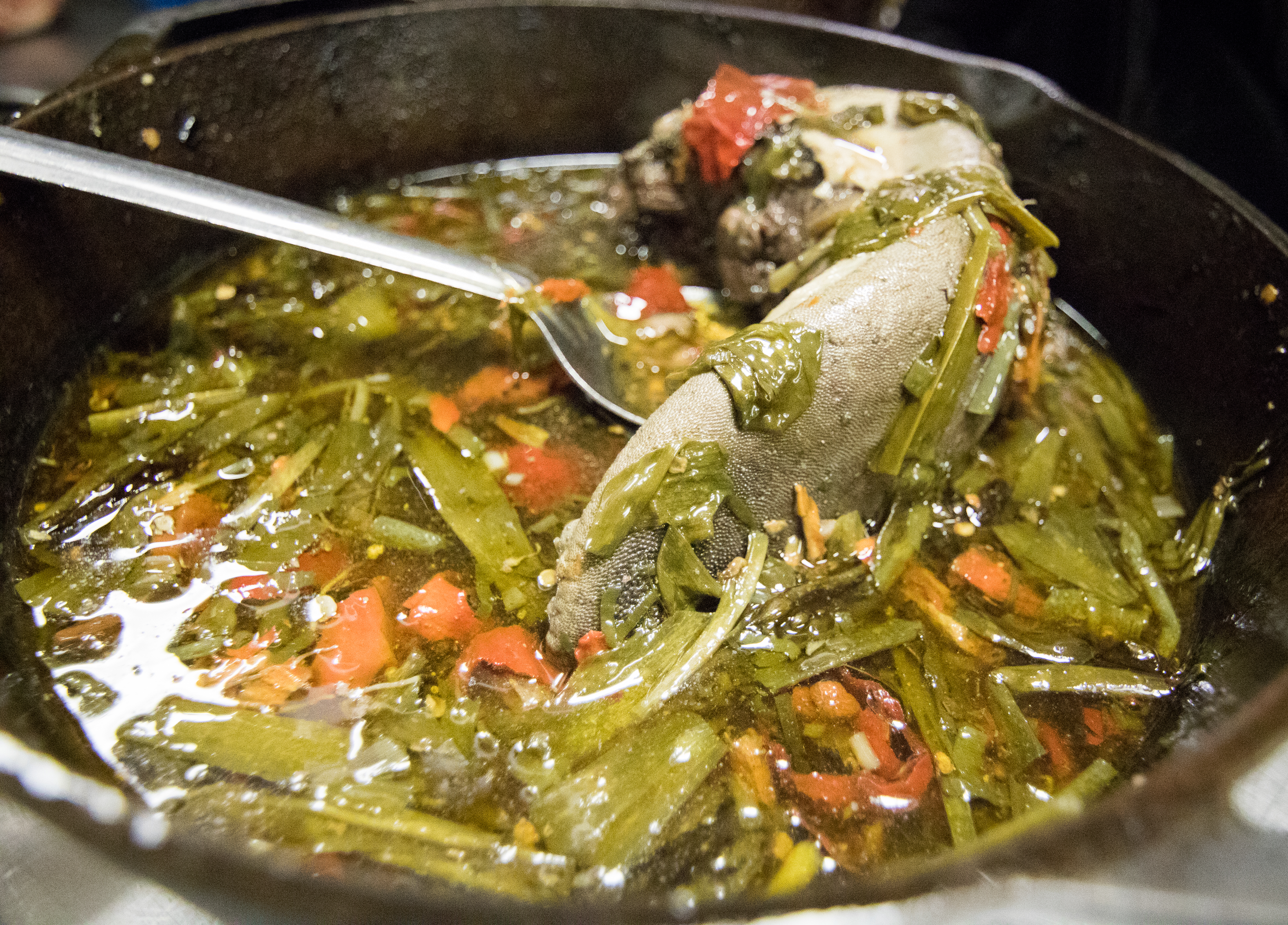 Buffalo tongue, simmering in ramps and chilis. Photo by Elizabeth Hoover