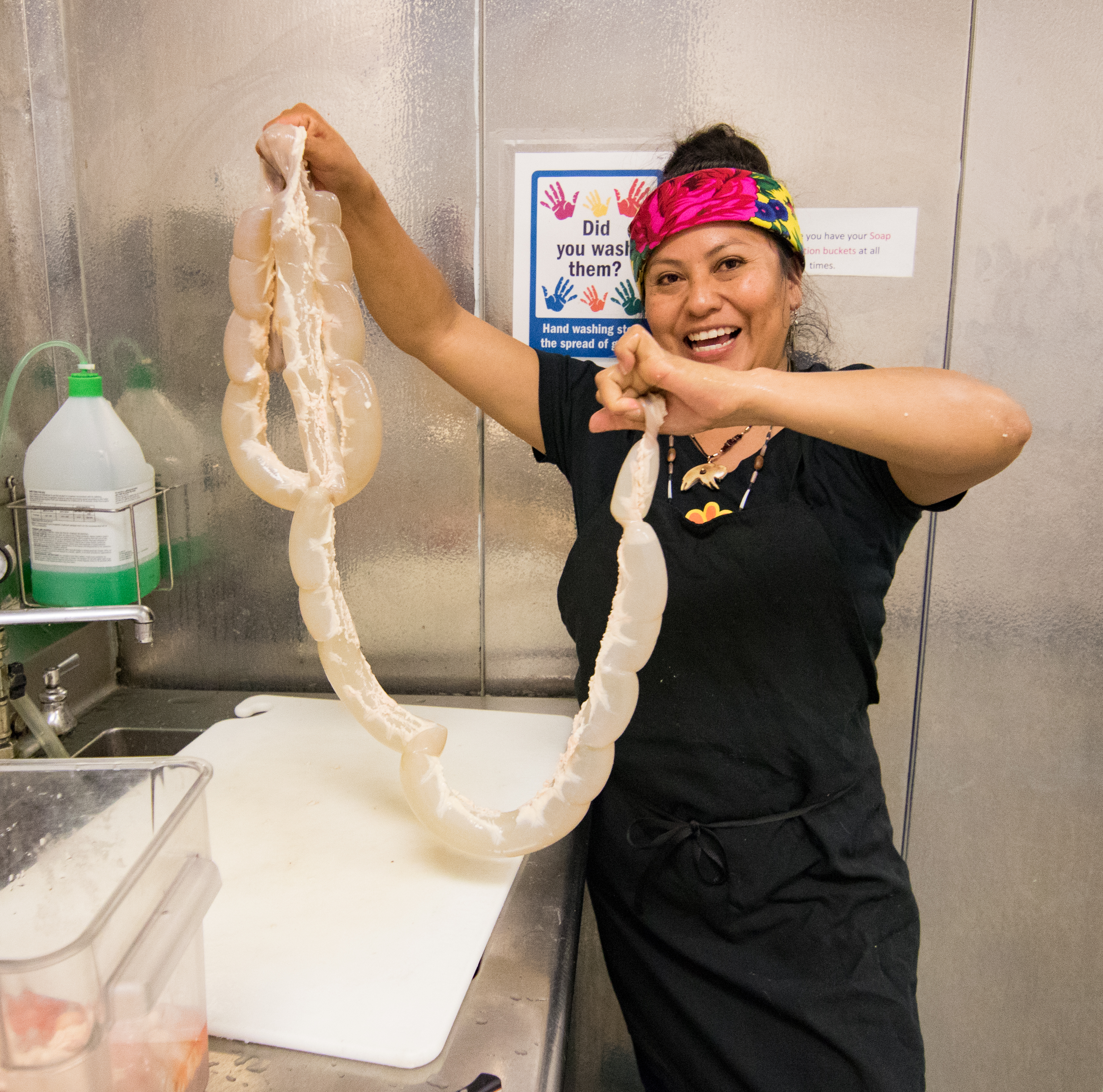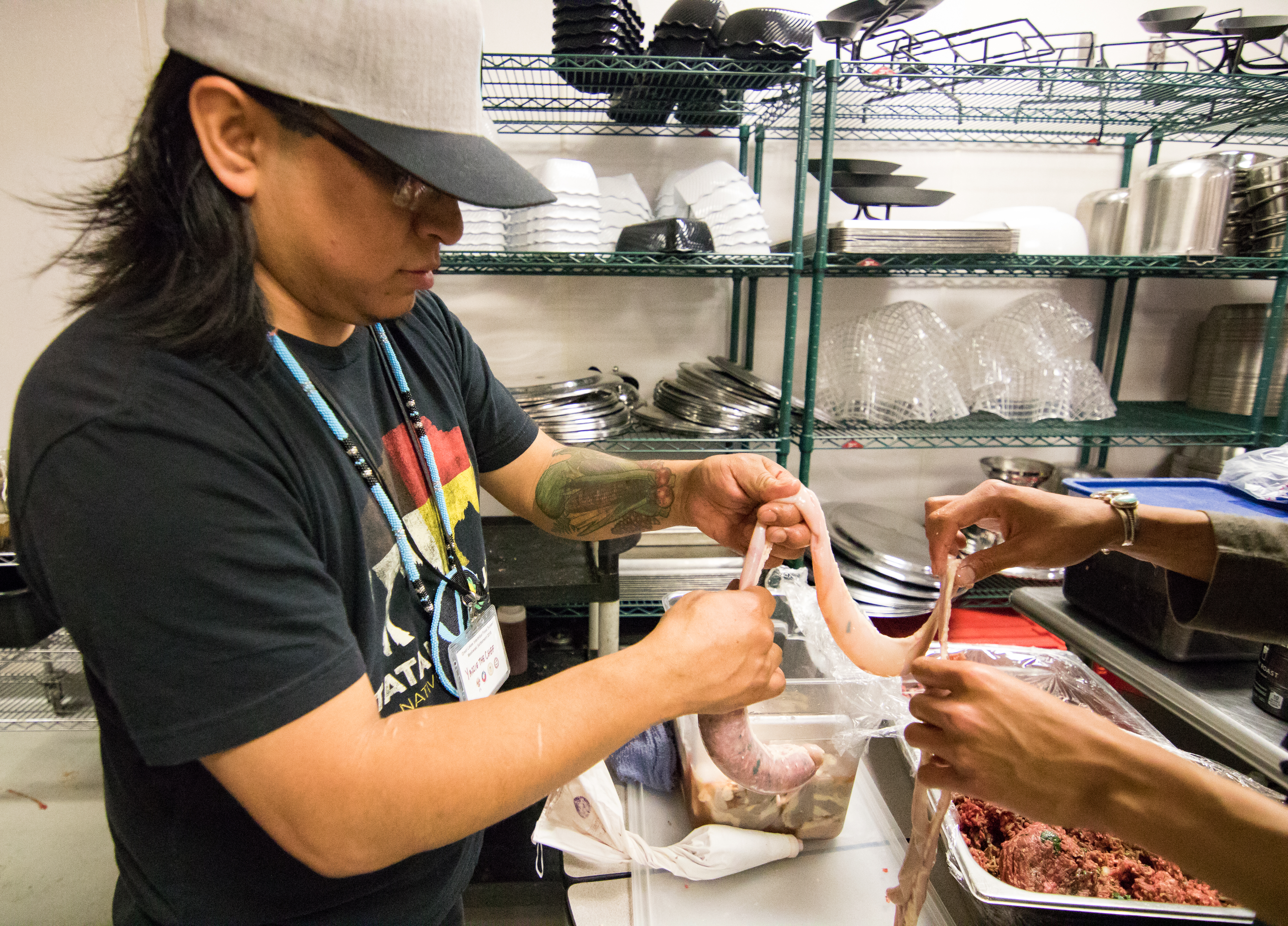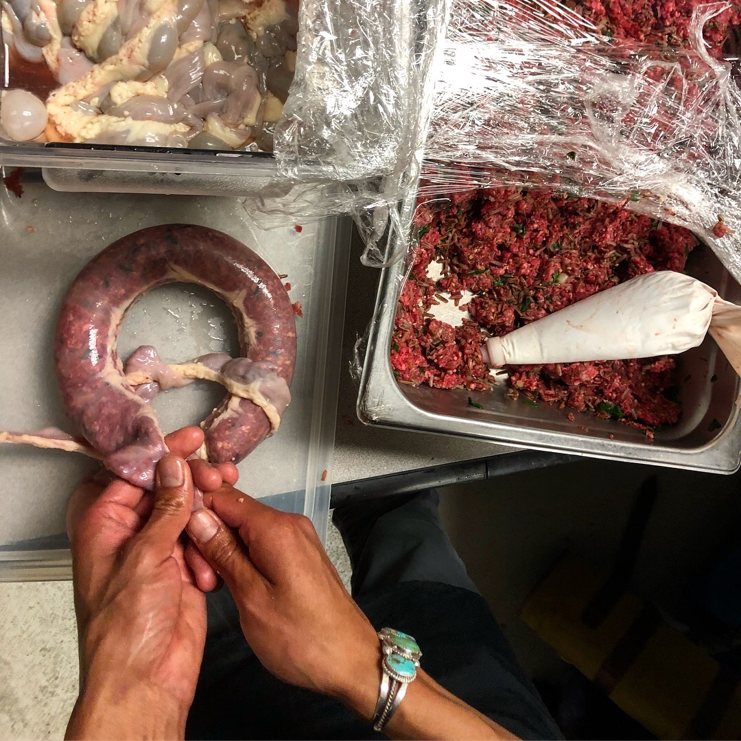 Brian Yazzie stuffing spiced ground buffalo meat to make sausages. Photo by Elizabeth Hoover