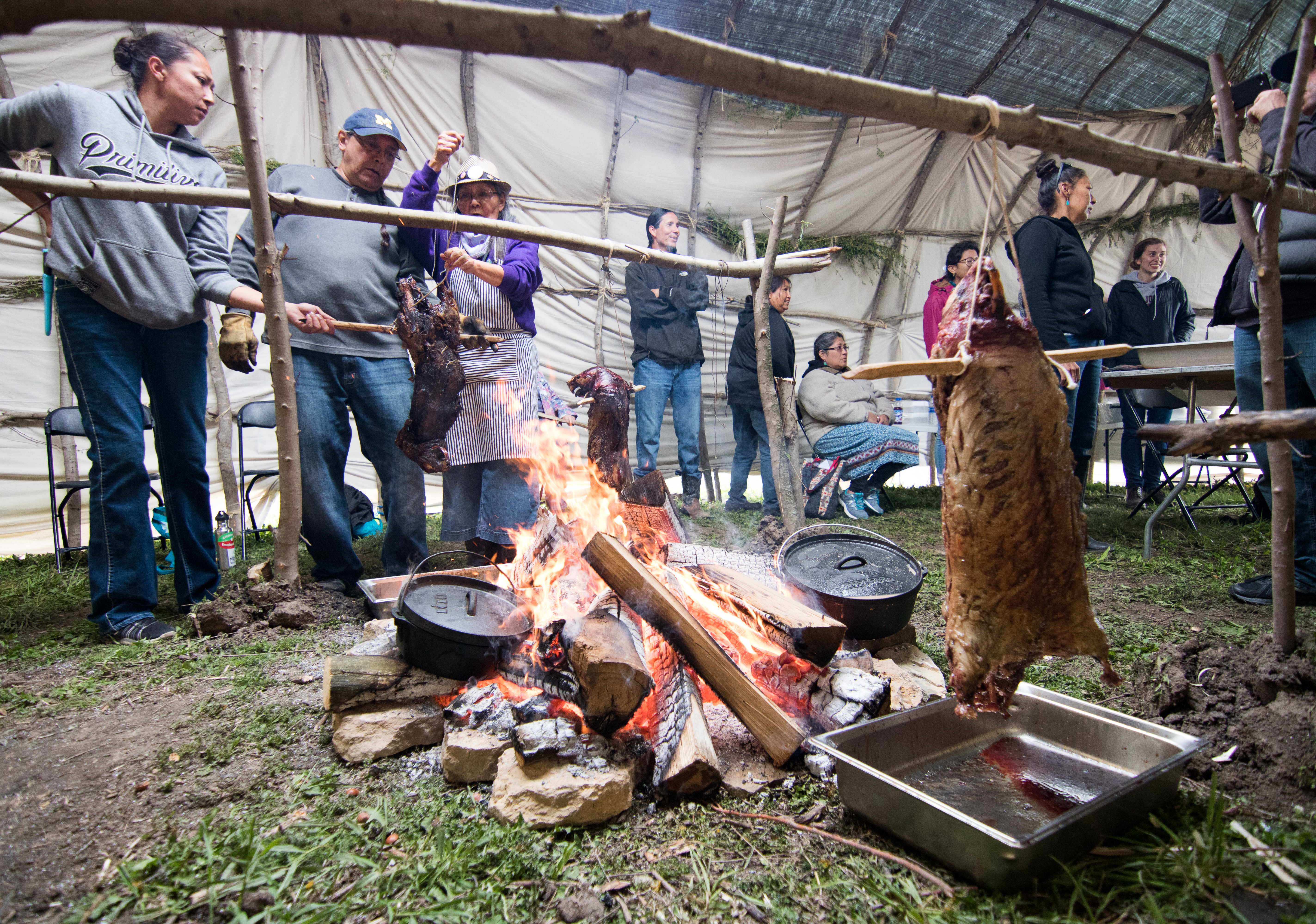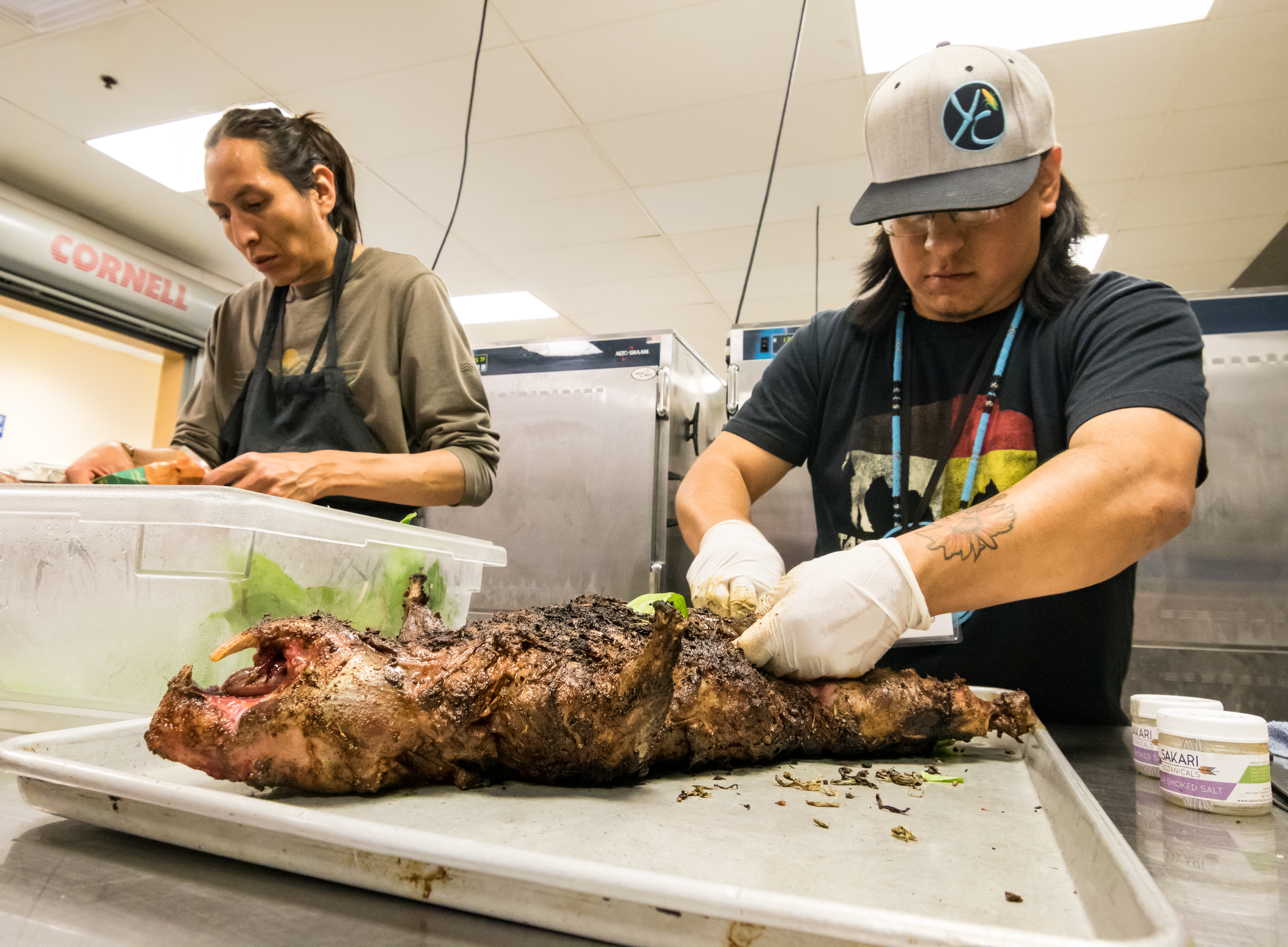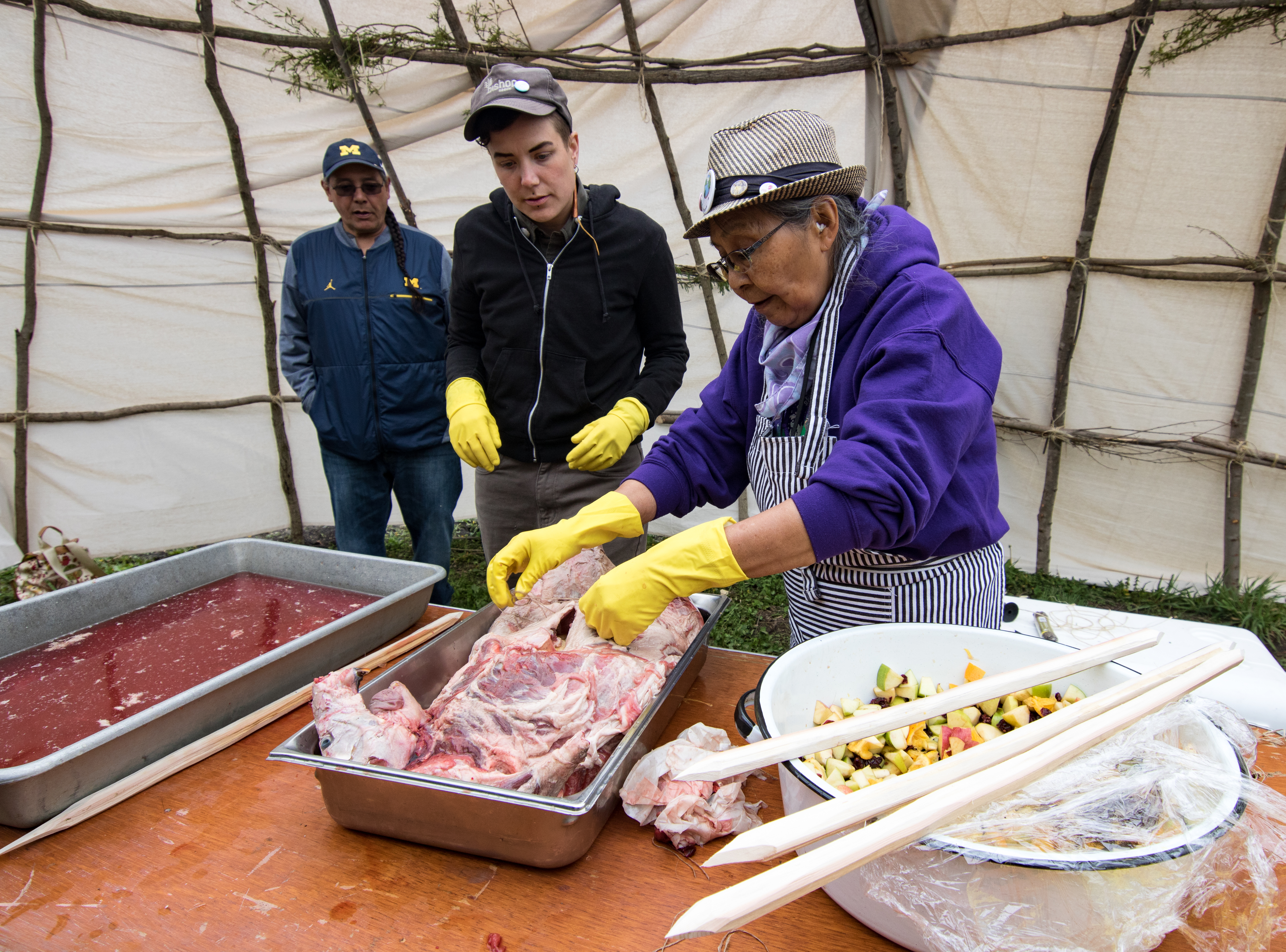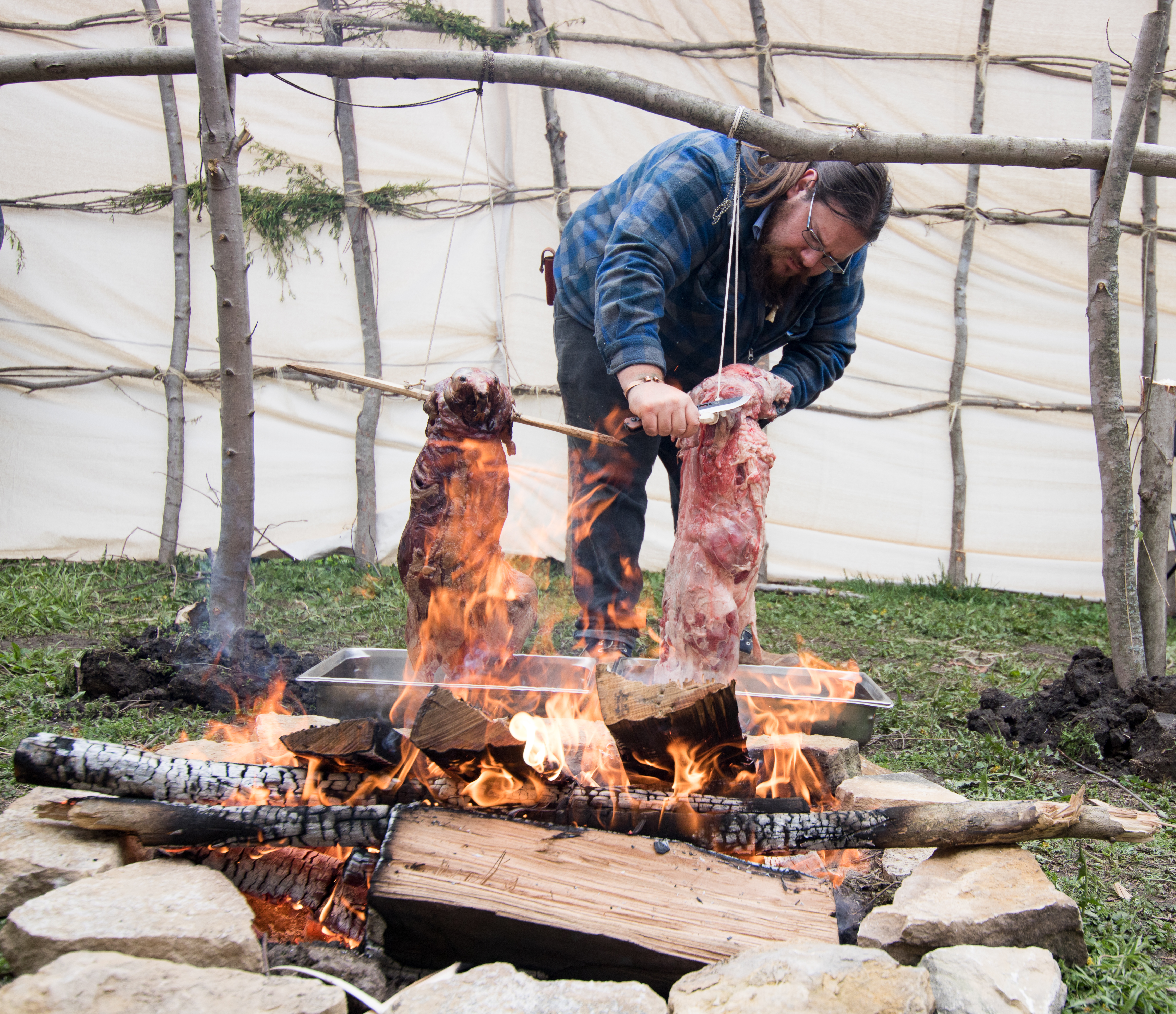 In addition to all of the cooking going on in the kitchens, outside Daisy Kosta, a Cree elder, led a workshop in skinning and cooking some beavers that had been trapped locally. The beavers were stuffed with apple chunks and slow roasted over the fire.