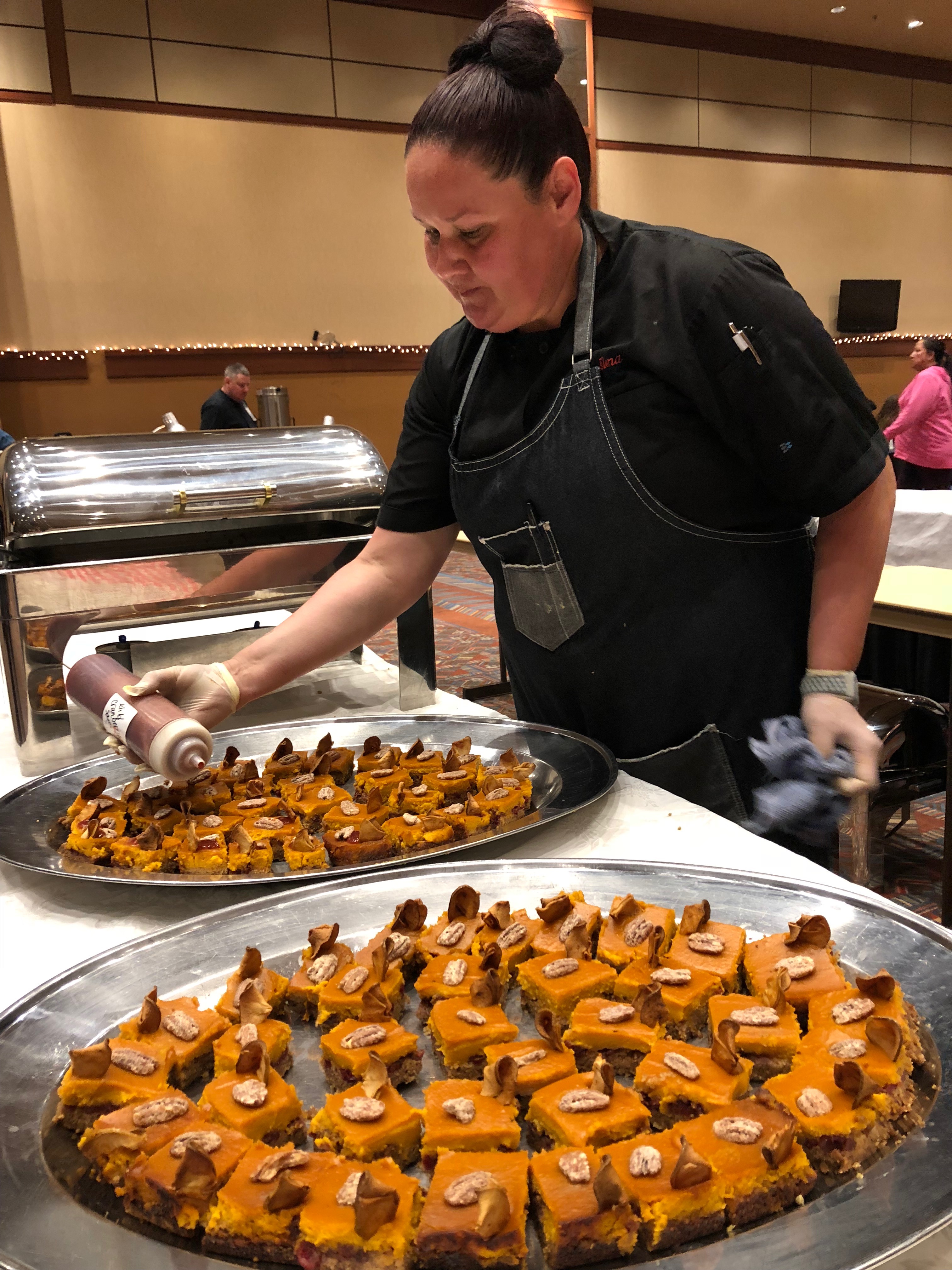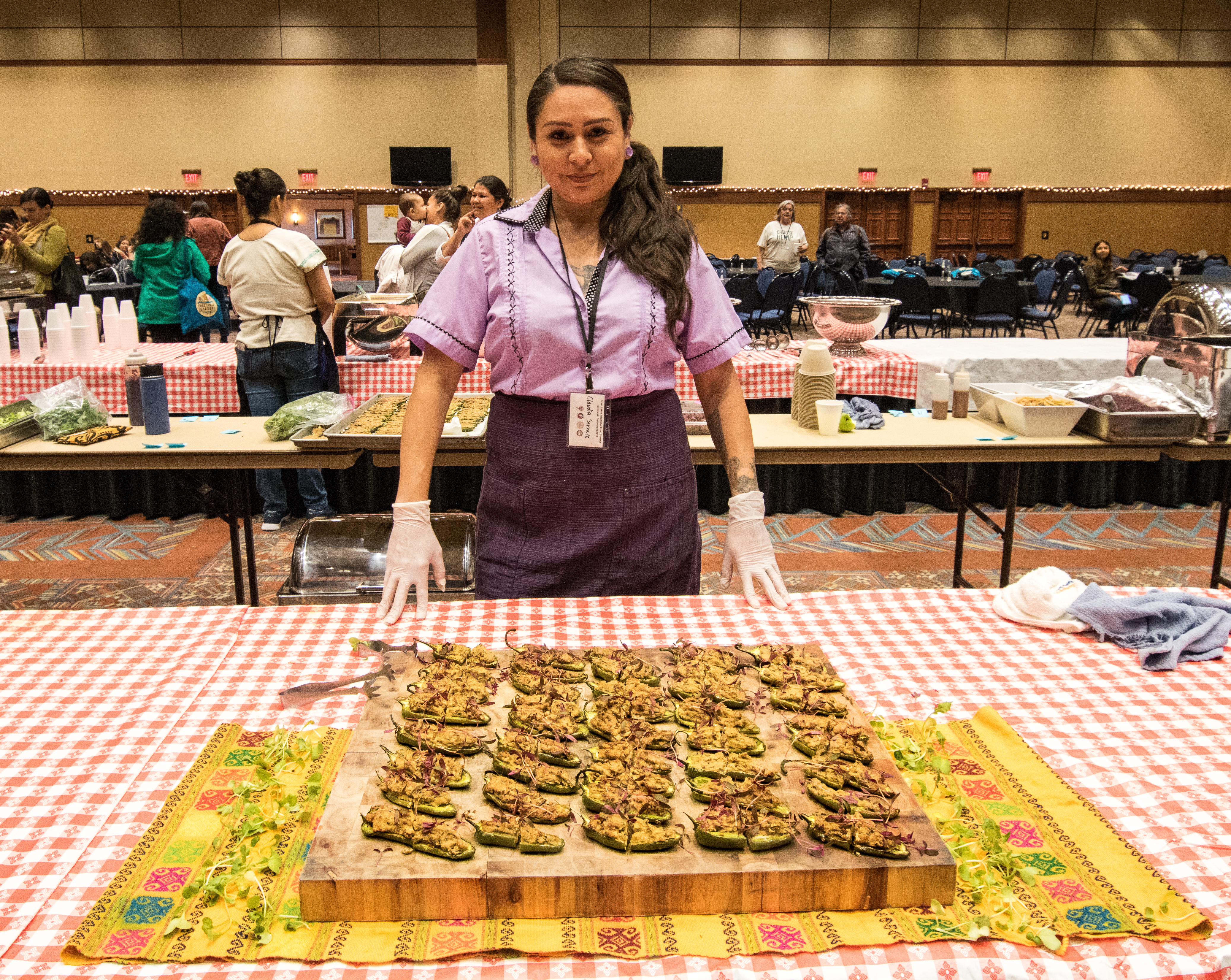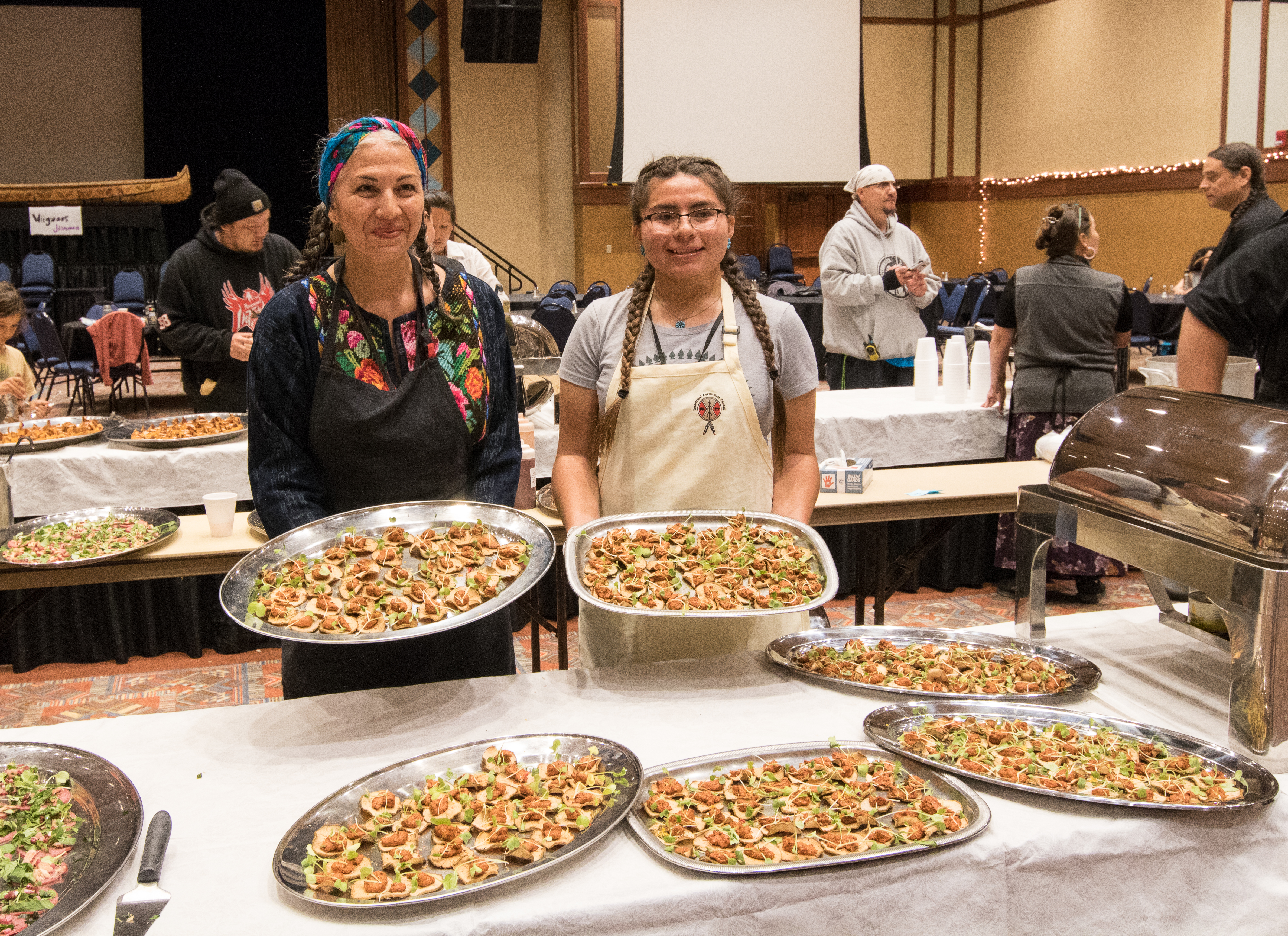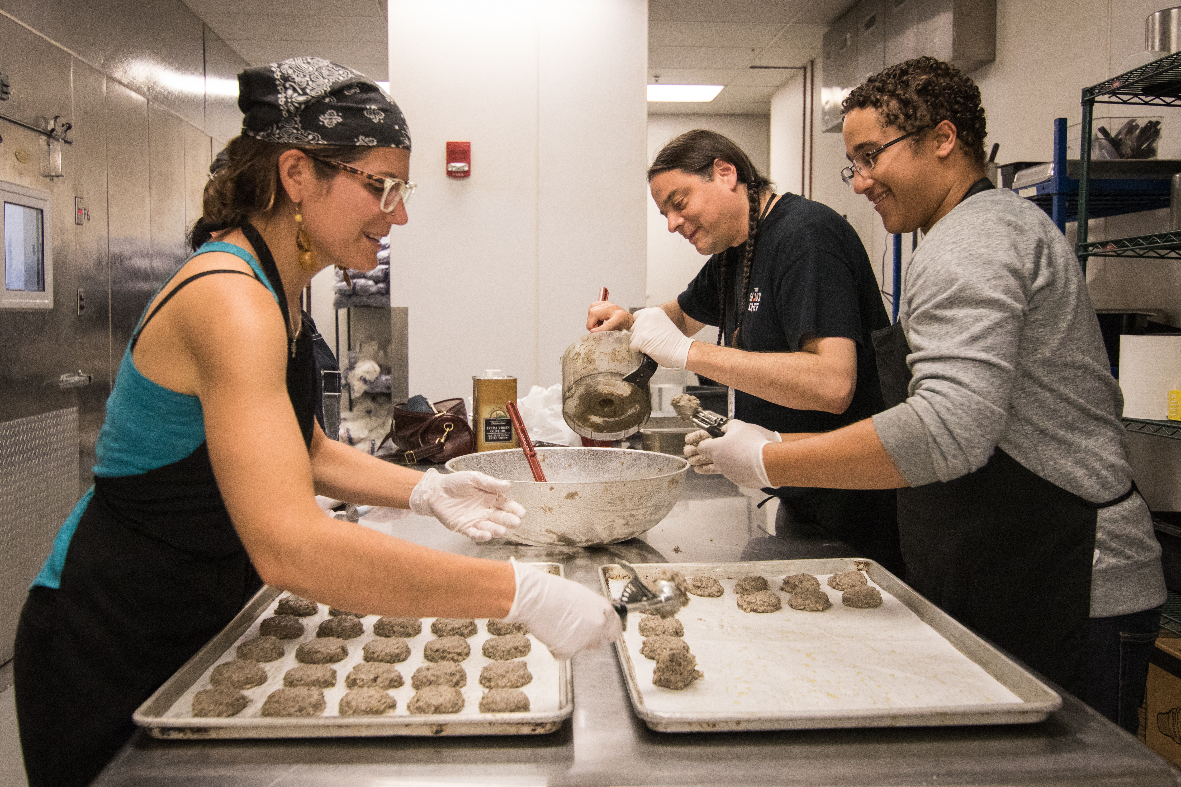 There was also a constant flurry of activity in the kitchen to make sure everyone got fed three meals a day! Below we have Maizie with blue corn mush; Claudia with wild rice and cashew cheese stuffed peppers; Reilley with fried smelt, Sam with venison salami, pickled ramps and smoked steelhead; Tawnya with strawberry and orange drink and an assortment of berry and sweetgrass infused sorbets; Charles with blue corn dumplings and bison stew; Candy with a ‘beta carotene whip’ of parsnips and carrots; Felicia with dried apples with roasted red pepper and walnut topping; and Elena with her ‘sas-squash’ dish– squash custard with a maple marinated apple chip, candied pecans and wild cranberries.