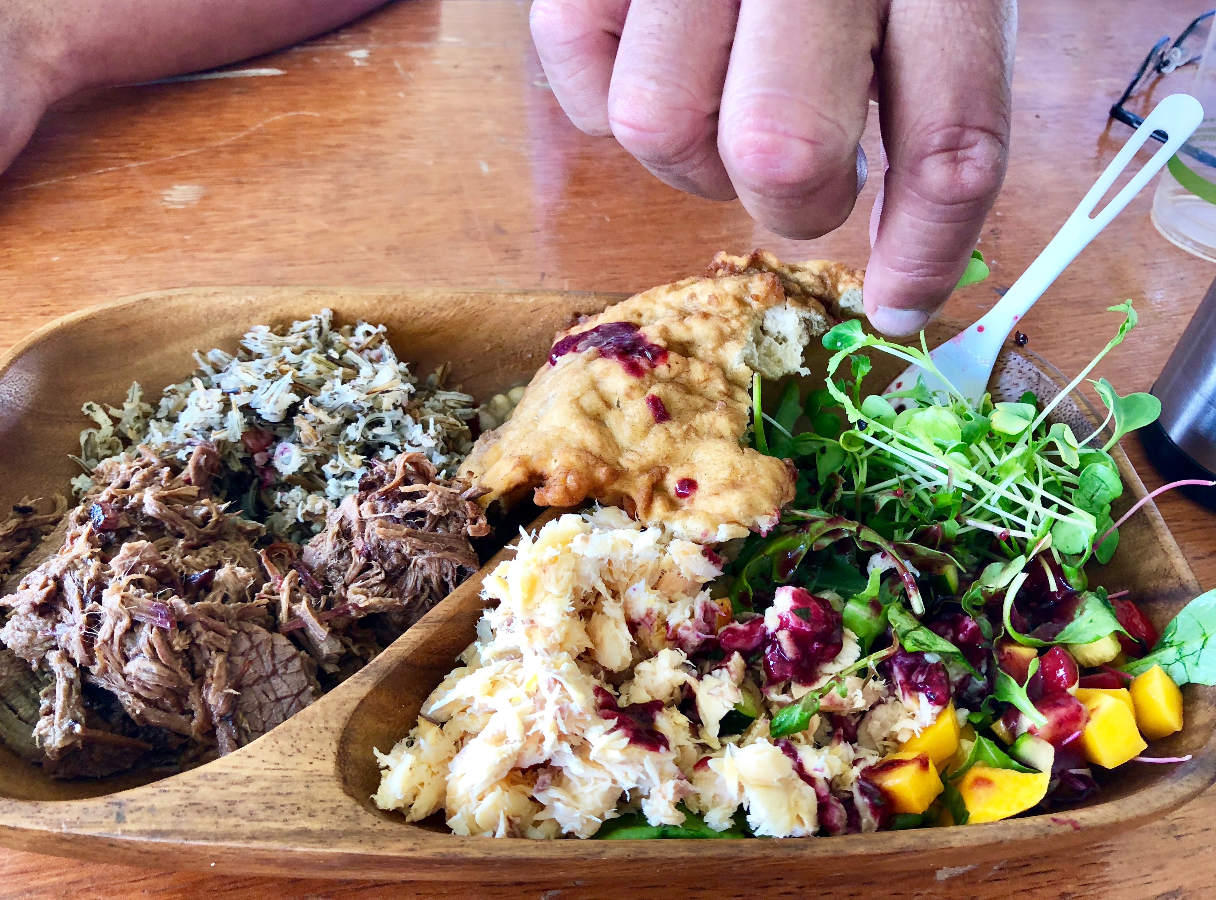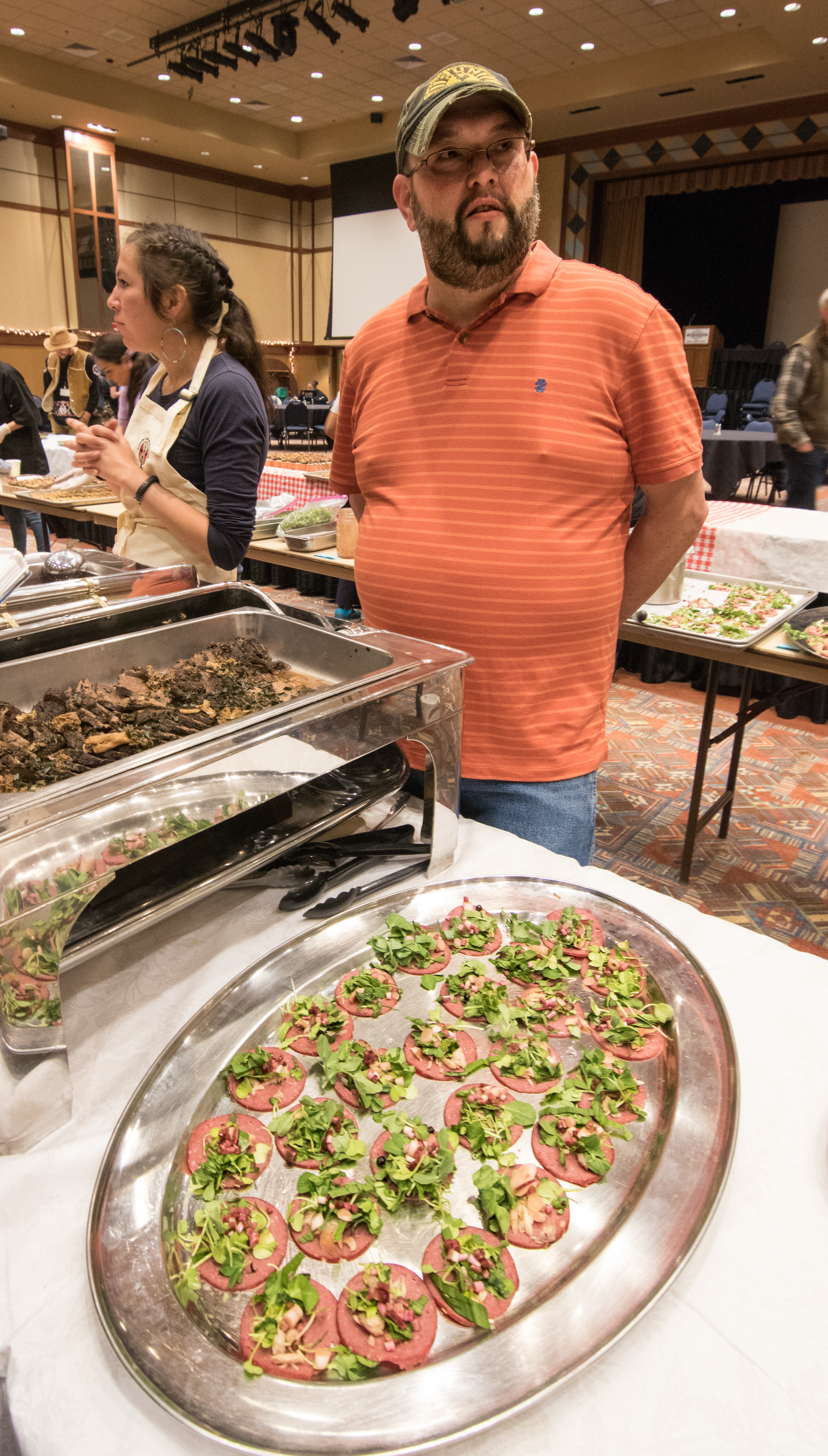 buffalo meat, wild rice, smoked fish, fry bread, berry sauce, and a squash and micro greens salad. A little taste of Ben Jacob’s Tocabe restaurant at the food summit. Photo by Elizabeth Hoover (while someone tries to rob me of my lunch)