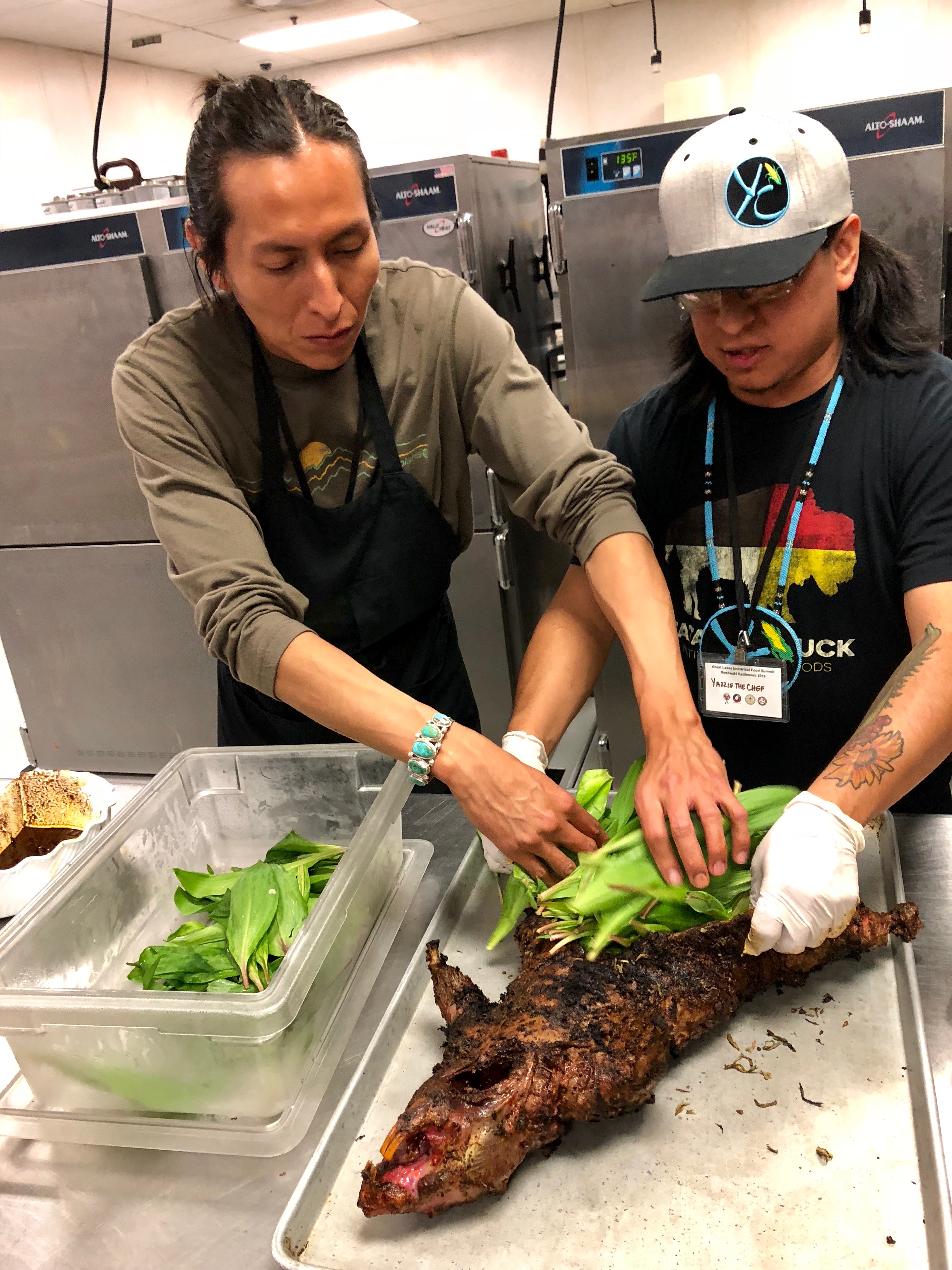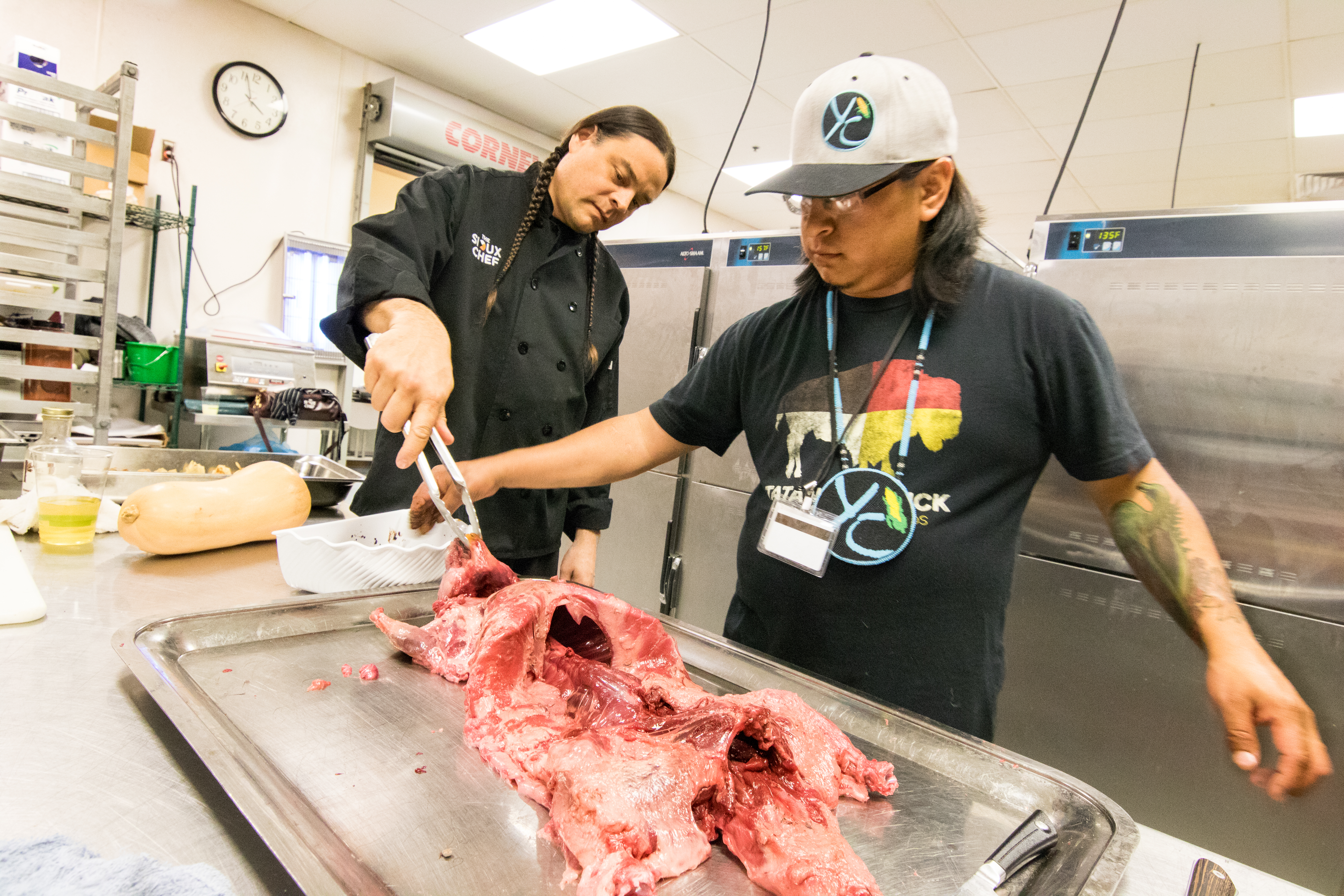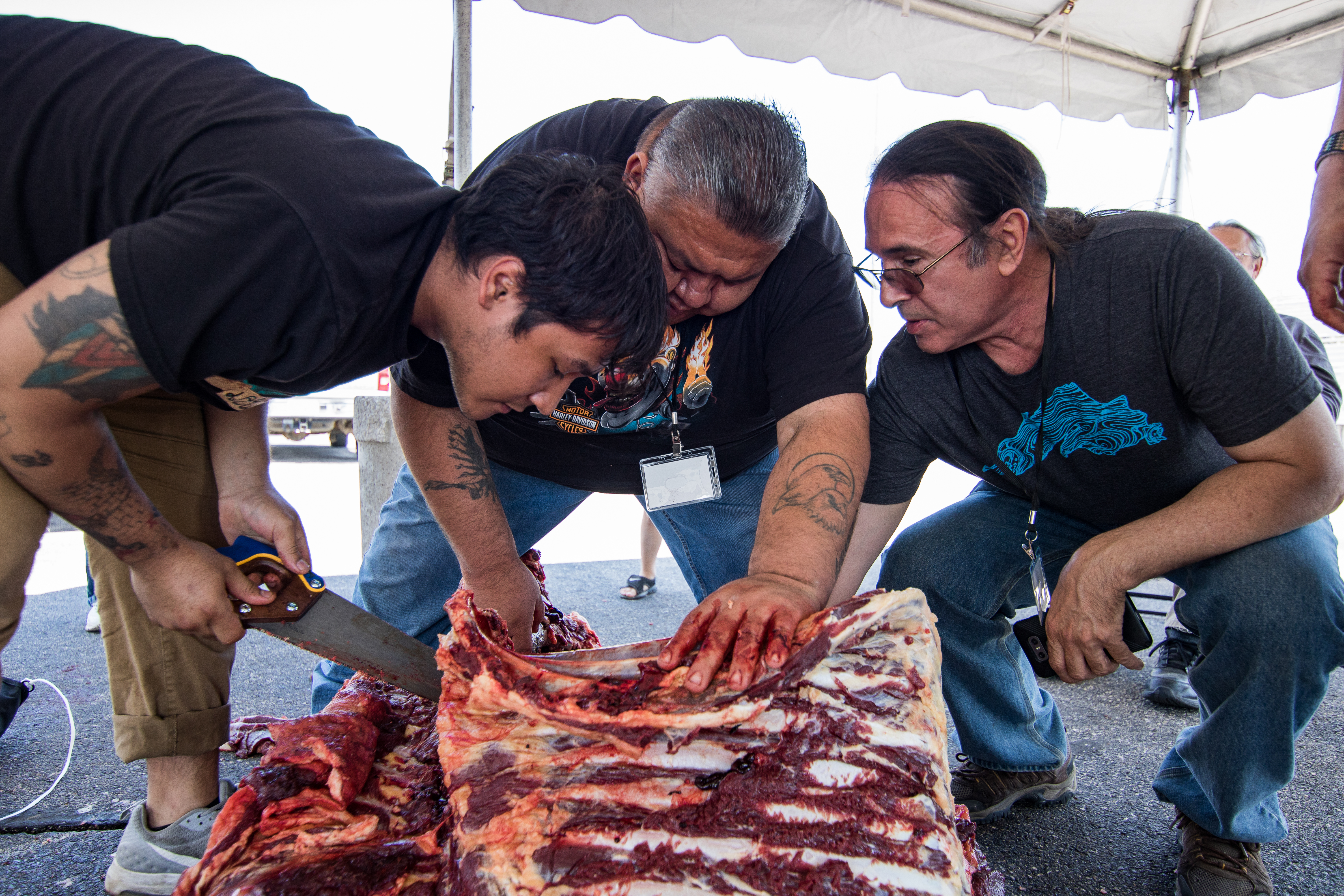 Kyle Jim and Sean Sherman helping Lisa Iron Cloud to cut the haunch away from the rest of the buffalo body. Photo by Elizabeth hoover