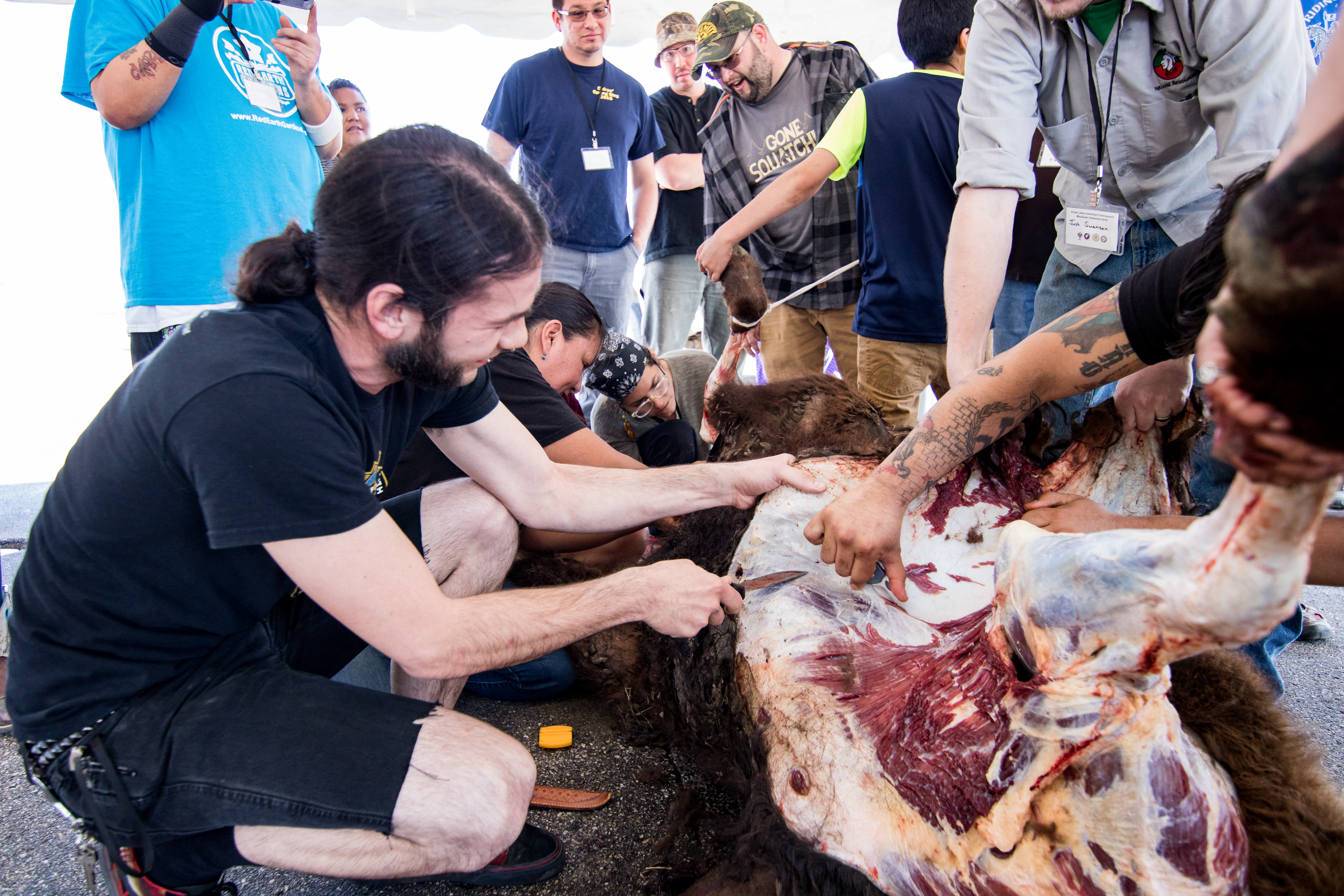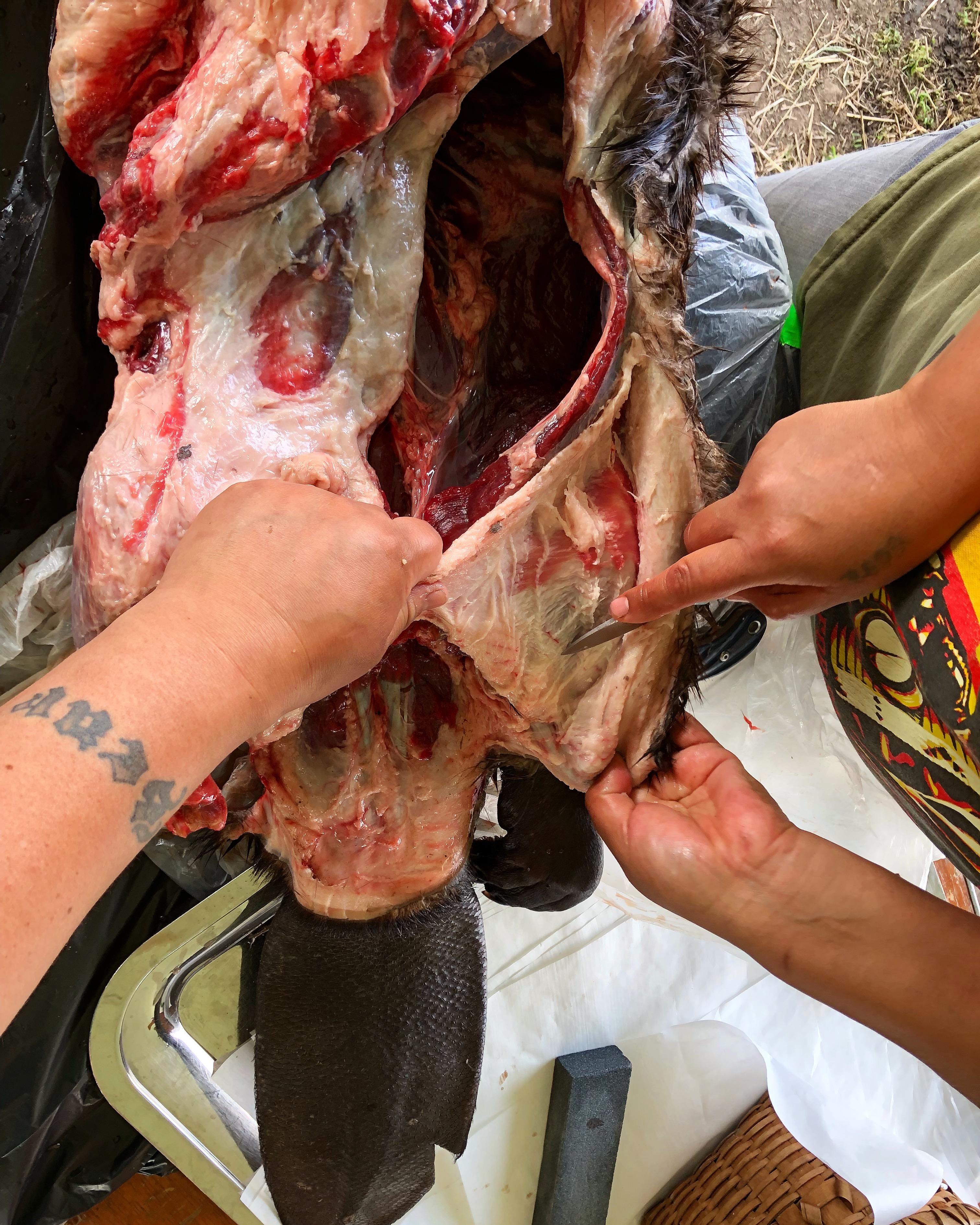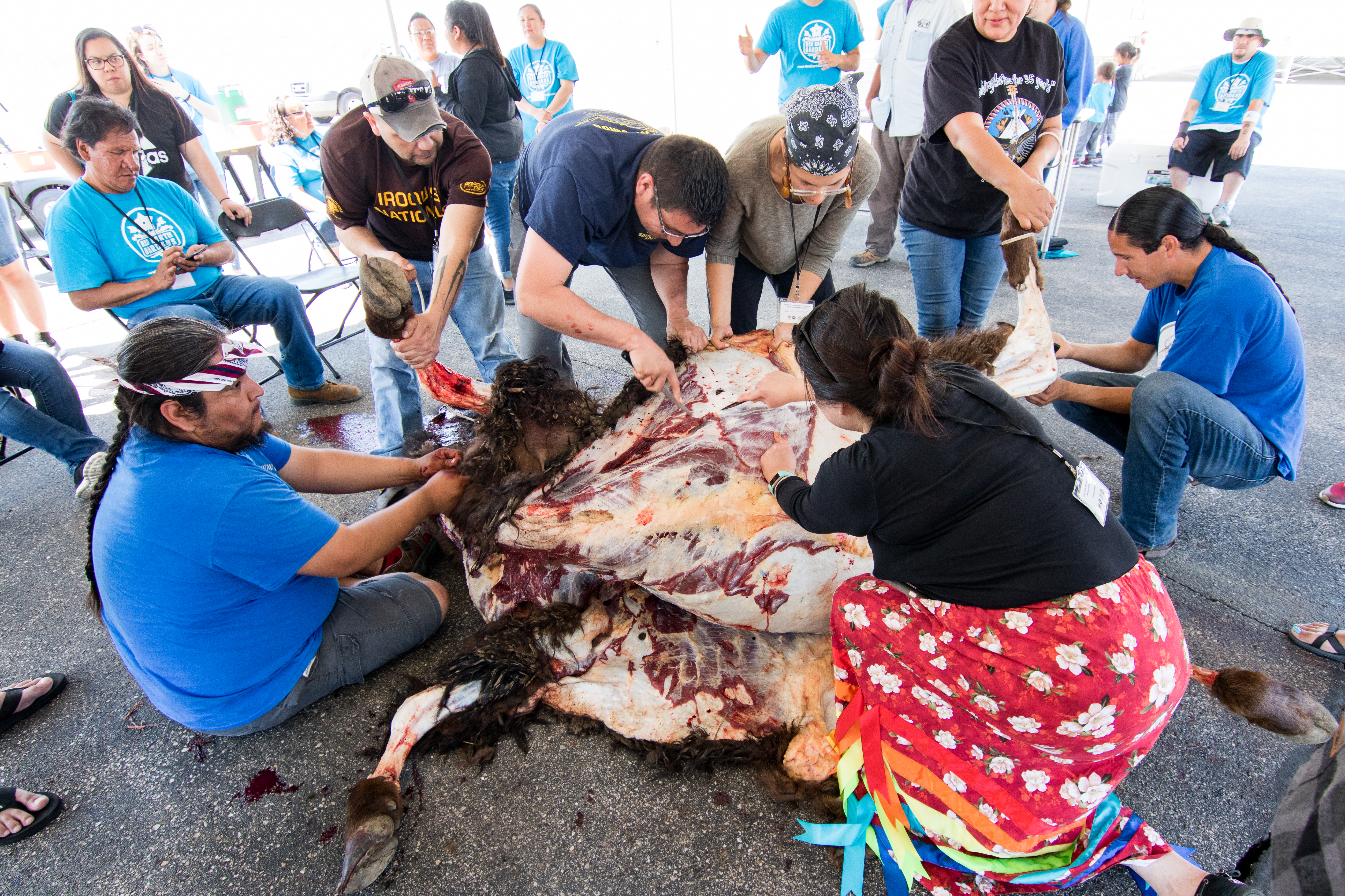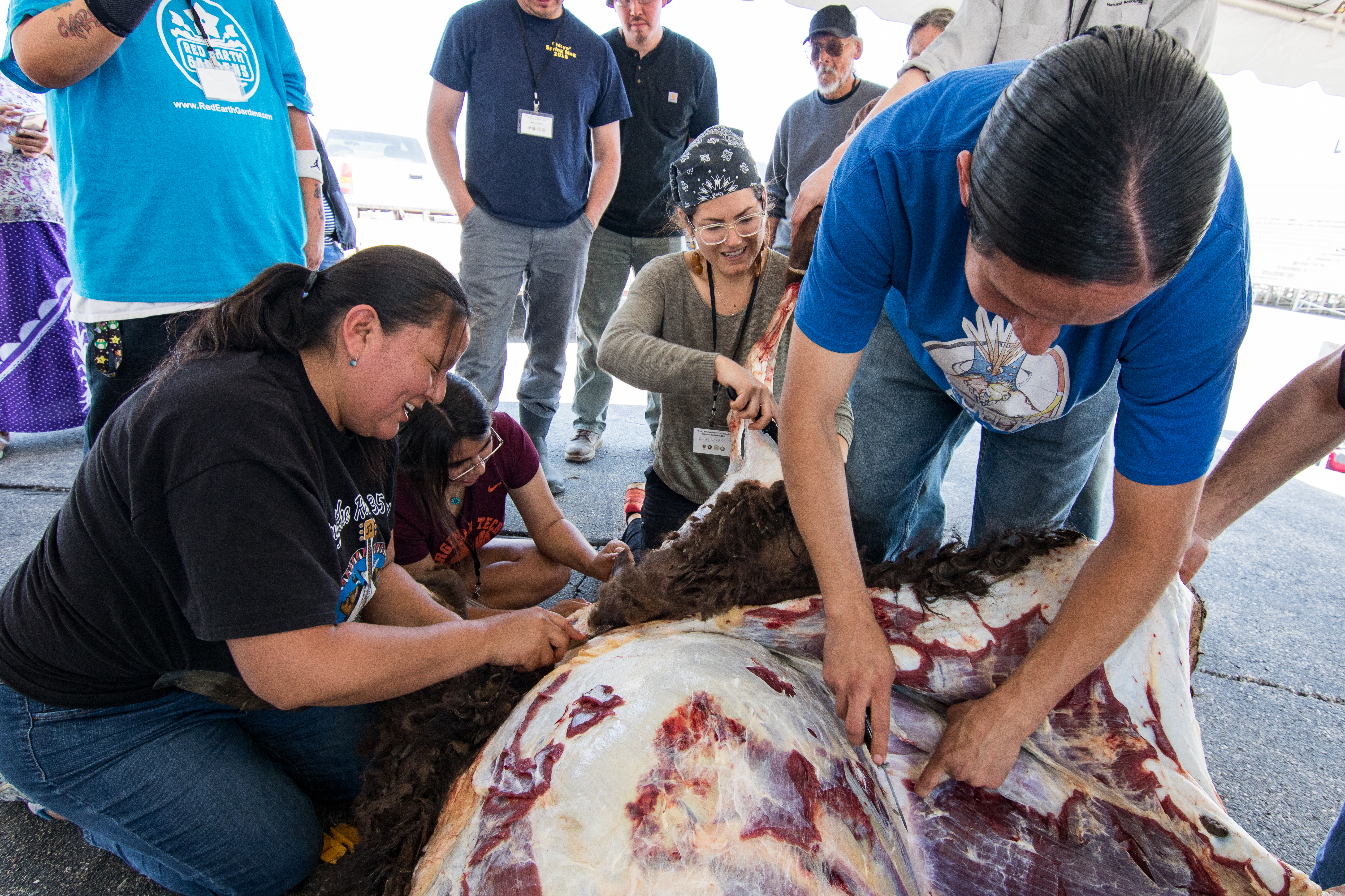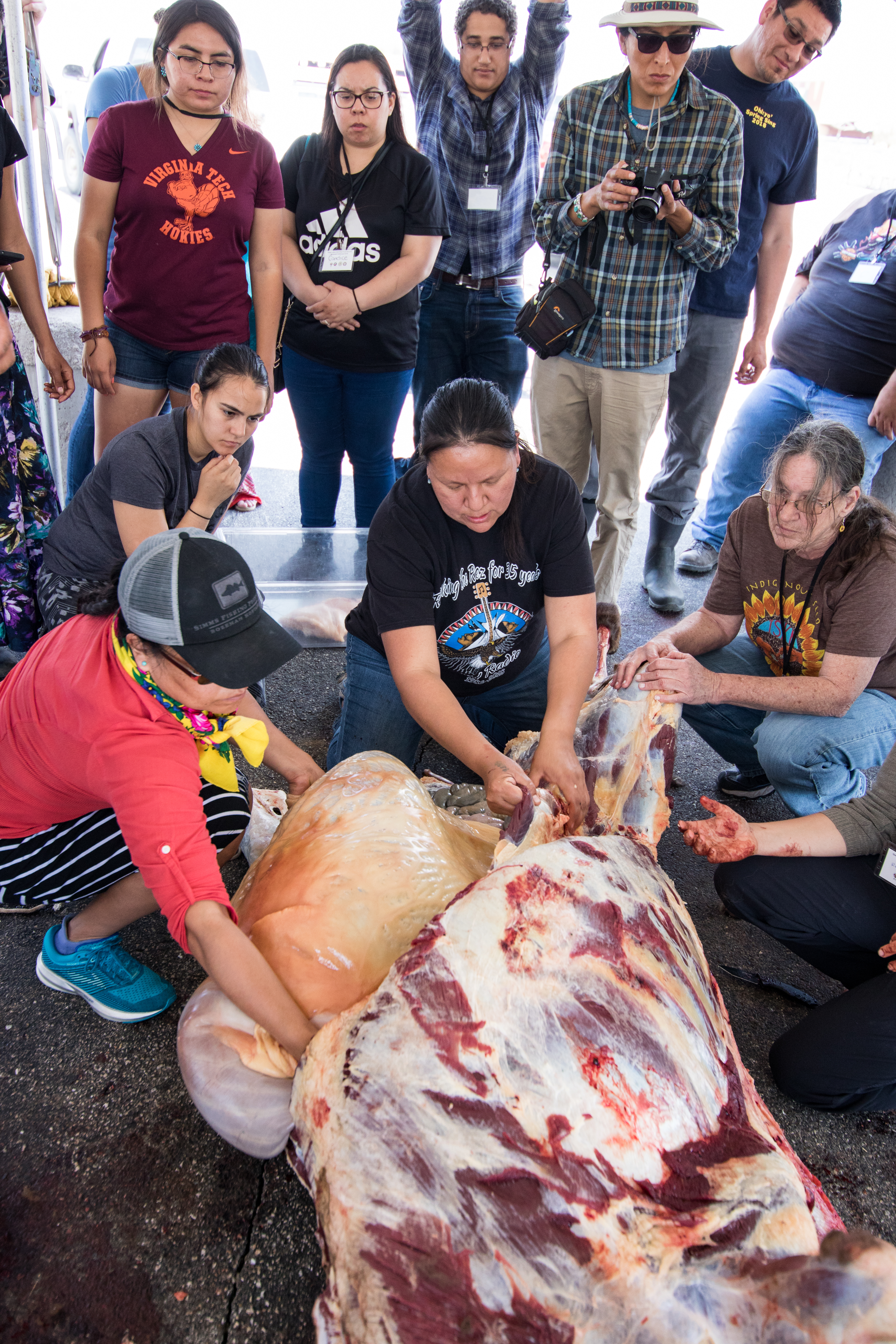 Then the process of skinning began under the instruction of Lisa Iron Cloud (black t-shirt). Photo by Elizabeth Hoover