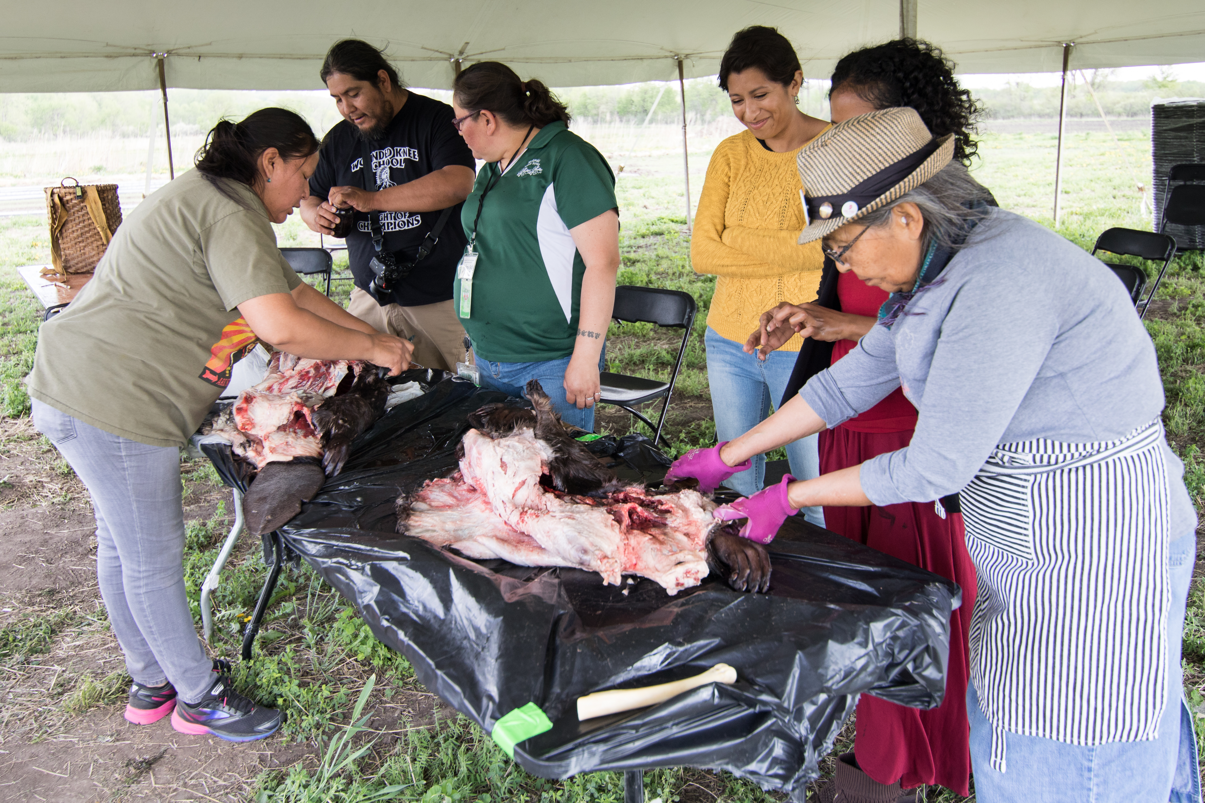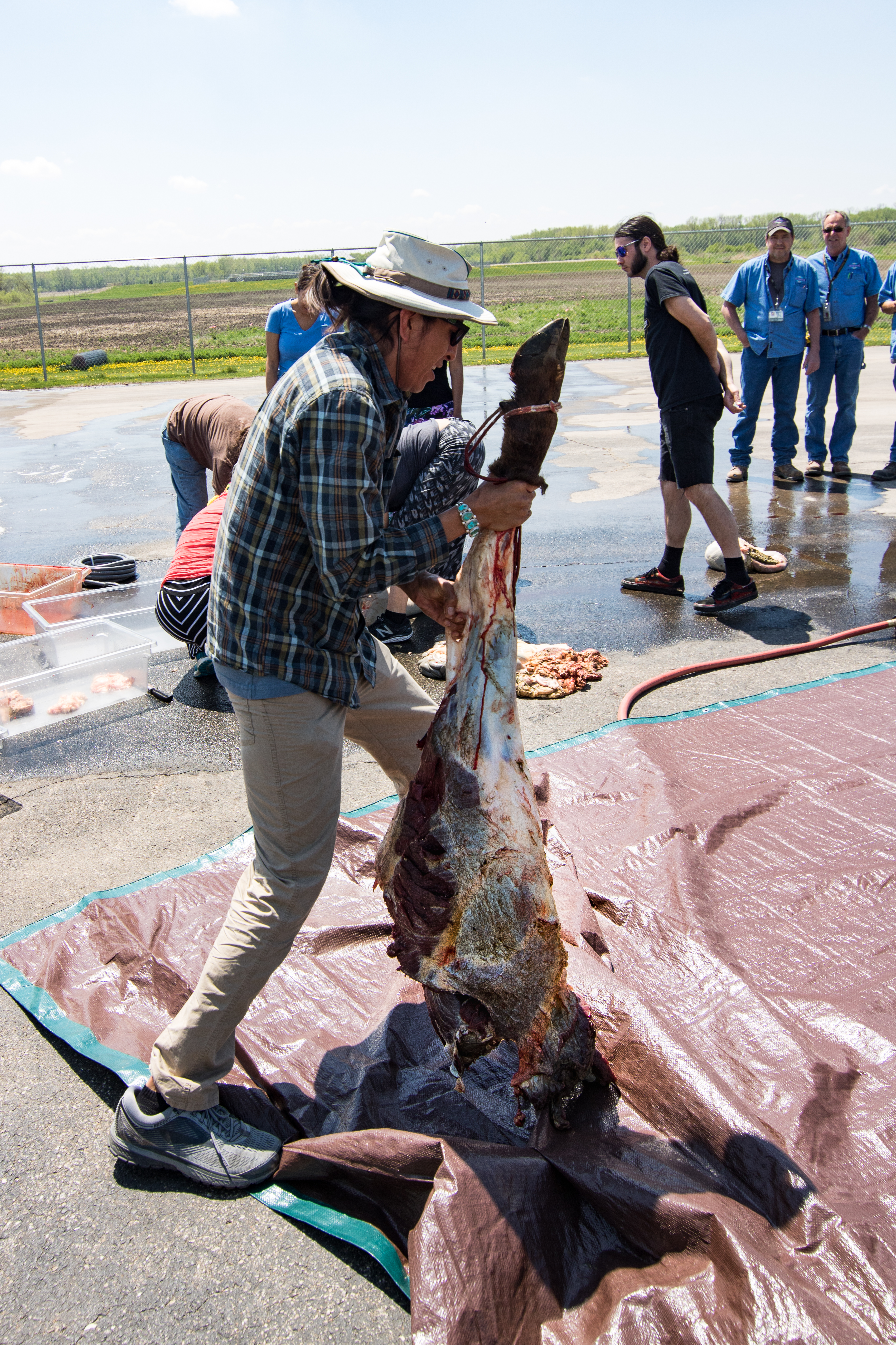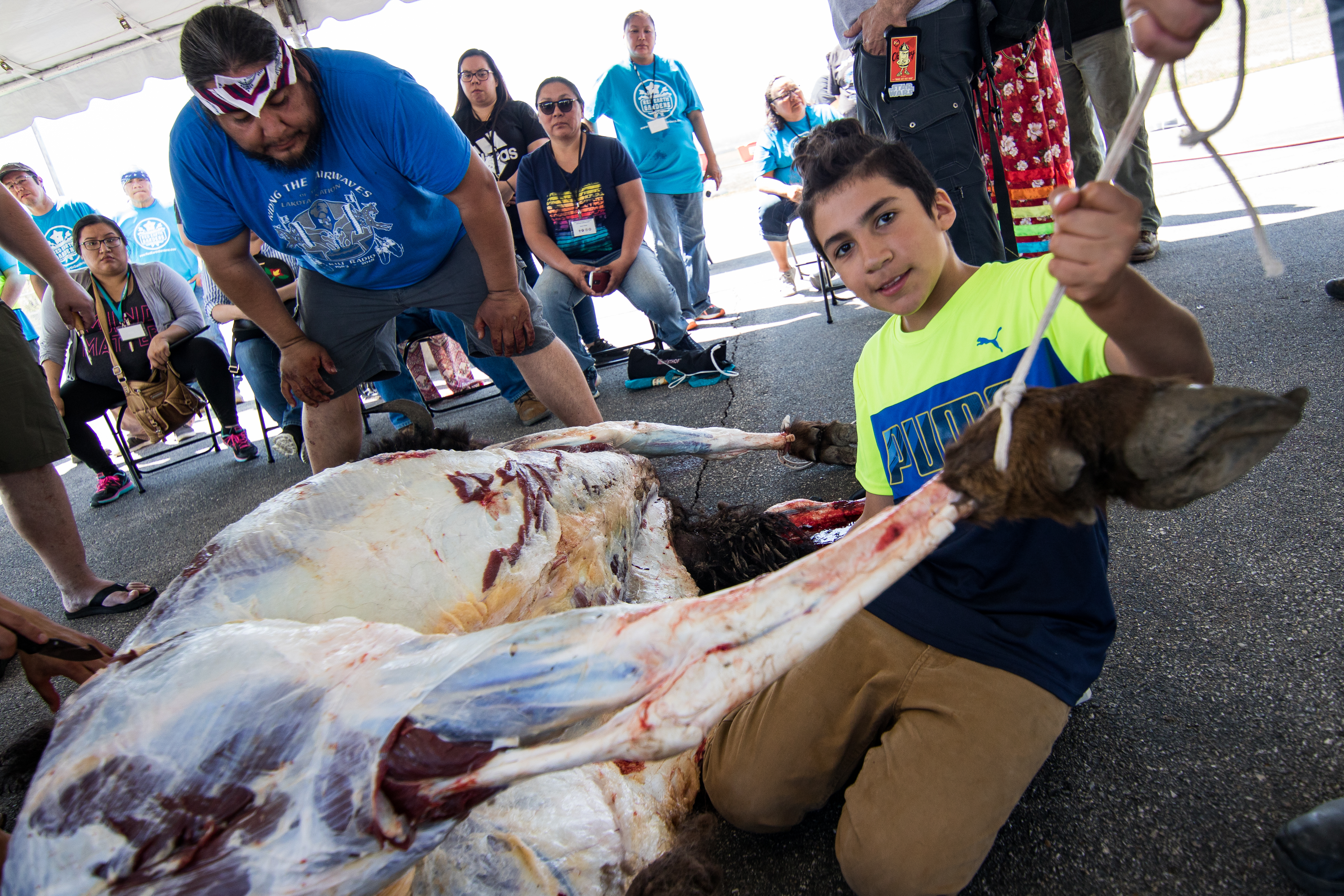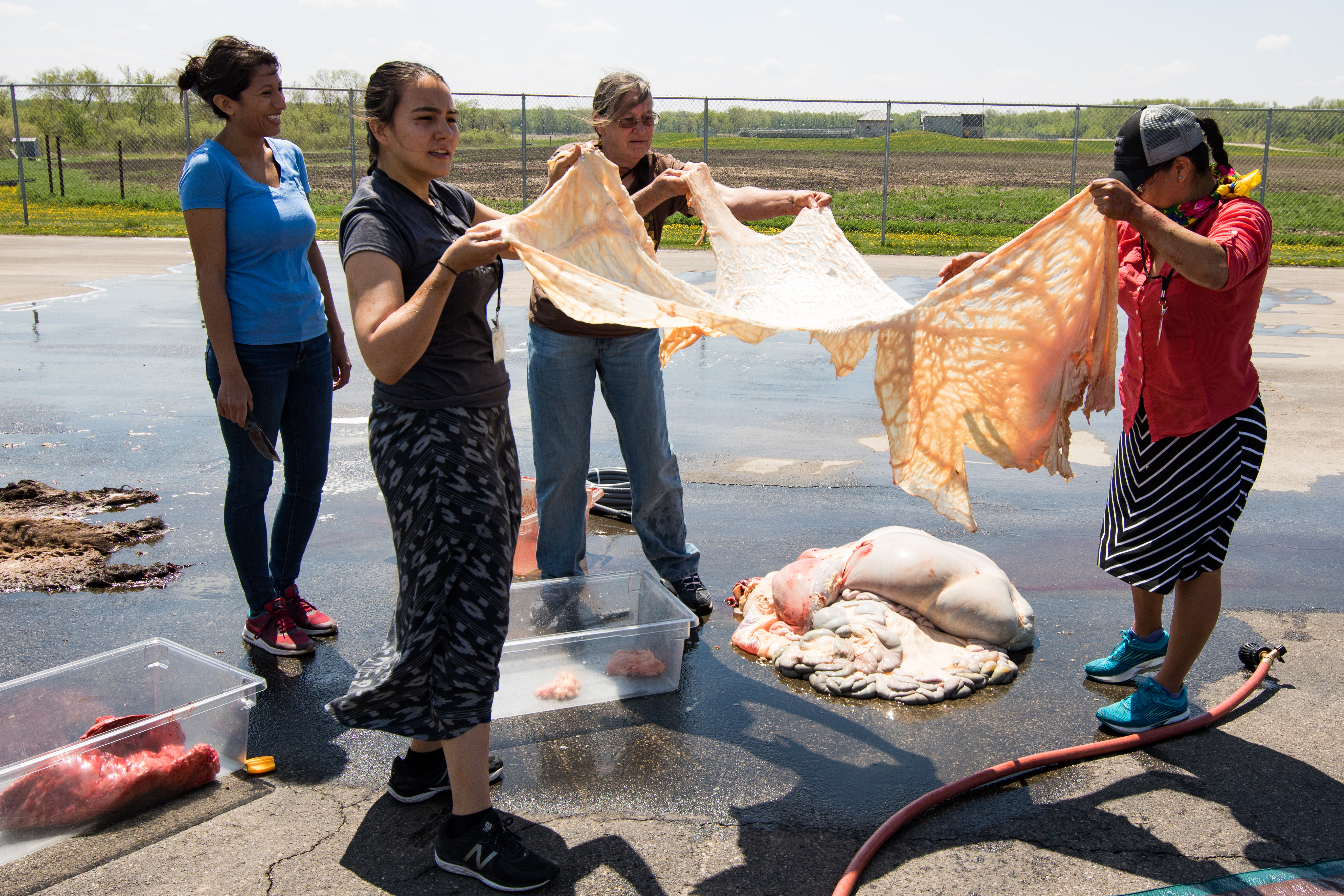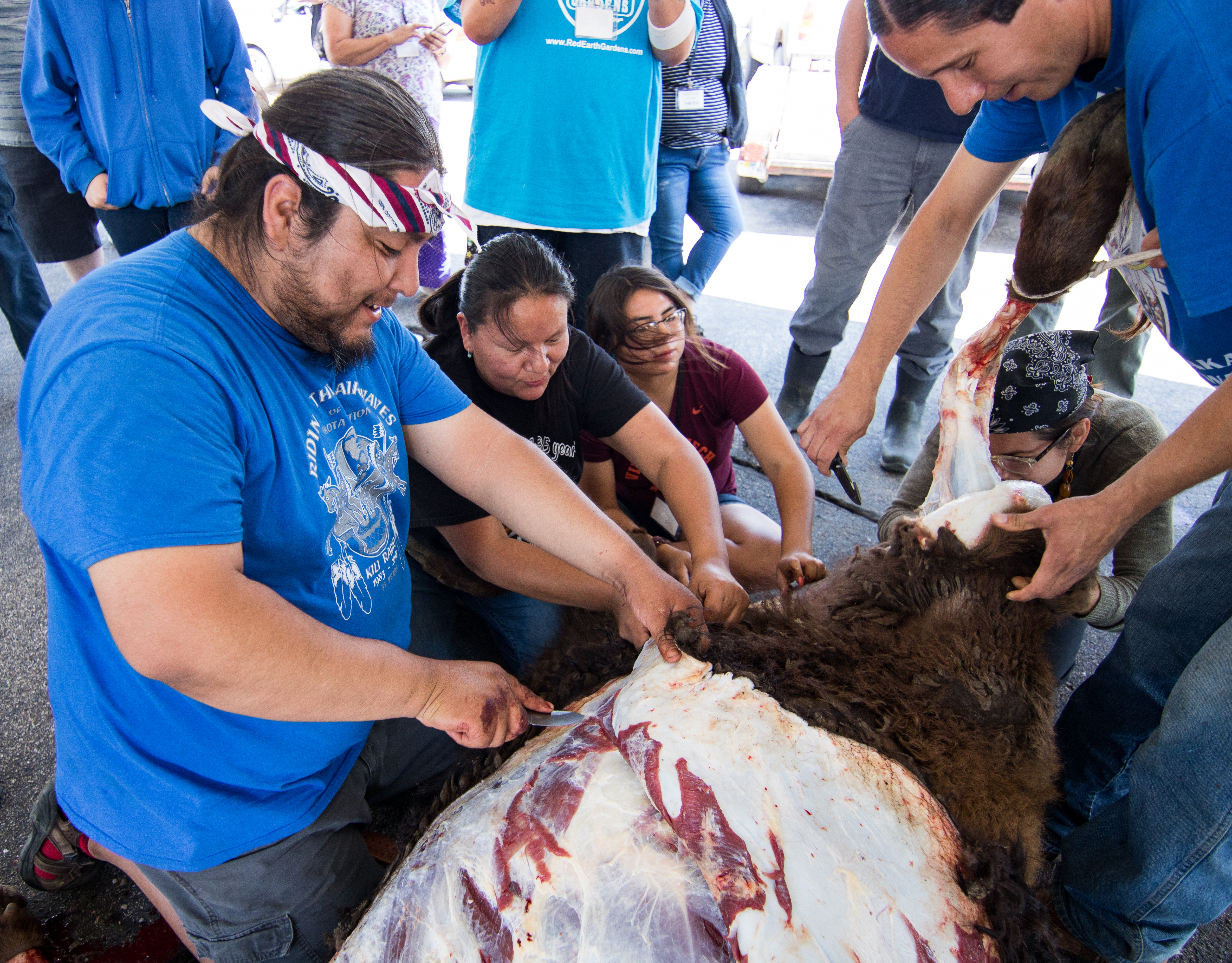 Then the process of skinning began under the instruction of Lisa Iron Cloud (black t-shirt). Photo by Elizabeth Hoover