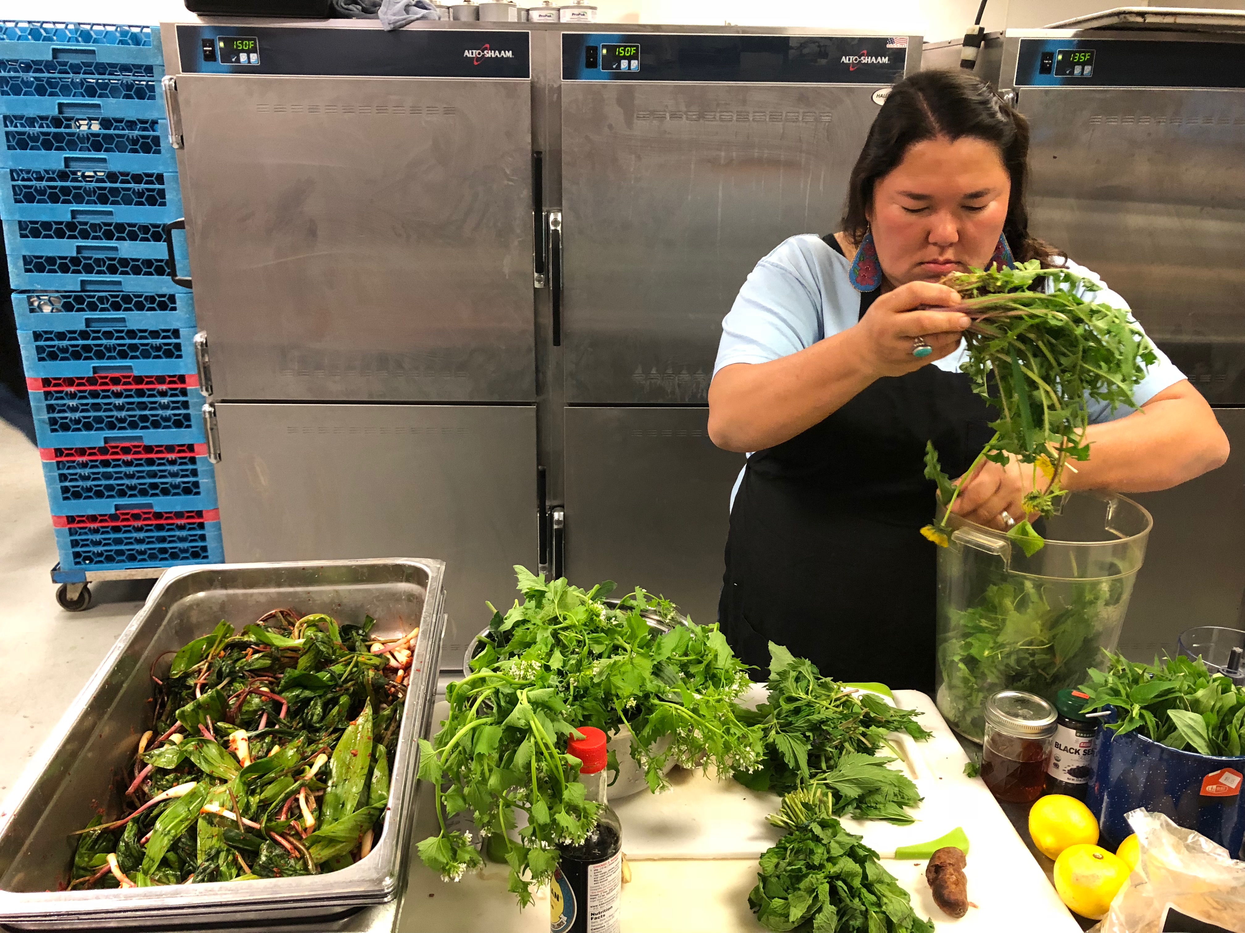 Elena Terry stirring a milkweed blossom stew with amaranth flour dumplings. Photo by Elizabeth Hoover