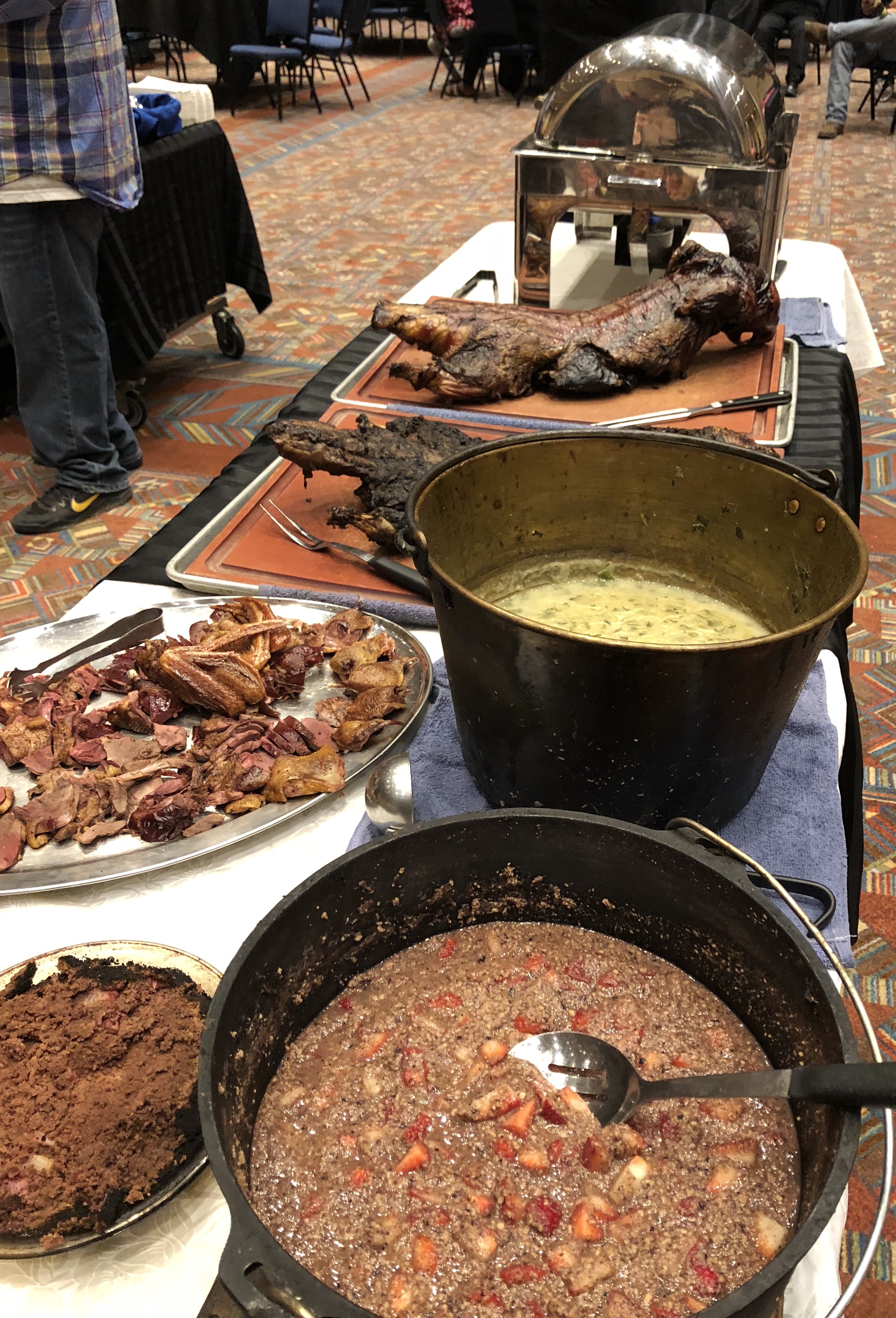 Feast of traditional foods! bottom left, acorn bread that Caleb cooked in a cast iron pot with coals; corn mush with strawberries; goose, squirrel and milkweed soup; and roasted beavers. Photo by Elizabeth Hoover