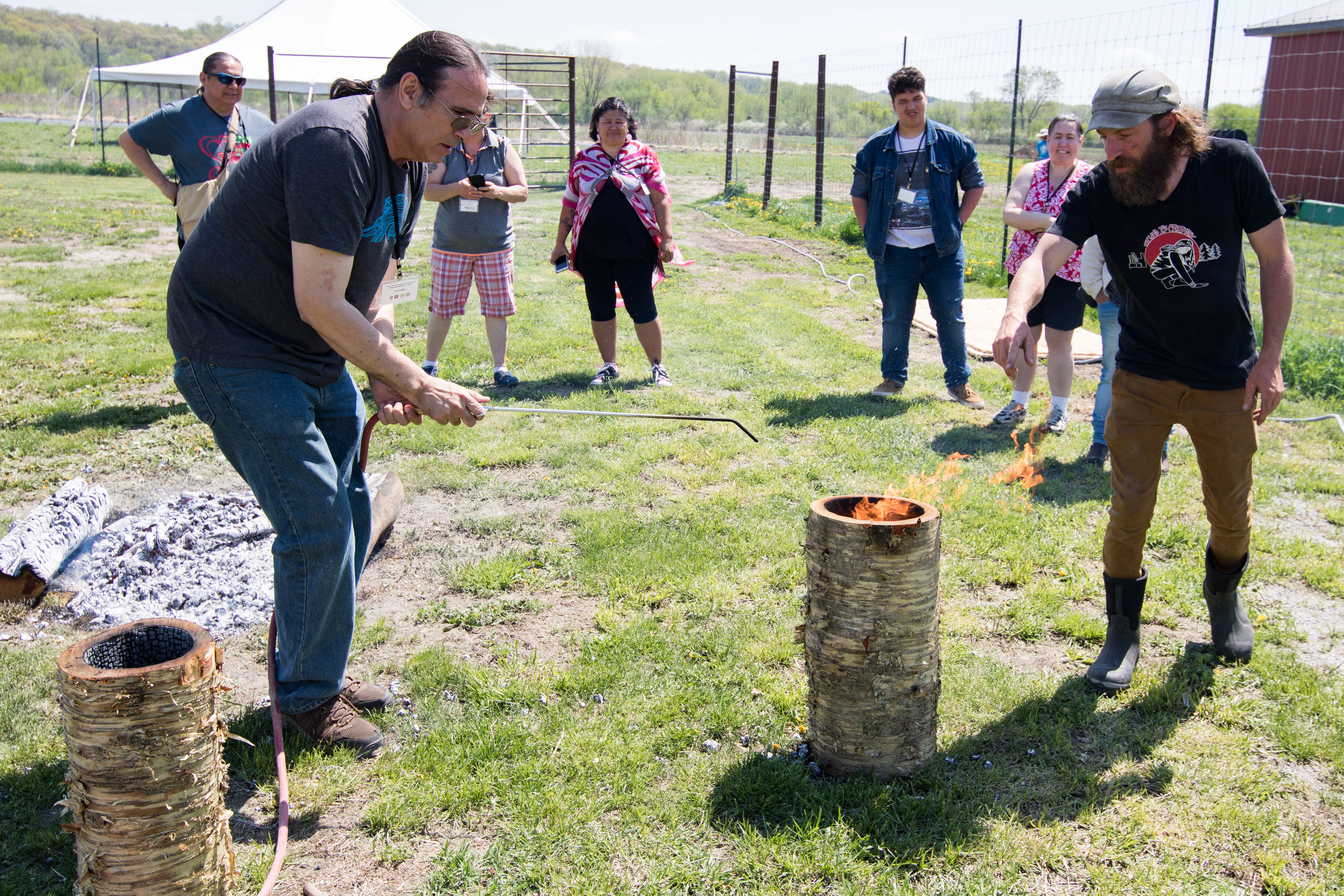 Paul DeMain fanning the flames inside the bootagen in process. Photo by Elizabeth Hoover