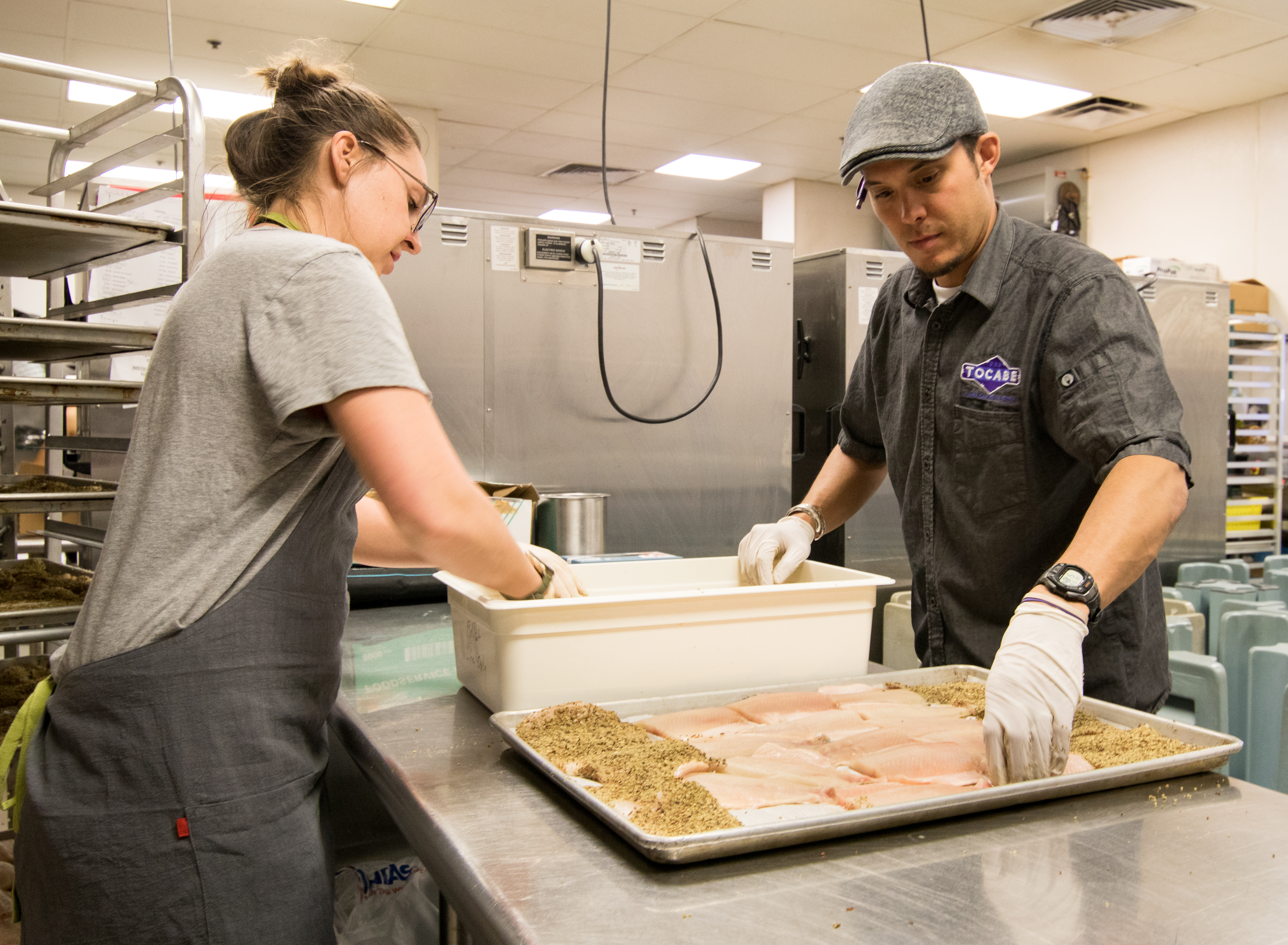Sean and Brian preparing one of the beavers to be cooked in the kitchen. Brian rubbed it down with spices, grilled it, then stuffed it and baked it. Photo by Elizabeth Hoover