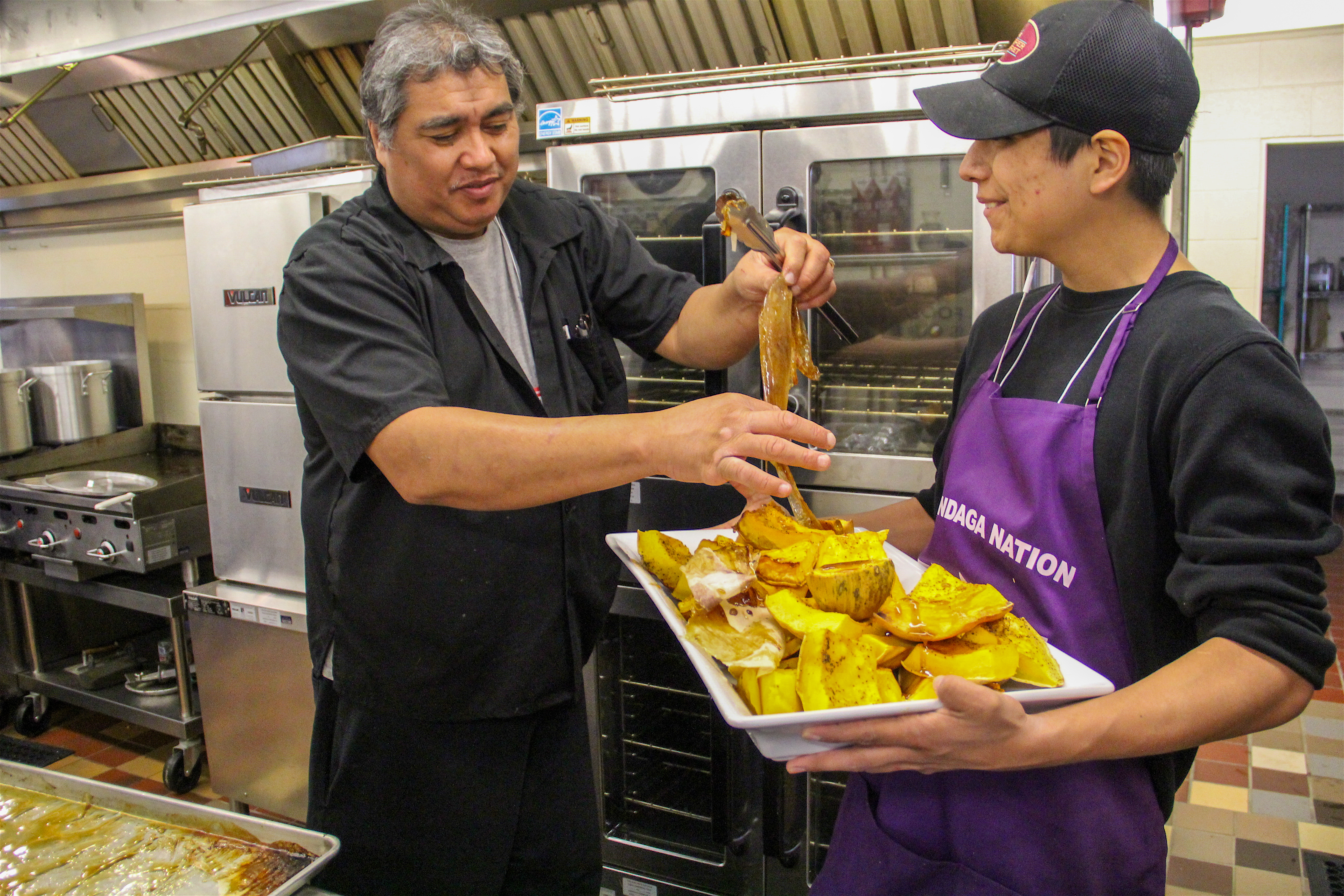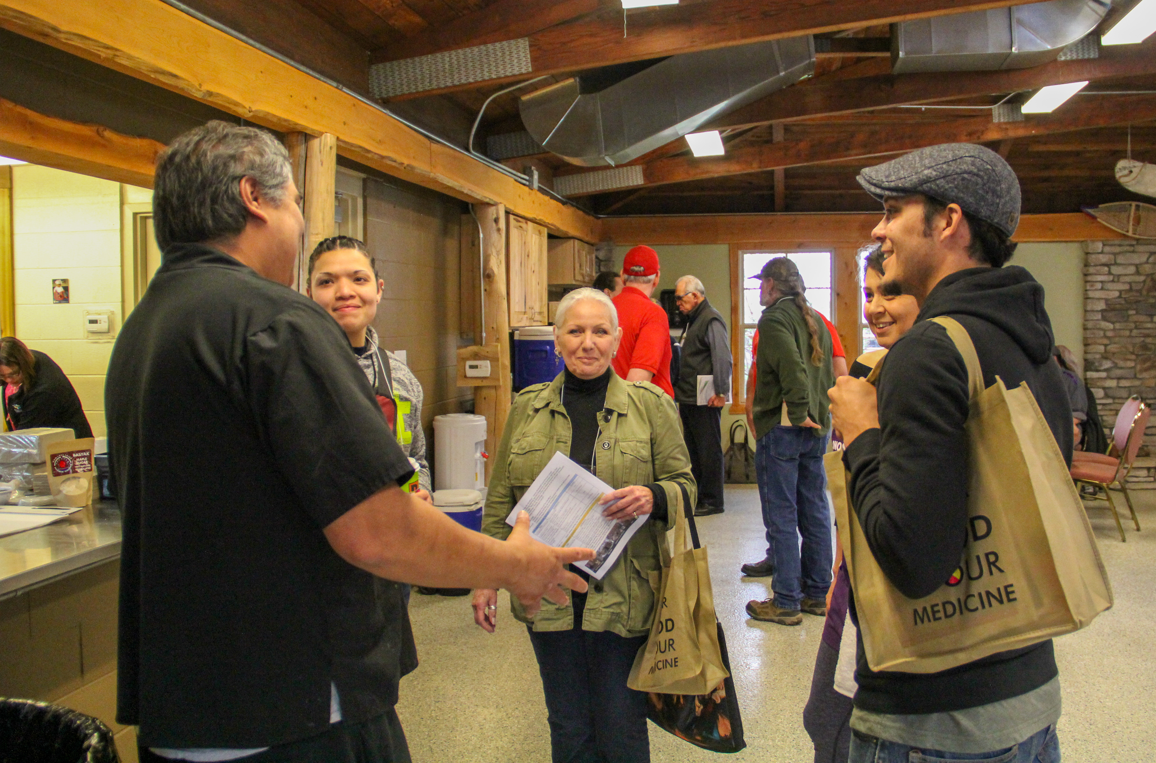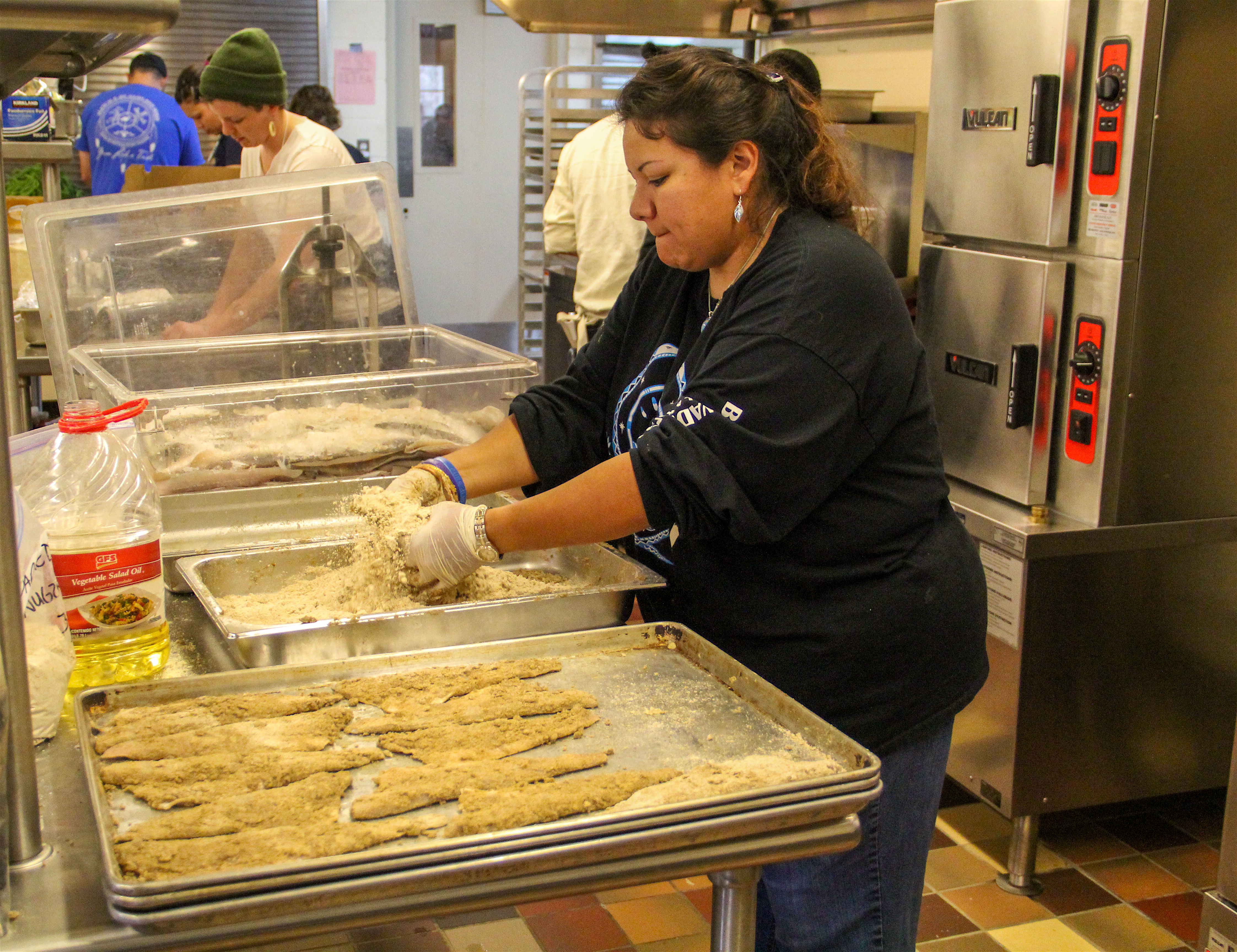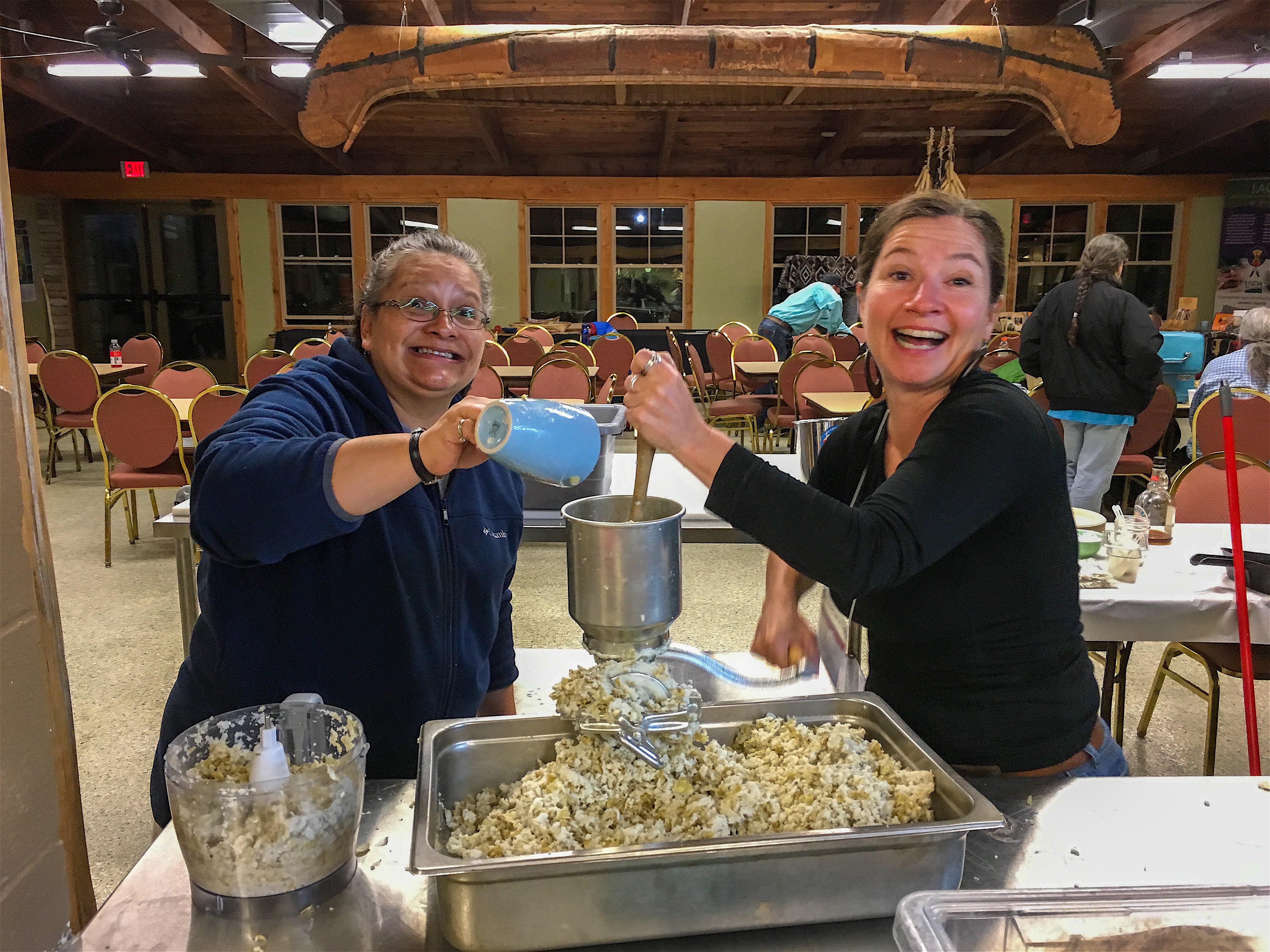 Chefs Arlie Doxtator, Andrea Murdoch, Loretta Barett Oden and Ben Jacobs visiting in the dining hallAndrea Murdoch and Claudia Serrato preparing foodArlie Doxtator removing squash skinsAngela Ferguson preparing traditional boiled corn breadbreading walleye from Red LakeAnna Sigrithur preparing a flat bread from flour made from bark Red Lake walleye with white corn crust, and a hickory nut and pear sauce; salad w craisins and local maple vinegar; green beans; and a bread made of pine bark flour late night corn grinding!