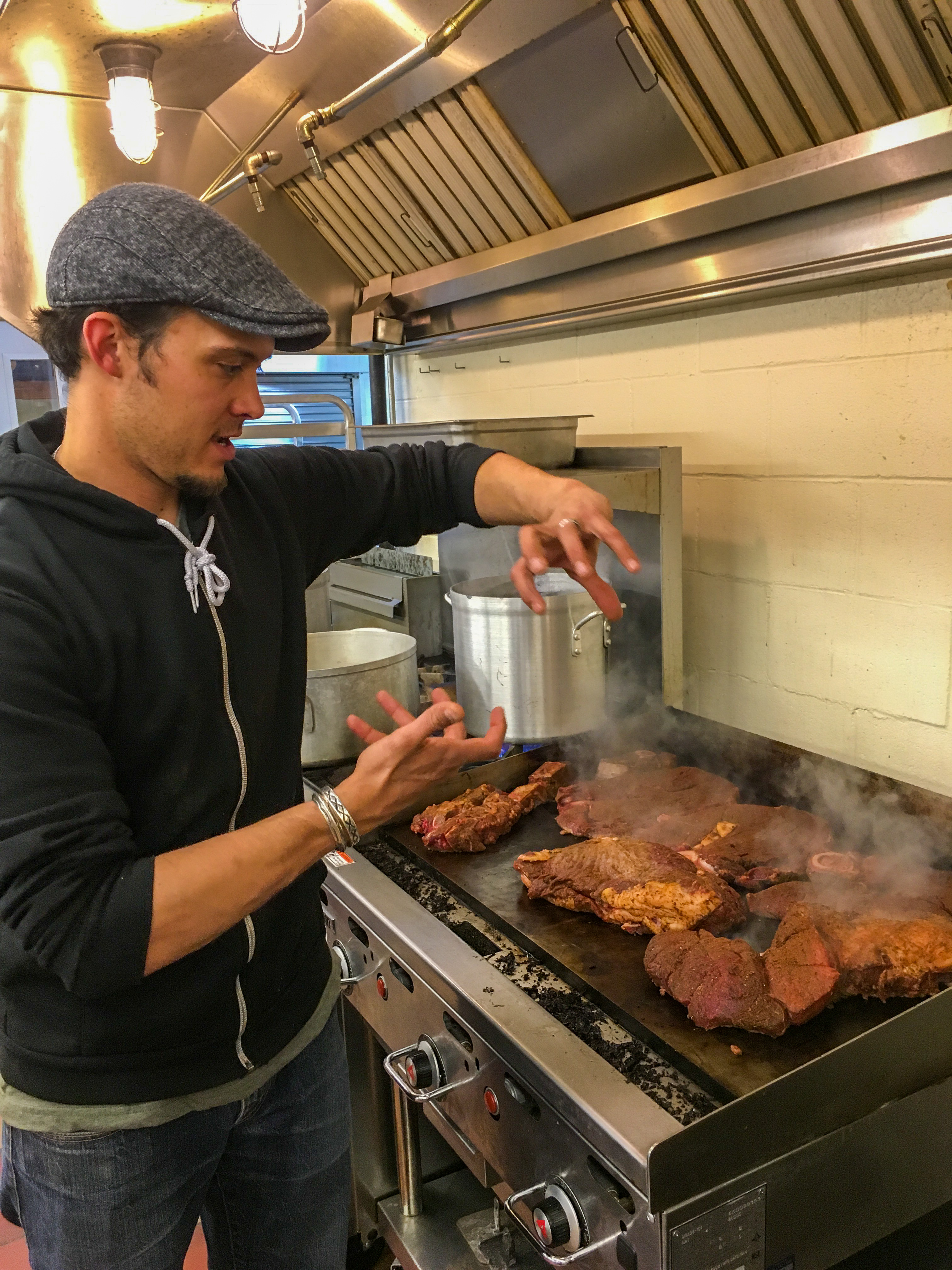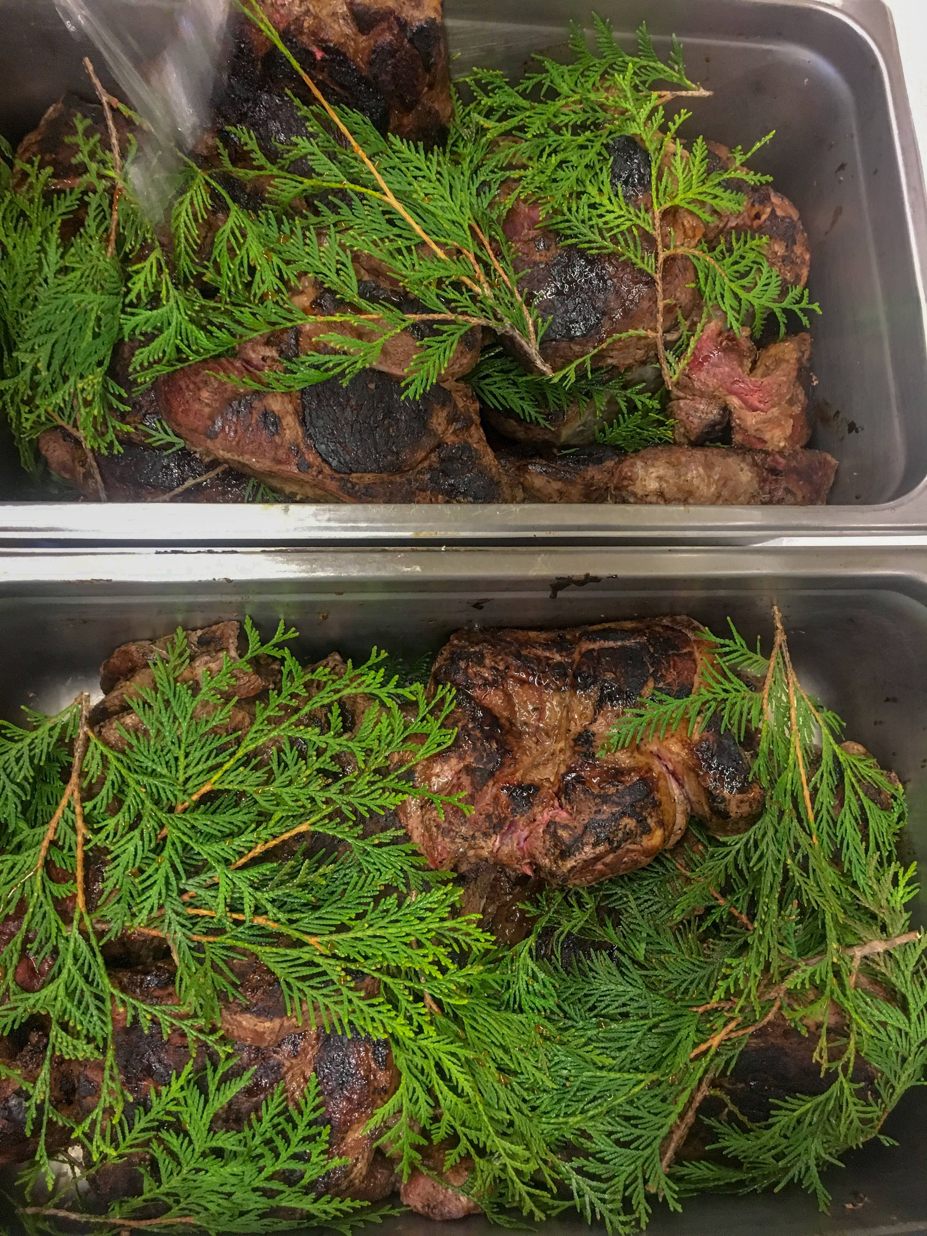 Tim Sobie from Sobie Meats led a workshop on how to deconstruct a buffalo carcass (2016). Photo by Elizabeth HooverMaizie peers on with interest as the buffalo is broken down. (2016) Photo by Elizabeth HooverBen Jacobs grilling up the freshly cut up buffalo (2016). Photo by Elizabeth HooverDan was hoping to have a sheep on site to slaughter and butcher, but that wasn’t possible the first year of the conference, so a fresh churro sheep carcass was brought in for butchering (2016).