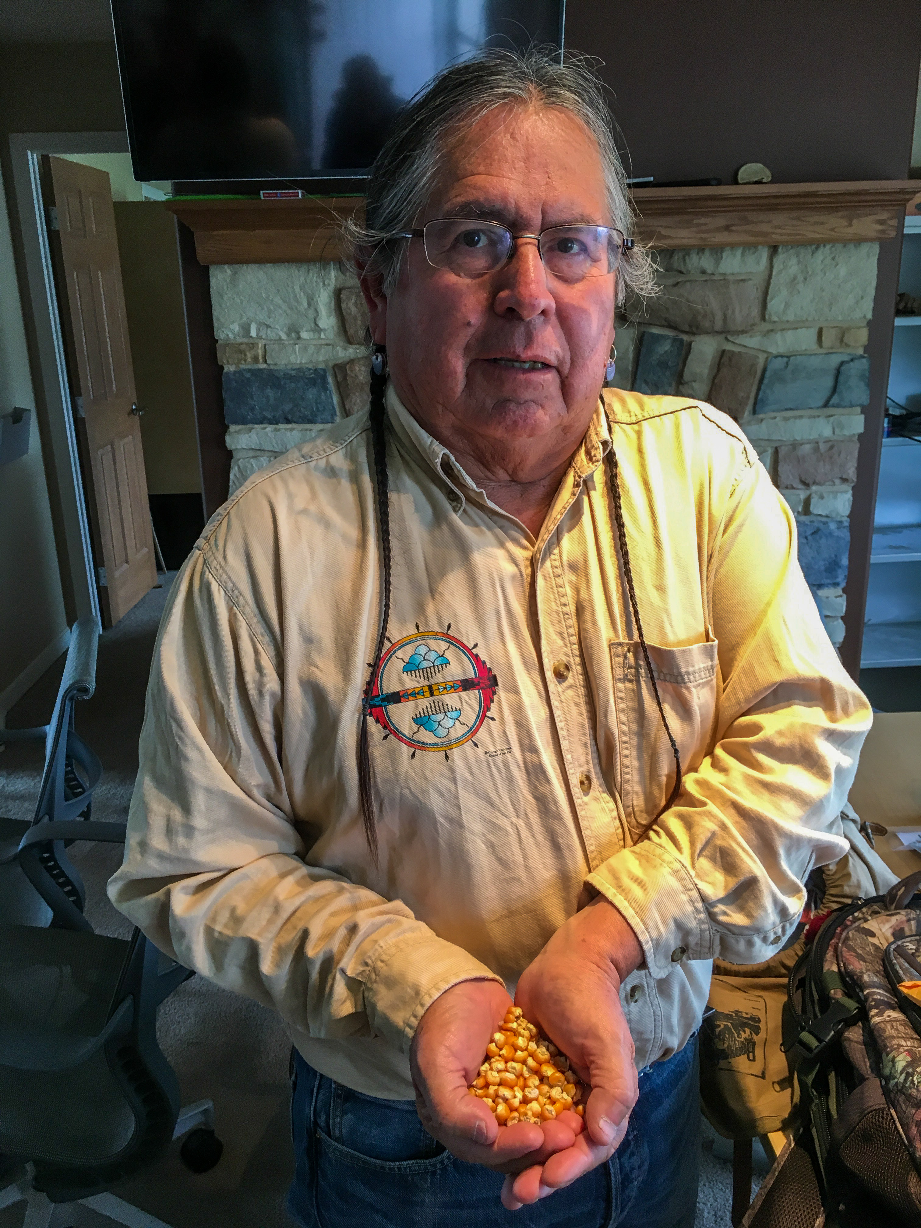Clayton holding some of the corn that he grew at his home in Tesuque PuebloAssortment of seeds that Rowen brought to share as part of the seed exchangeCollection of traditional Haudenosaunee seeds brought by Angela Ferguson