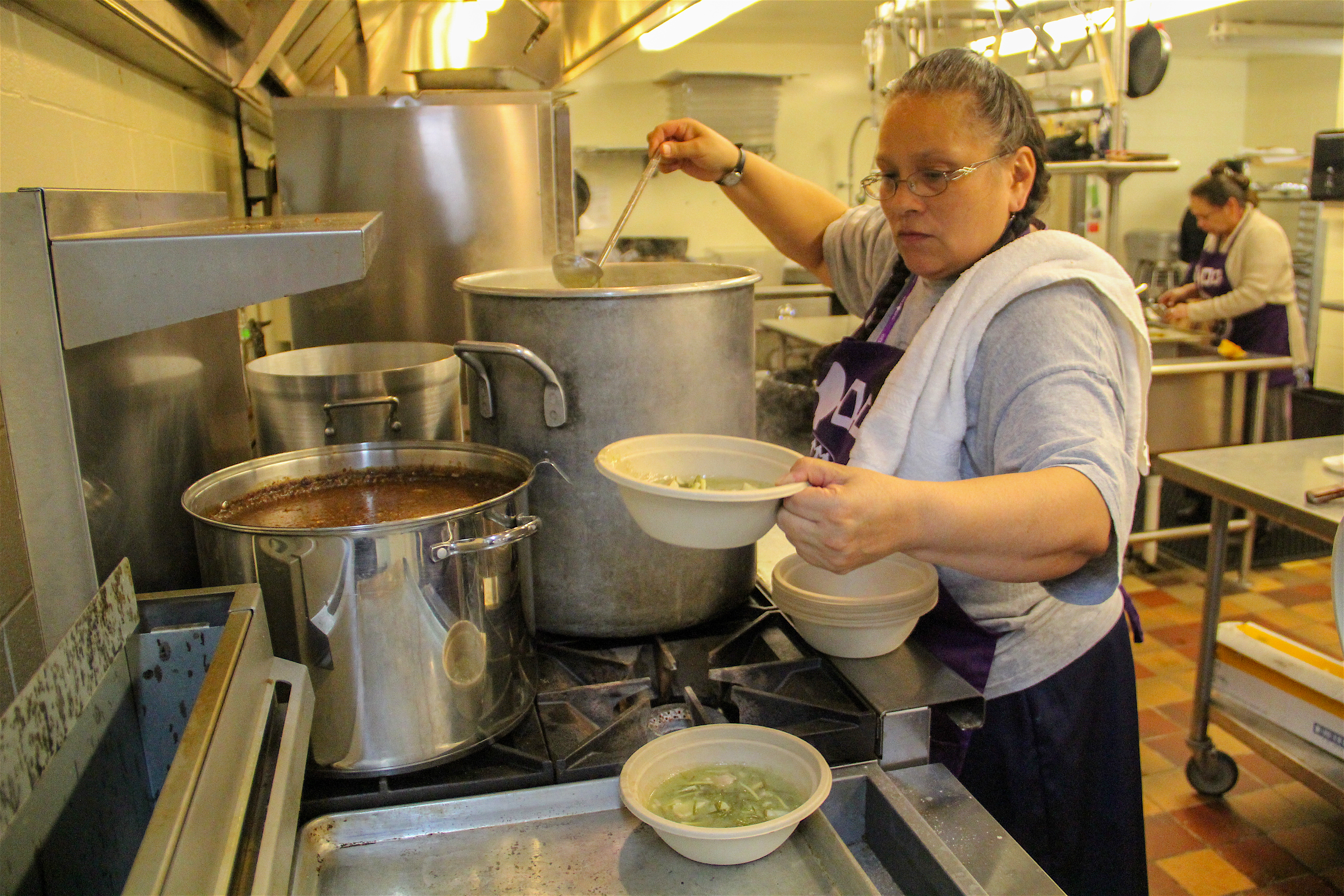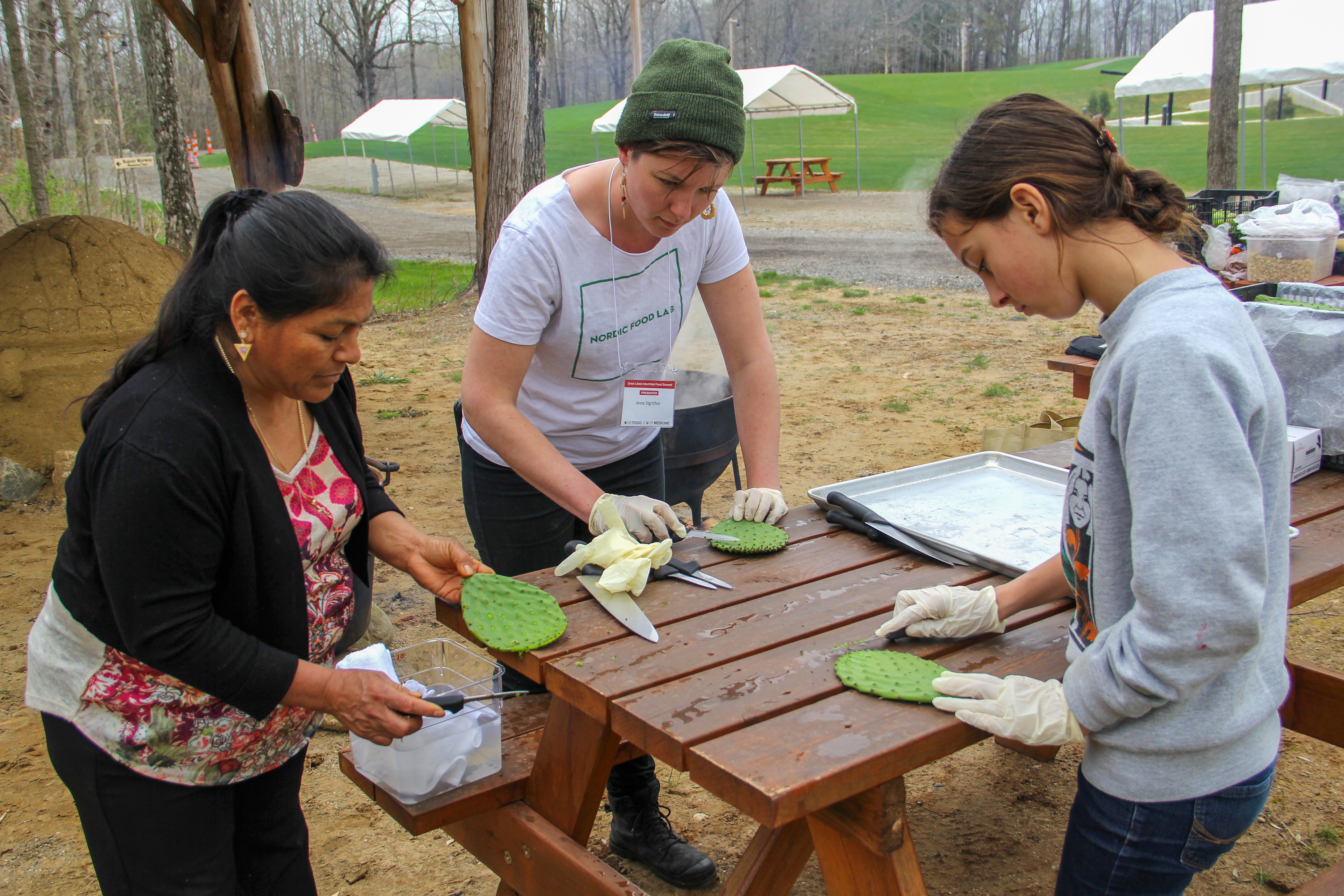 Alberta Salazar from Oaxaca demonstrates to Ana and Maizie how to clean nopalesAlberta and Chef Neftali Duran, also originally from Oaxaca, brought the flavors of their homeland to the Great Lakes Summit, preparing a posole that included local corn and buffalo, but also nopales and chilisNeftali stirring the posoletearing up yerba santa leaves to add to the soup