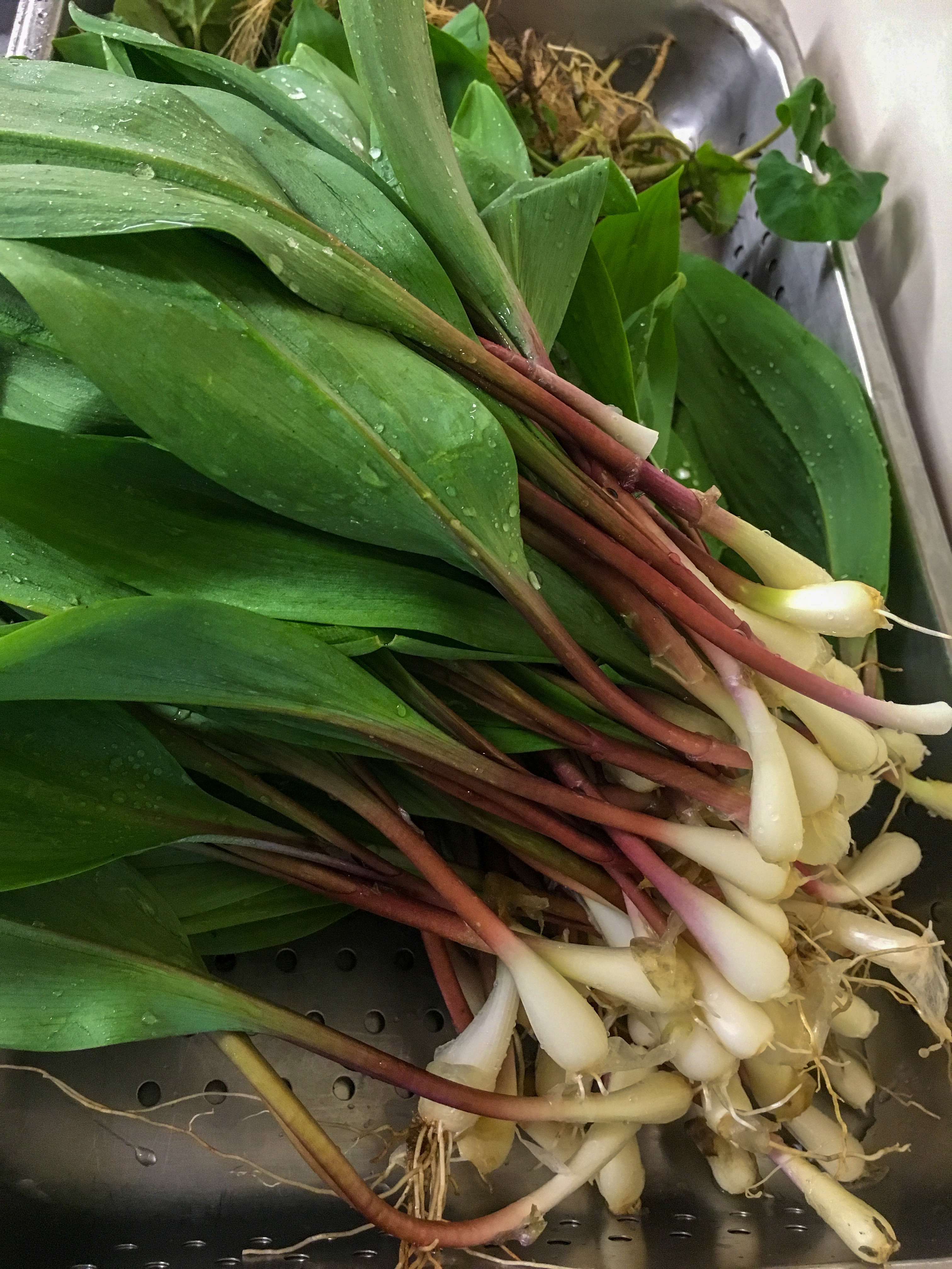 One of the favorite spring edibles are ramps– broad leaf onions with small bulbs that taste slightly oniony, slightly garlicky, but a little milder than both. Ramps are delicious in soups, chopped up finely and added to rice, and included in any other recipe you might add scallions too. The most responsible way to harvest ramps is to cut the bulbs above the roots, and to not take too many adjacent plants.