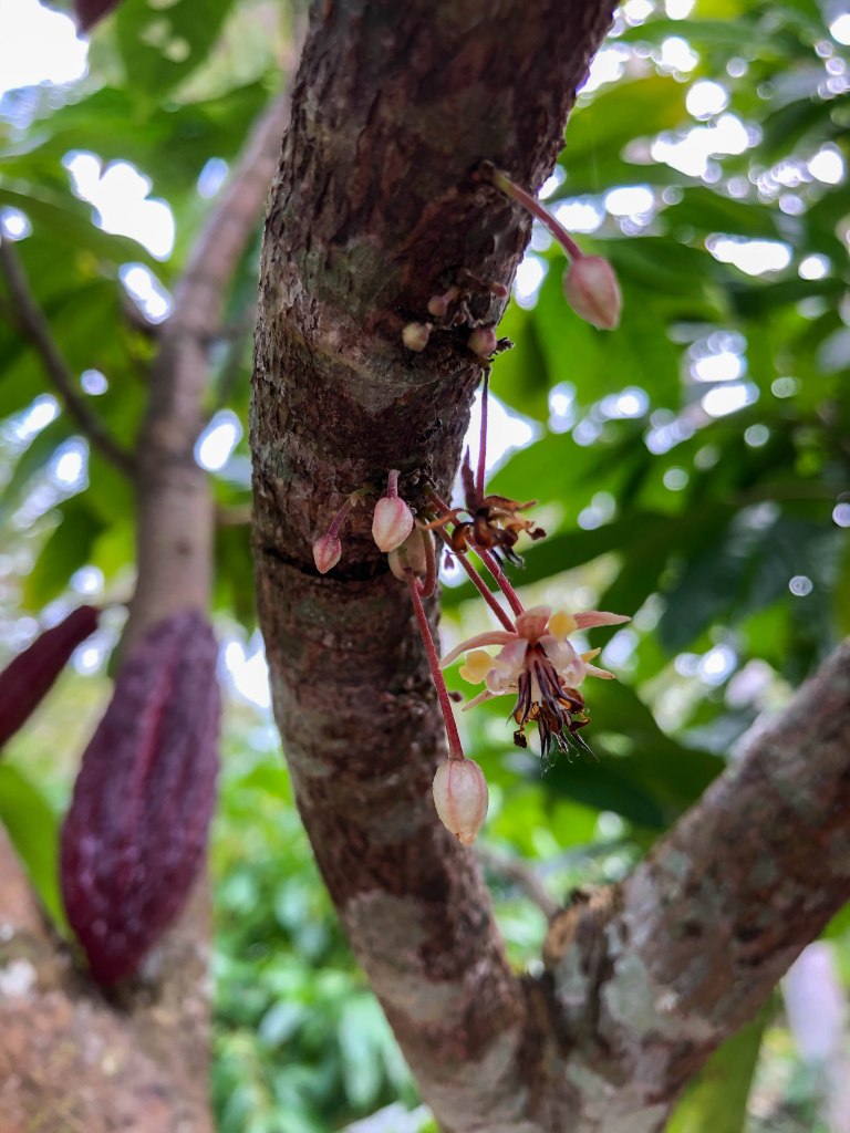 Cacao flowers which are only pollinated by a special tiny fly, the chocolate midge, in the Forcipomyia family