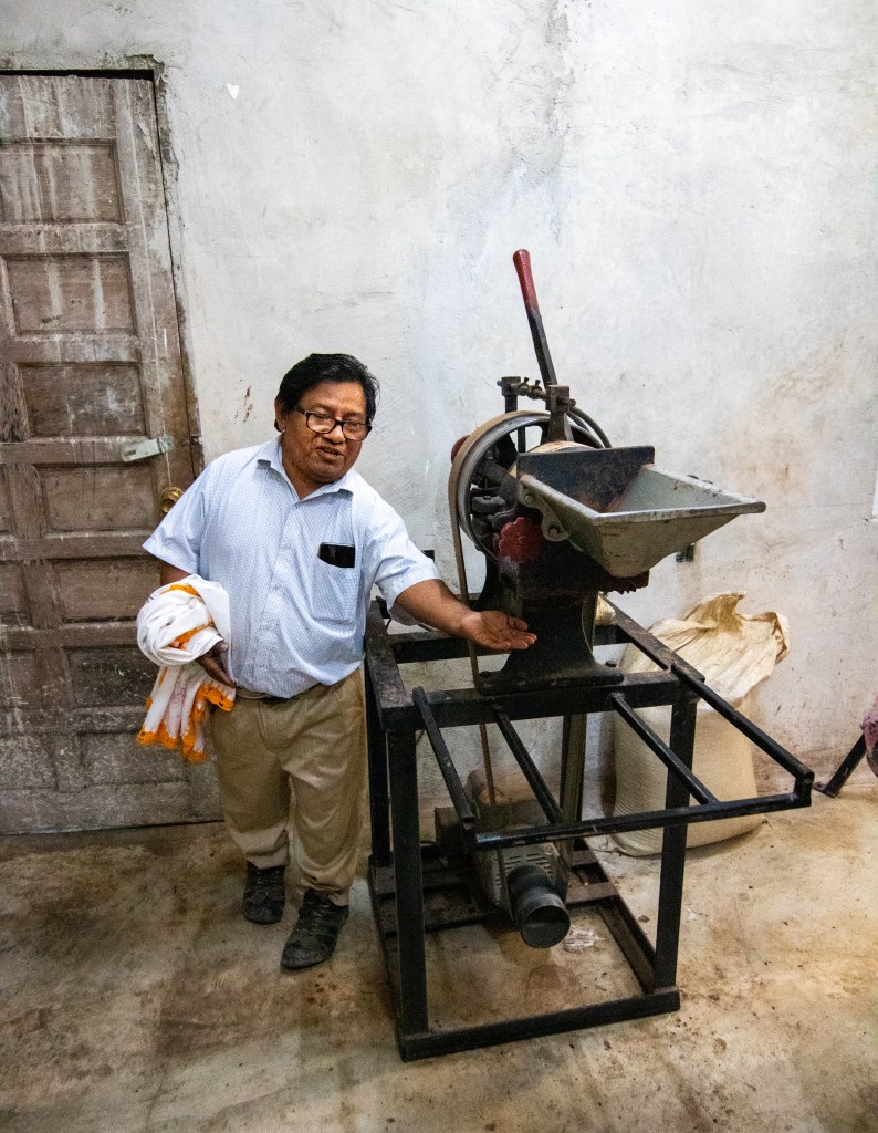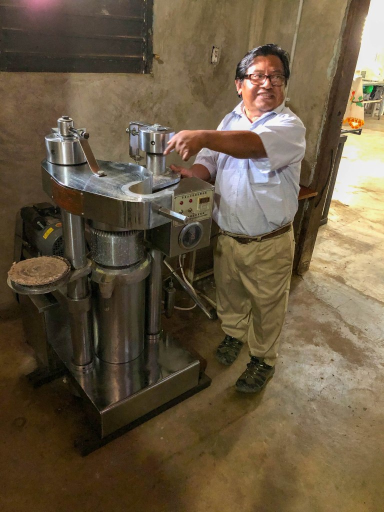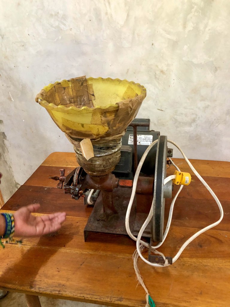 Julio then gave us a tour of the chocolate factory, comprised of a number of machines that he has helped to develop over the years. Cacao beans are roasted and then ground to fine paste. Oil is pressed from the paste, to make coco butter (this is also what white chocolate is, although Julio described that most commercial white chocolate is 10% coco butter and the rest is palm oil, paraffin wax, and flavoring). The reason why most commercial chocolate doesn’t melt at body temperature is because of paraffin wax. Because Julio doesn’t add wax to his product, he keeps his chocolate bars in the refrigerator. Julio sells the powdered roasted cocoa beans as bakers chocolate, or adds locally processed sugar to make hot coco. To make the chocolate bars, coco butter is added into the cacao paste, along with sugar and locally grown ingredients for flavorings (mint, orange, ginger, spicy pepper). The chocolate factory makes about 1500 bars every two weeks, which are hand wrapped by community members.