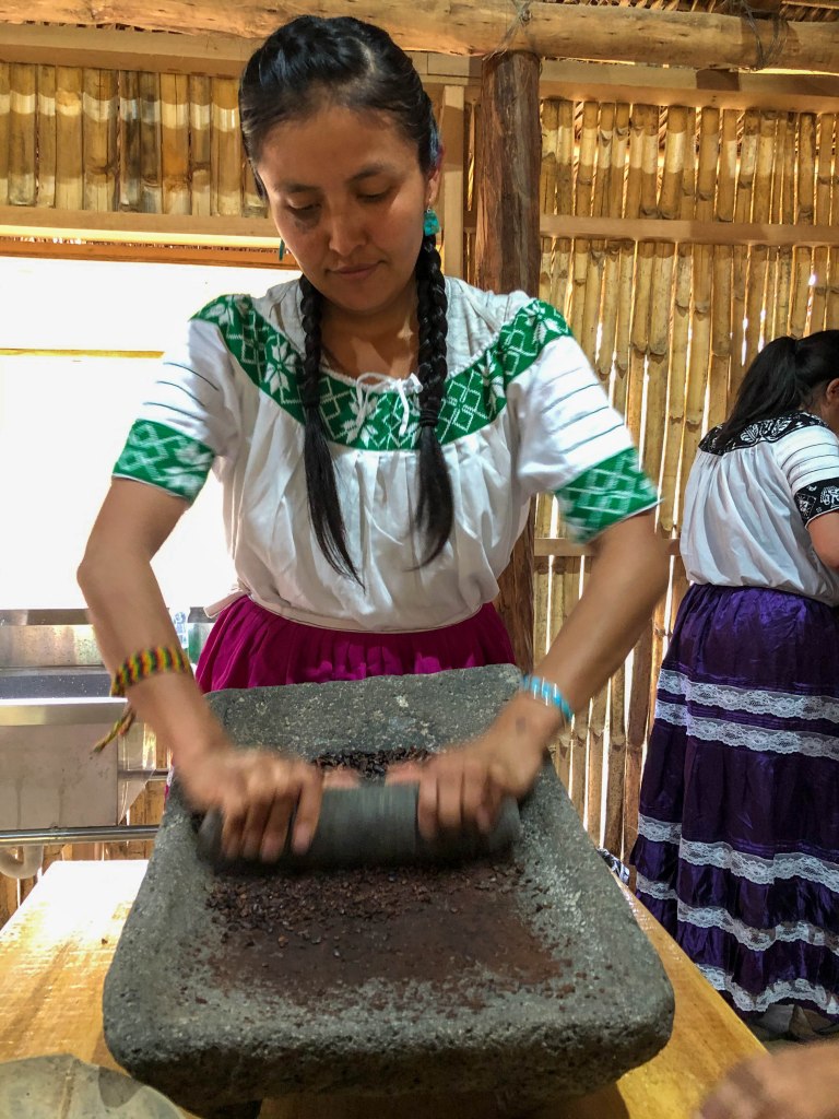 After the ripe pods are harvested and the beans removed, they are fermented in wooden boxes for 6 days to remove the slimy covering. The liquid produced through this process is kept to make chocolate wine. After six days of fermenting (any longer they taste like vinegar), they are pulled from the boxes and dried in the sun until all of the alcohol has evaporated off of them and their moisture content is about 5-6%. They can’t be dried in the direct sun or the outer portion of the seed will be burned and the wine will become trapped inside and turn to vinegar. So they have to be dried just right. They are then bagged up and shipped to chocolate manufacturers around the world, or kept here to make chocolate at the Che’il chocolate factory. These beans are then roasted. They used to roast them over a fire with a comal, but it took a great deal of time. Now that they are producing a greater amount of chocolate (roasting up to 500 lbs of beans in a day), they do 40% by hand over the fire (because they taste best this way), and the rest in a roaster, and then mix them together. It takes about an hour and a half to roast the beans over the fire– it’s a gentle process done with bare hands. As Julio explained, if it’s too hot on the comal to move the beans around with bare hands, it’s too hot for the beans. From there, the roasted beans are ground. This used to be done with a stone grinder (which Julio demonstrated for us), but now he also has a mechanical grinder (which still uses stone components because Julio insists that tastes better).