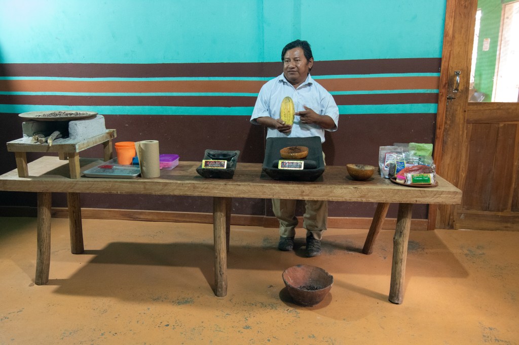Julio and his family created the Che’il Mayan Chocolate Factory in Maya Center Village in the Stann Creek District in southern Belize in 2010. “Che’il” is the Mopan Mayan word for “wild Mayan,” meant to be a play on the stereotype that people have about Mayans. Cacao has been an important fruit for the Mayas for centuries. As Julio’s brother Narcisso gave us a tour through their forrest of cacao trees, he explained that cacao grows wild from Mexico to Guatemala. Early Mayas thought chocolate was a heavenly food, brought to this planet by the gods. A bitter dark drink made from roasted cacao was only for noble people, and the beans were used as currency. When the Spanish invaded, they brought the cacao beans back to Europe with them, and it then traveled across the continent, becoming popular with Portuguese royalty. In Amsterdam they invented machines to crush the beans and extract the oil to create coco butter. They created chocolate bars by adding milk and sugar to the ground cacao. Up until the 1980’s Mayan farmers would sell their beans to Dutch companies, and companies like Hersheys. But then these companies started buying cheaper beans in west Africa, mass produced on commercialized farms. As Narcisso described it, in the late 1990s the Green and Black company came to Belize from England and started to pay a high price for the organically grown fair trade beans they were producing. This company has since been sold- first to Cadbury and then Kraft. To help small cacao farmers deal with this volatile market, the Saquis helped to form a cooperative to sell the beans to chocolate producers. Then in 2010 they developed their own operation to make chocolate products themselves, with all organic materials, all from products grown on their land or nearby. Today, the factory produces chocolate bars in twelve different flavors along with other delicacies such as coco powder, chocolate wine, cacao tea and cacao nibs. The Saquis also gives tours of their cacao farms and demonstrations of the chocolate-making process.