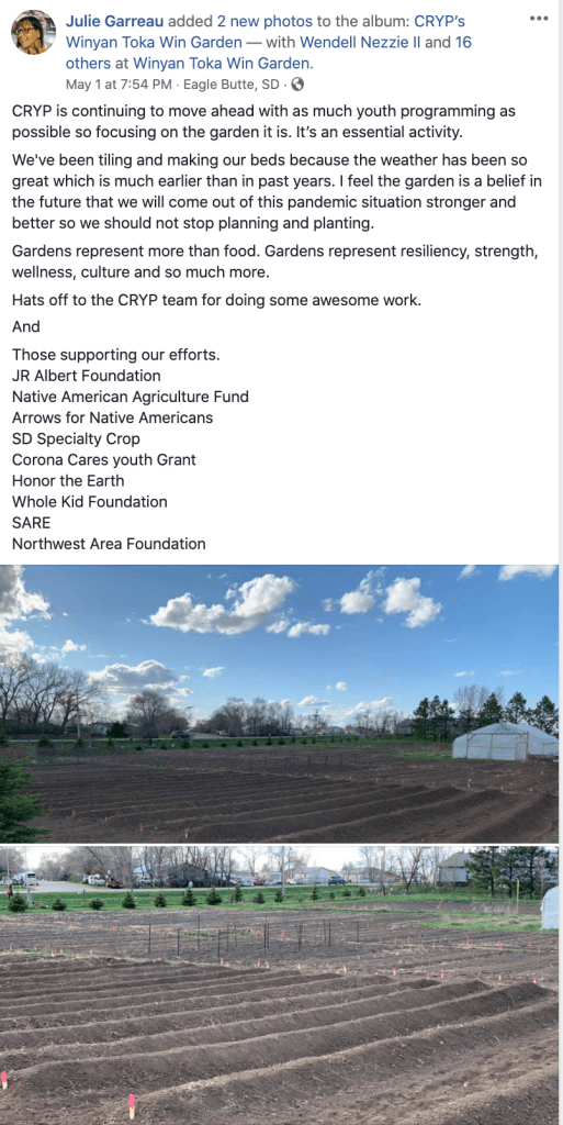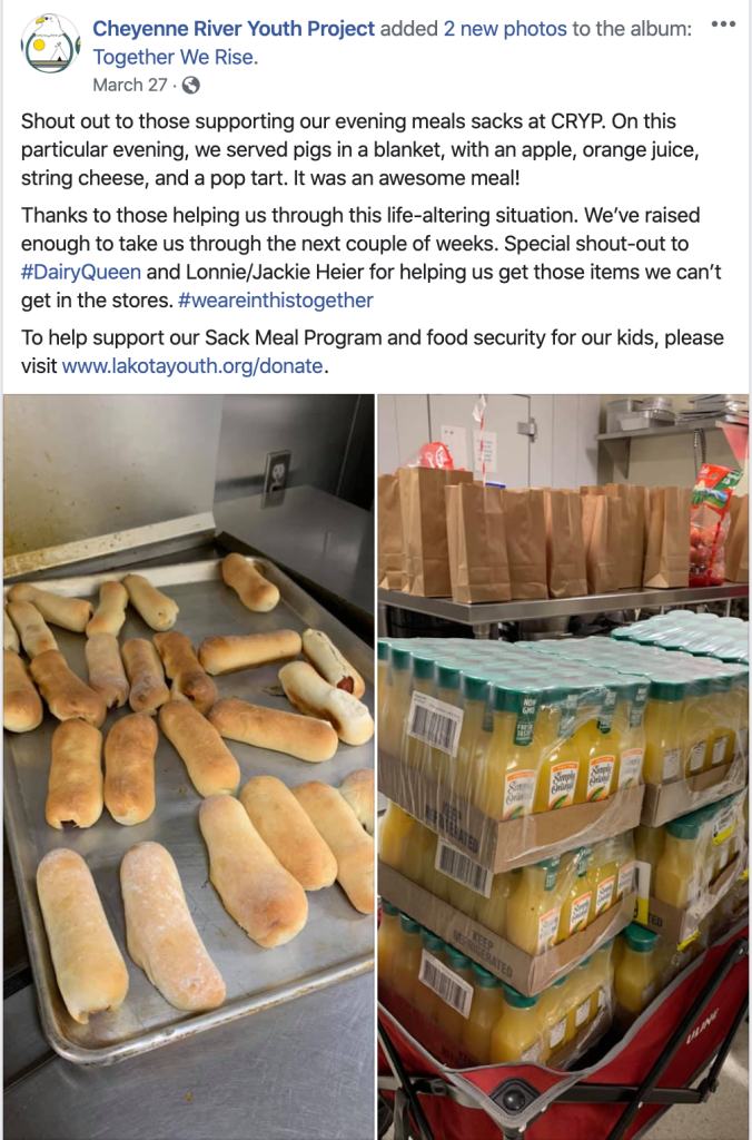 Programs have also had to come up with creative ways to keep youth fed. I spoke to Julie Garreau at the Cheyenne River Youth Project (CRYP) on the Cheyenne River reservation in South Dakota. CYRP has been providing services for youth in the community, including making sure they have access to sufficient healthy food, for the past 30 years. Generally the youth would receive breakfast and lunch in school, and then come to the Main (the CRYP youth center) for snacks and dinner. Now with schools closed, Julie recognizes that she may be providing the only solid meal that some kids are getting each day— which has grown from an average of 25-30 kids a day to 50. The Main has had to dramatically shift its activities, with employees working far apart from each other, and buying more packaged food that they won’t need to touch. Julie described how CYRP has been working on and thinking about food security and food sovereignty for a long time— they have a garden alongside the center where they grow produce in the summer that they sell and give away through their little farmers market, and which they can and dry to keep in their cafe and gift shops. They are now turning to these stores, but recognize that they cannot feed the whole reservation this way. Even so, despite the fact that their programming is geared towards youth ages 4-18, when the occasional mother has come in expressing distress about not having food at home, Julie has sent her away with packages of food. When I asked her what kind of lessons we can take away from this experience, she paused for a moment and reflected, “I hear a lot of people saying they can’t wait for things to go back to normal. We don’t want normal…I hope to hell nothing goes back to the way it was before, we need better.” Her hope is that the tribal leadership comes out of this experience really thinking hard about food systems on the reservation and how to better support projects like gardens that will help to make families more food secure. She has faith that her community will pull through: the tribe shut down its borders to outsiders and hired tribal members to serve as border agents, and she knows her community is resilient. “We are resilient people anyway, but I don’t think the systems are resilient. That’s the situation. We have proven we can make it through a lot but the systems we have created are not resilient.” The goal now is to create more resilient systems. Julie also recommends that in funding recover efforts that funders look not only to the short term, but also the midterm and the long term. To prevent things from going “back to the way it was before, because we need better.”[15] You can help support CRYP here.