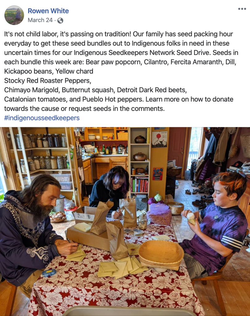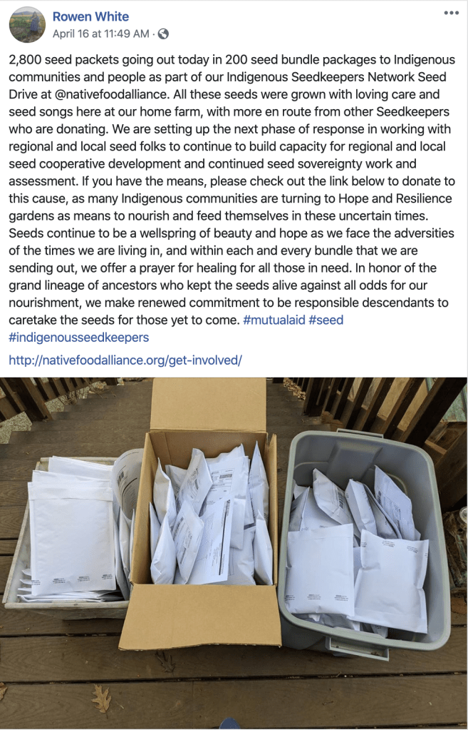 But this sudden turn to focus on providing food for community members to make up for the shortfalls in grocery stores has also shifted, even if temporarily, the mission of some tribal seed and garden programs. One community has been working for years to grow out and rematriate (send back to their original communities) a huge collection of Indigenous heirloom seed varieties. Some of that work has been put on hold as the farm crew works on distributing food to those in need and planting market crops for the upcoming season. Linda Black Elk, director of food sovereignty programs at United Tribes Technical College in North Dakota, described discussions in her program regarding how the focus in the coming season is going to shift away from research and into primarily food production. Others on a recent ISKN call, ranging from Ottawa and Saskatchewan down to New Mexico, also described a planned divergence from focusing on rare seeds to focusing on food crops.[18]