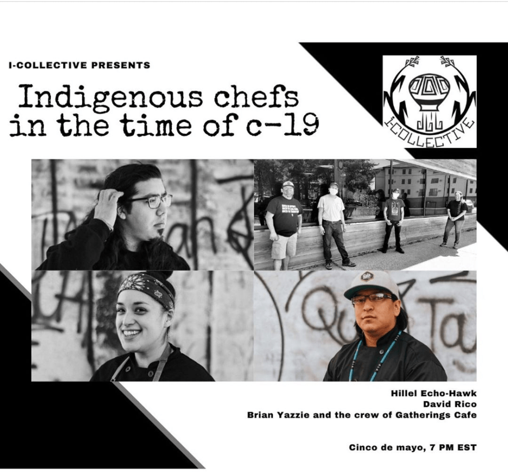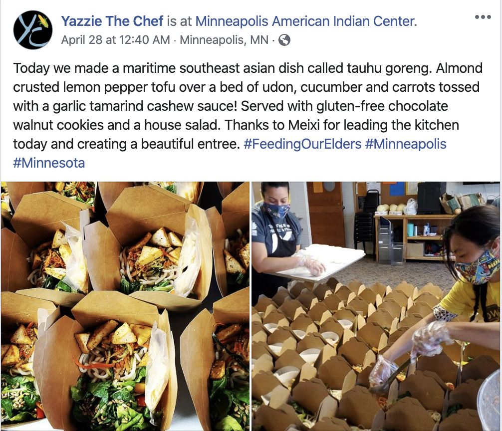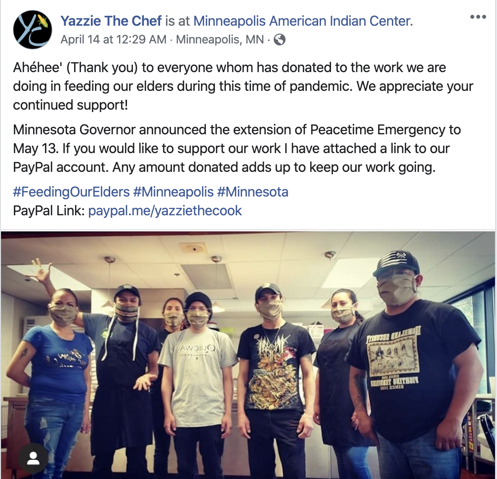 On another level, Native community members are working hard on the grassroots level to step in to fill the void left by canceled feeding programs that impacted the most food-insecure members of society—elders and youth. In Minneapolis, the American Indian Center had provided lunch for elders every week day afternoon, a program that was canceled with the onset of social distancing recommendations out of concern for the health of this vulnerable population. The Center’s Gatherings Café also closed to the public at the same time. In addition, local Native chef Brian Yazzie (Navajo) found himself without any of the catering and educational programming jobs that he was accustomed to. Brian partnered with Ben Shendo (Pueblo) and Linus Yellowhorse (Tohono O’odham) in the café, along with other community volunteers like baker Vanessa Casillas (Hochunk) to put together meals for the elders, using supplies in the café as well as goods donated by food producers and restaurants across the state and donations from across the country. This ad hoc crew prepares about a hundred meals a day for elders, focusing on as many healthy traditional foods as they are able, which are then delivered across the Twin Cities.[13]